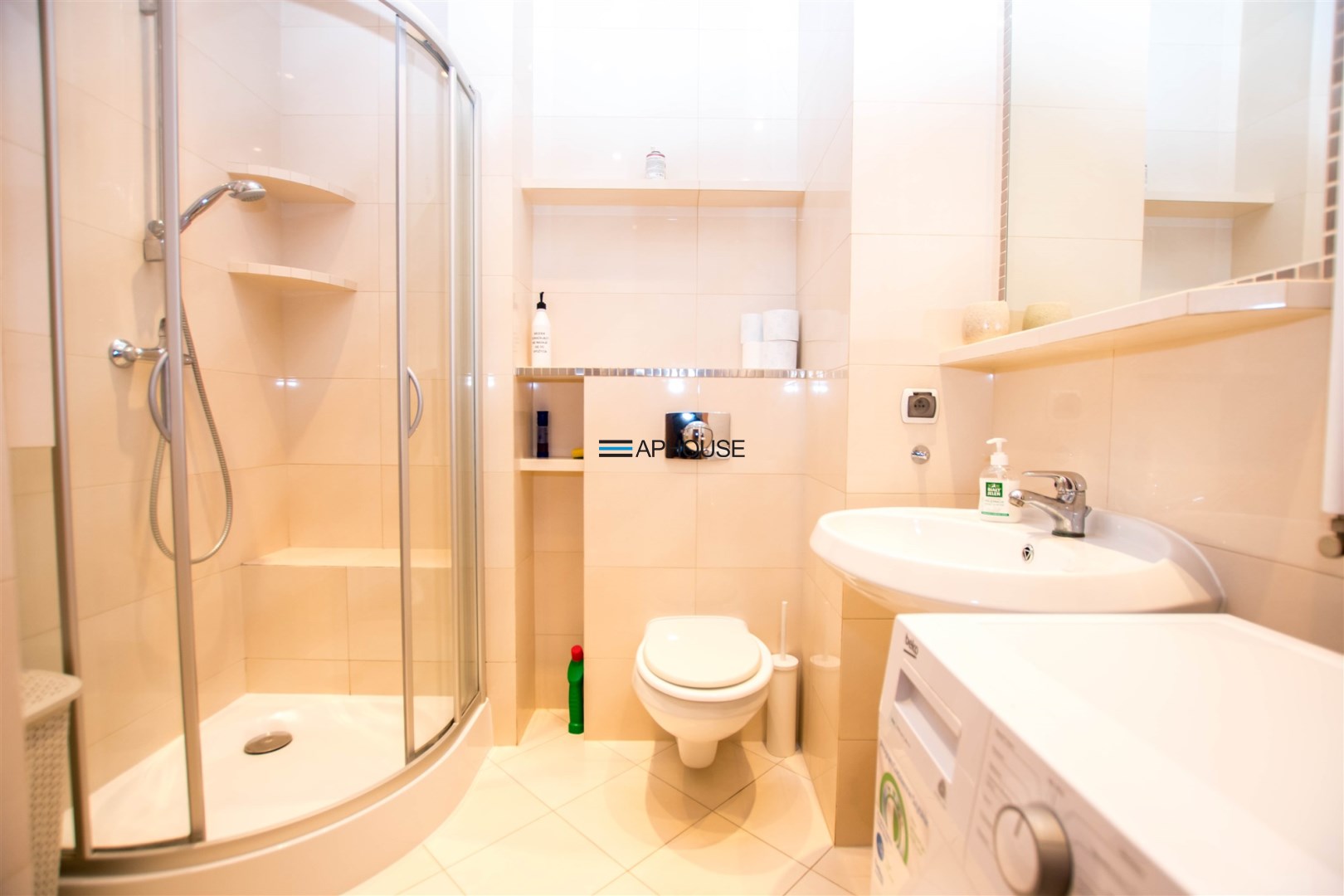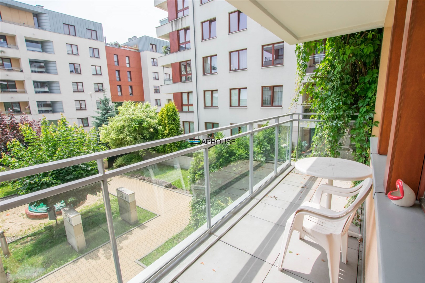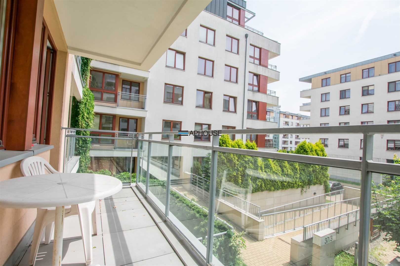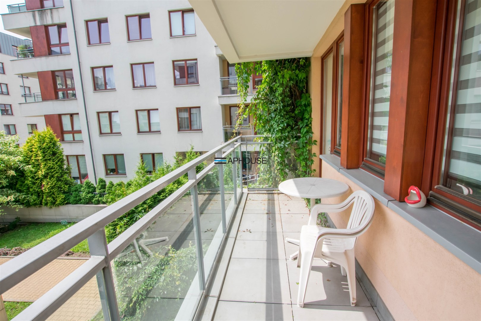 The apartment is very bright and functional. The living room has a large sofa with a coffee table, TV cabinet with a TV, a table with 4 chairs. The kitchen has a fridge, oven, hob, microwave, sink and extractor hood. The bedroom has a large wardrobe, a double bed and a chest of drawers. There is an additional utility wardrobe in the hall. The bathroom has a washing machine, shower, toilet. The apartment includes a large balcony overlooking the greenery next to the building.