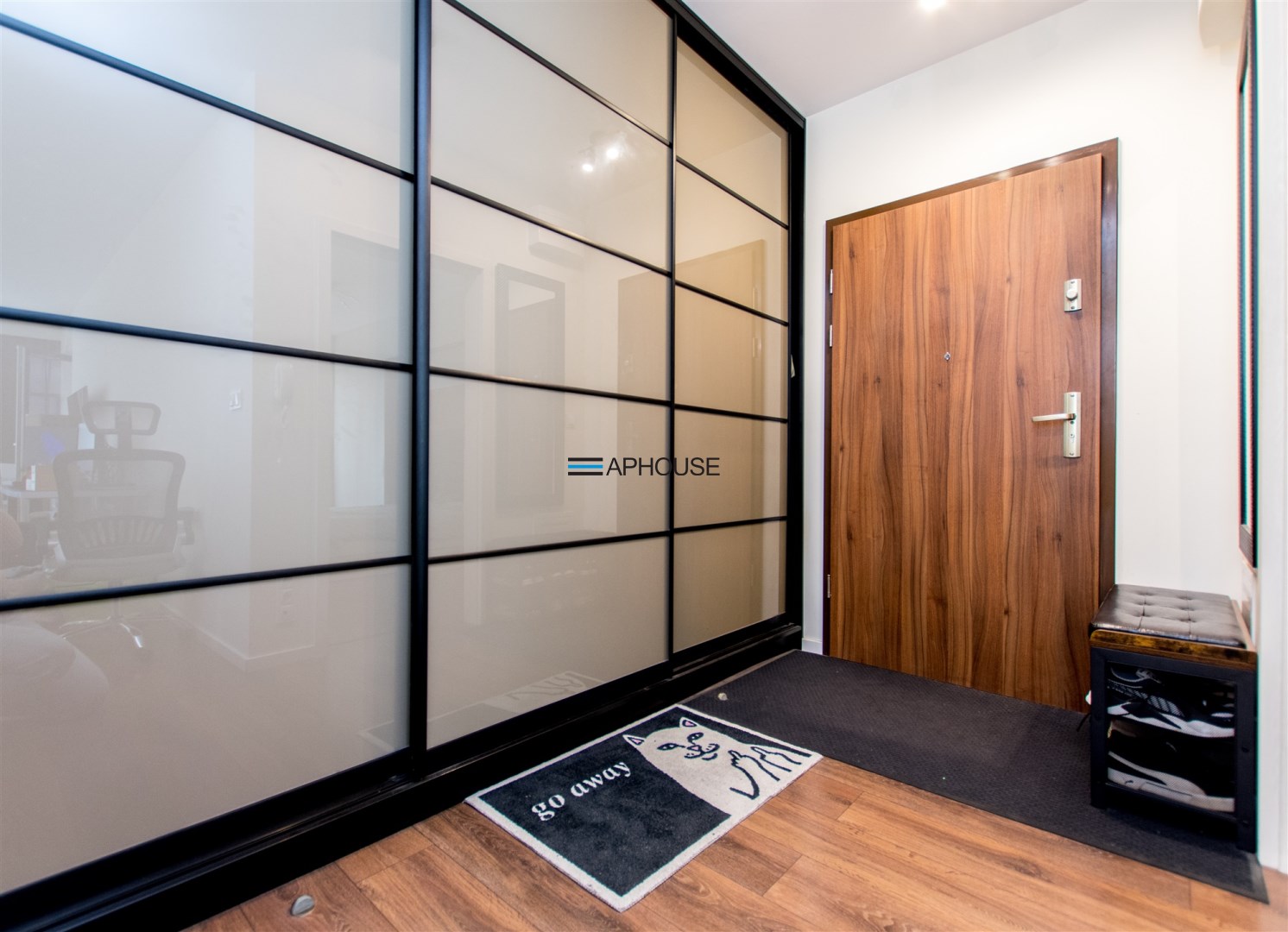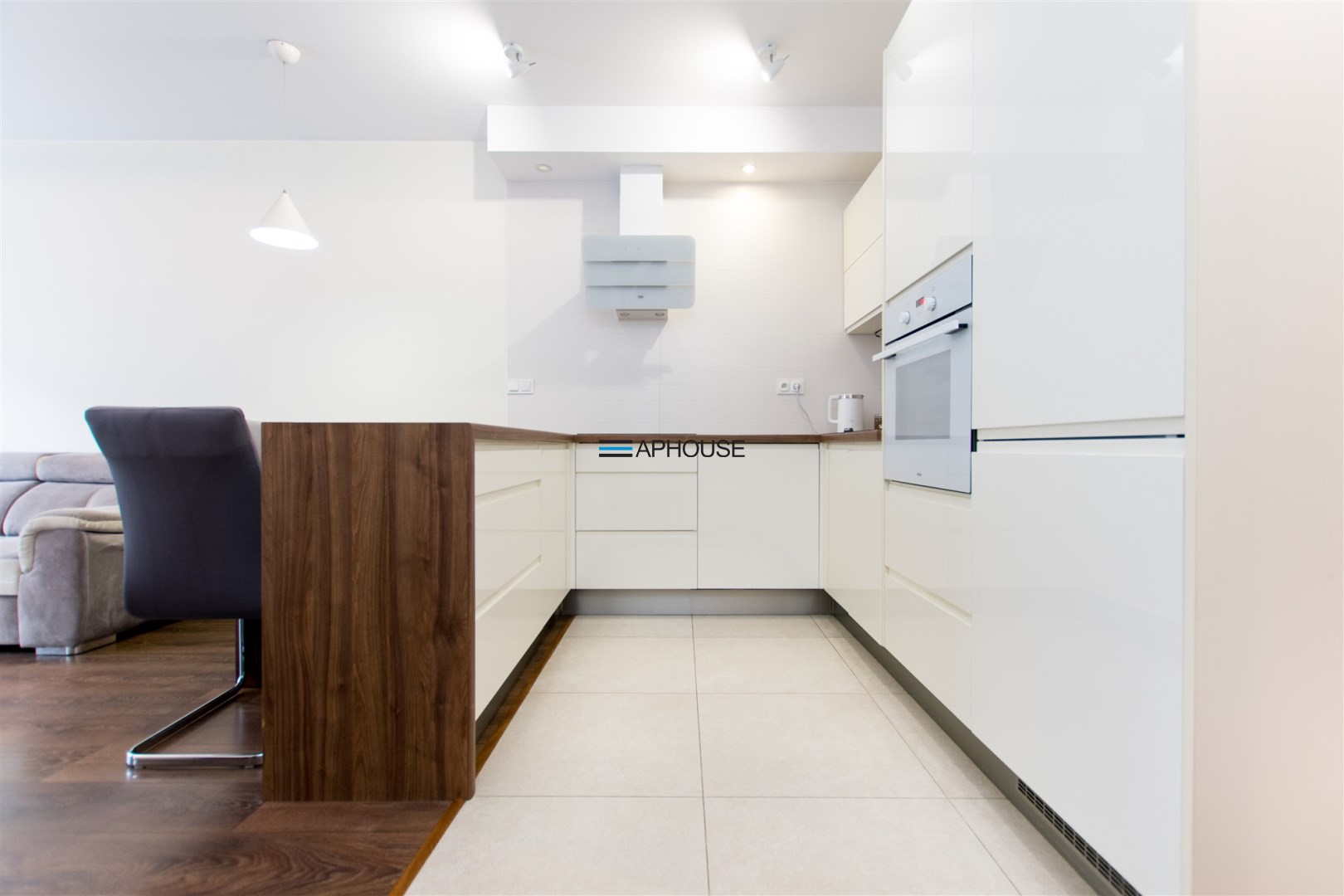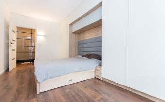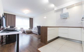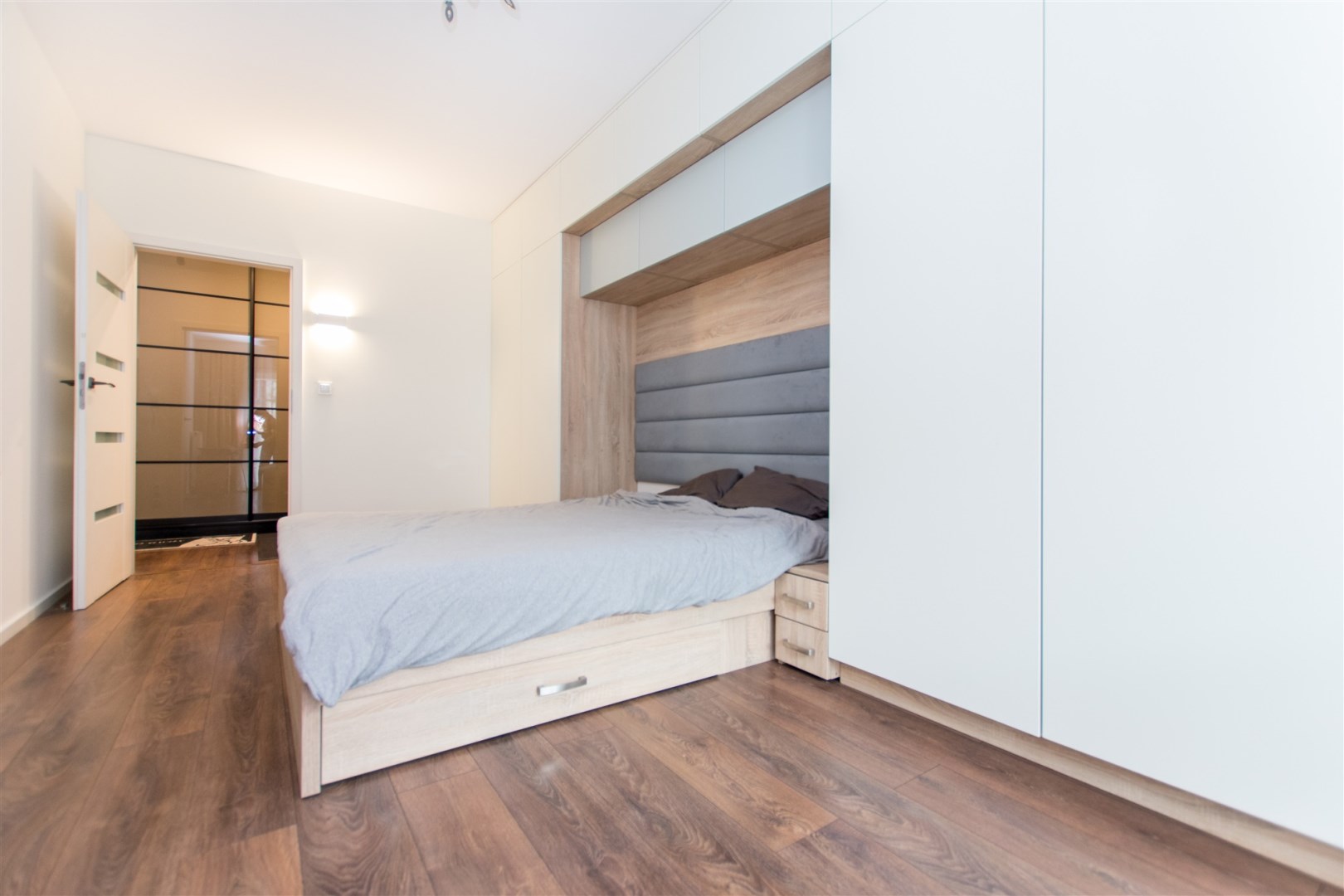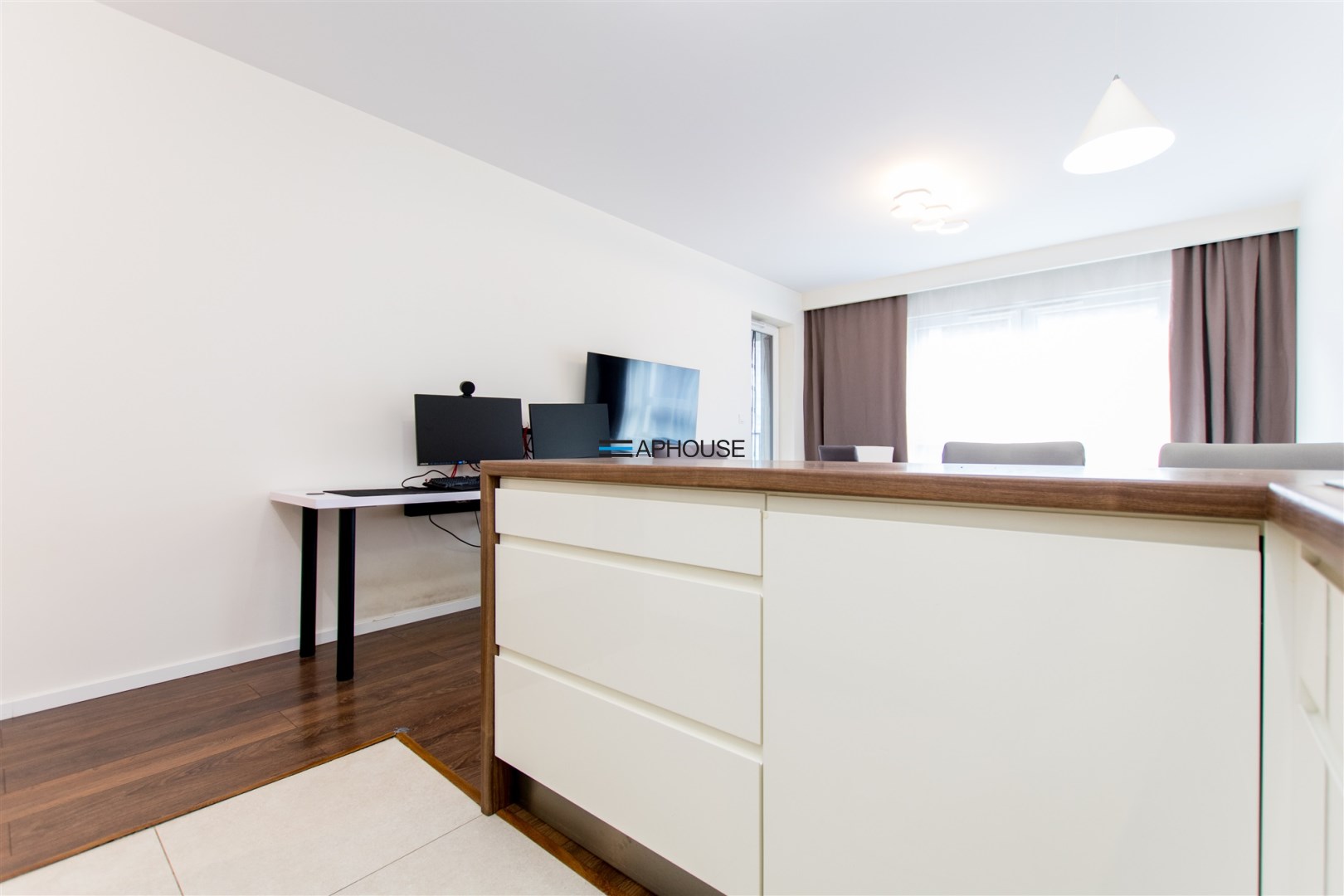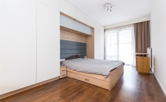 The interior of this property has been thoughtfully designed with attention to detail. The kitchenette is equipped with high-quality appliances: a large refrigerator with a freezer, a hob, an oven, a microwave, a dishwasher, and a range hood. The bedroom features a double bed with a 160x200cm mattress. A generous storage space enhances comfort.