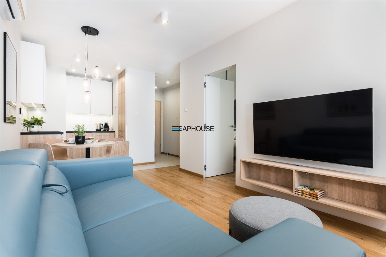 The living room has a comfortable fold-out corner sofa, a coffee table, a table with chairs, a TV cabinet and a TV set. Additionally, a separate bedroom with a double bed and a wardrobe