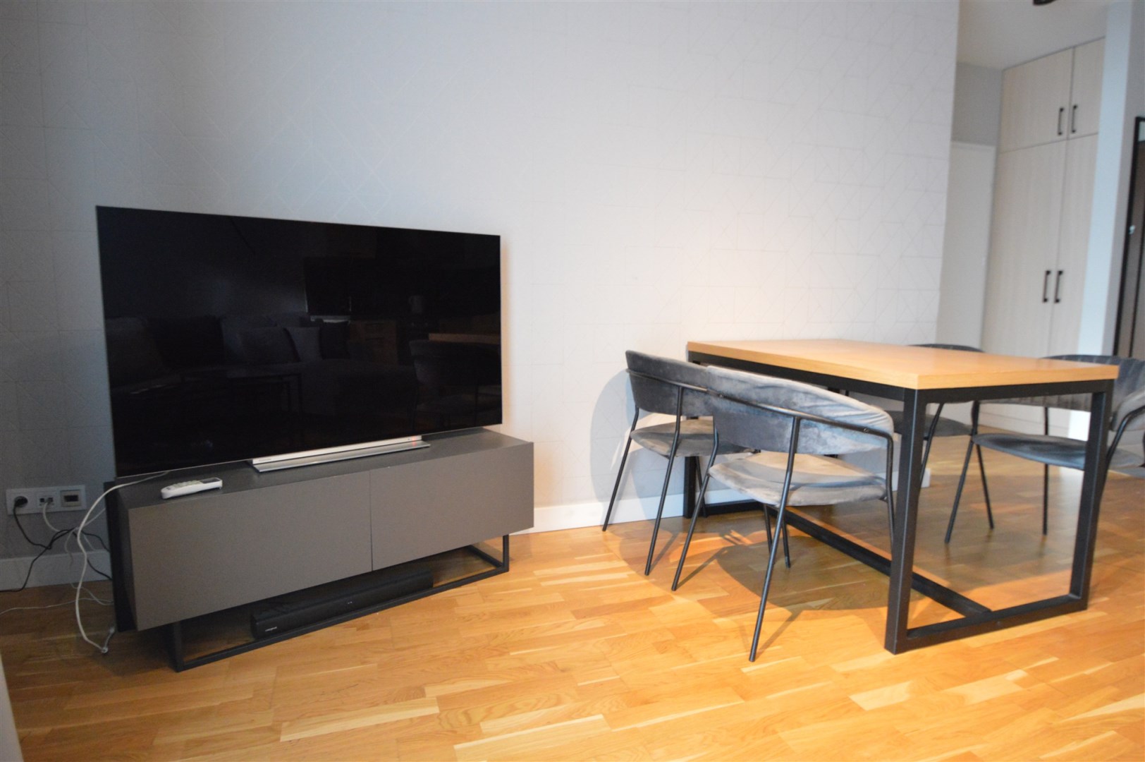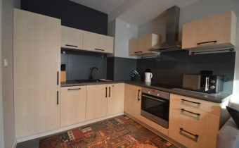 The apartment is fully furnished and equipped. Living room combined with kitchenette. In the living room sofa bed, coffee table, TV. Fully equipped kitchenette (fridge with freezer, dishwasher, hob, oven, dining table with chairs, double bedroom and wardrobe.