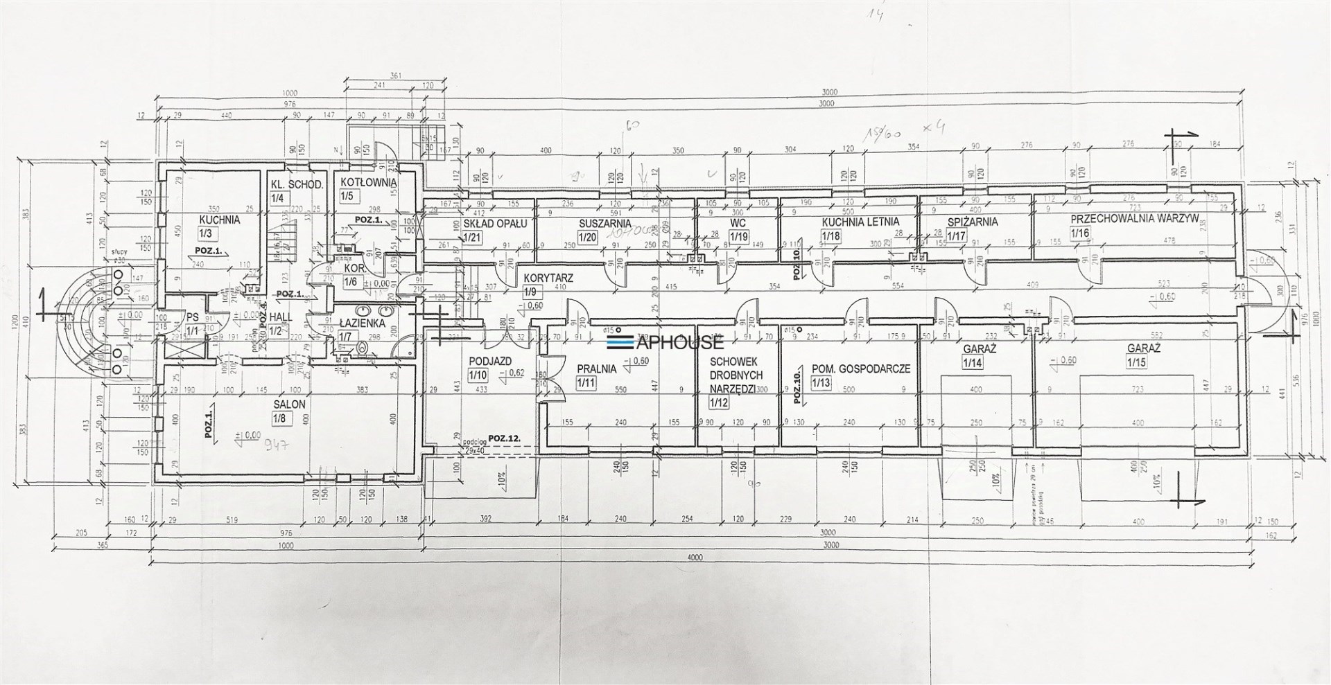 Parter: salon, kuchnia, łazienka, hol, klatka schodowa, korytarz, kotłownia;