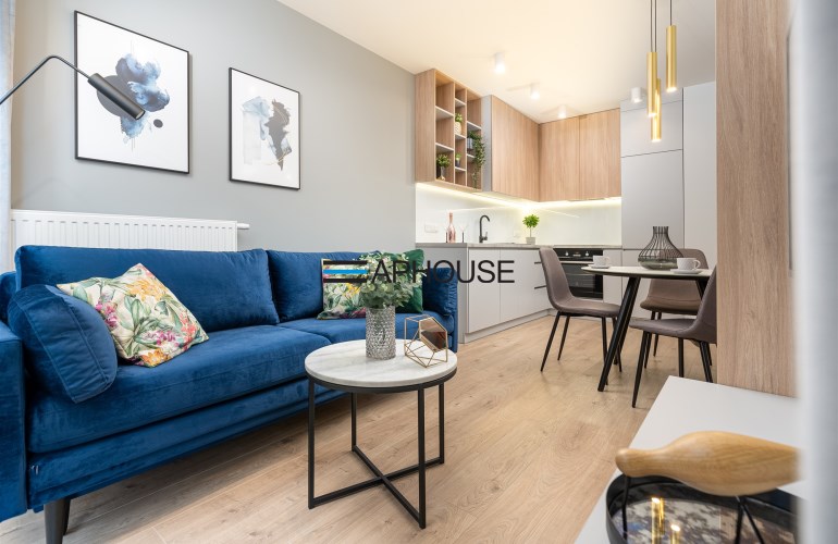 Mieszkanie ma powierzchnię 48 m2 i mieści się na 5 piętrze. W pełni umeblowane i wyposażone pod okiem architekta z dbałością o każdy szczegół aranżacji. W jednej z sypialni podwójne łóżko, szafa i półki.