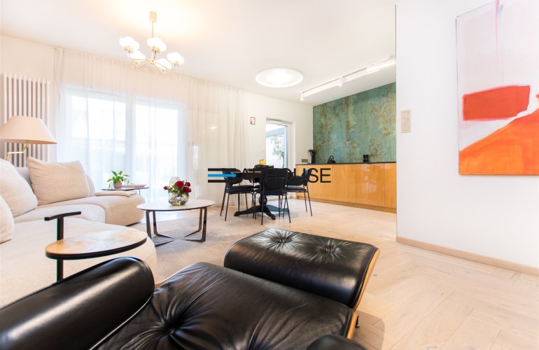 - przestronny salon z aneksem kuchennym i stołem jadalnianym,