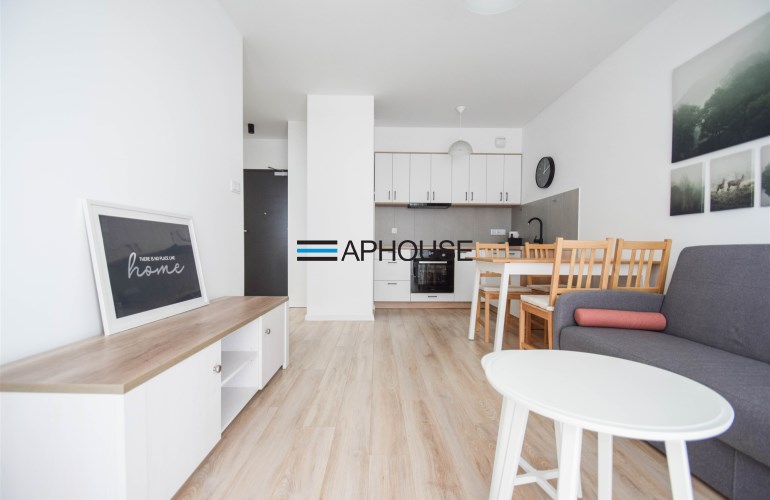 Salon wyposażony został w wygodna kanapę, stolik kawowy oraz meble RTV.W wyposażeniu kuchennym znajdują się meble w zabudowie, lodówka z zamrażalnikiem, okap, płyta indykacyjna, zmywarka i piekarnik. Z salonu wychodzimy na balkon. W sypialni znajduje się łóżko oraz pojemna szafa. Łazienka została wyposażona w kabinę prysznicową, umywalkę, WC, lustro, szafkę oraz pralkę. Mieszkanie jest bardzo jasne i przestronne, posiada wygodny i funkcjonalny rozkład.