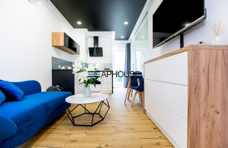 Jasny salon połączony z aneksem kuchennym, sofa, stolik kawowy, smart TV, stół z krzesłami. Kuchnia w pełni wyposażona (zmywarka, podblatowa lodówka z zamrażalnikiem, płyta indukcyjna, piekarnik z funkcją mikrofali, zastawa stołowa i przybory kuchenne). W sypialni dwuosobowe łóżko i fotel. Nowoczesna łazienka z prysznicem i pralką. Plusem są dwie jednostki klimatyzacji (w salonie i w sypialni) jak i wyposażenie dodatkowe (odkurzacz, żelazko, deska do prasowania, suszarka stojąca, pościel).