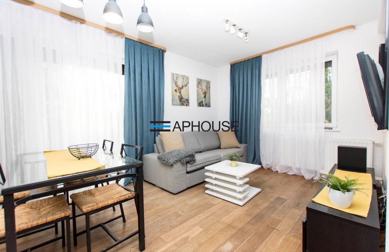 Mieszkanie jest bardzo jasne i funkcjonalne. W salonie znajduje się sofa, stolik kawowy, tv z zestawem audio, stół i krzesła. Kuchnia wypsoażona w sprzęty: lodówko-zamrażarka, zmywarka, piekarnik, płyta, zlew, okap, wyspa kuchenna. W sypialni I jest łóżko dwuosobowe + szafa, w sypialni II jest łóżko dwuosobowe + biurko z krzesłem, w sypialni III jest łóżko pojedyncze, szafa i biurko. W łazience wanna z szybą prysznicową, 2 umywalki, toaleta, pralka. W przedpokoju bardzo duża szafa. W ogrodzie jest zestaw wypoczynkowy i duży parasol rozkładany. W nieruchomości jest drewniana podłoga, a we wszystkich oknach są rolety zewnętrzne.