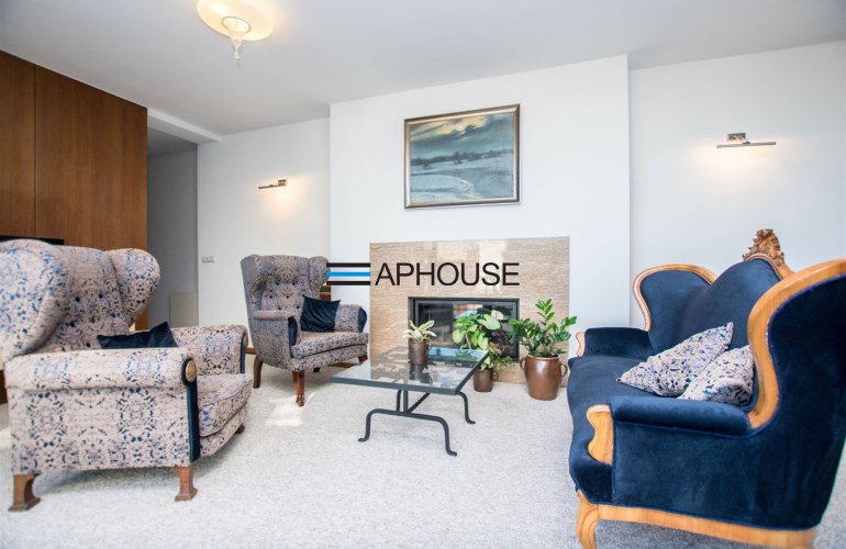 Przestronny salon z kominkiem, którego jedna ze ścian jest przeszklona - przesuwne drzwi z widokiem na zielony ogród, drugi salon znajduje się na drugim poziomie z którego wyjście jest na taras. Dwie sypialnie znajdują się na pierwszym poziomie a na drugi trzecia która może służyć np jako biuro.