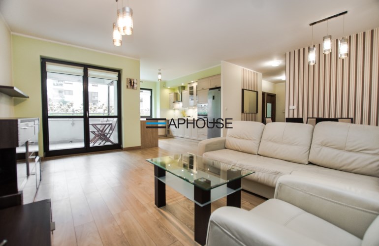 Salon wyposażony dużą sofę, Telewizor, zabudowę szaf, stół z krzesłami oraz wyjście na balkon. Kuchnia wyposażona w zabudowę kuchenną z dużą ilością miejsca do przechowywania, sprzęty takie jak lodówko-zamrażarka, piekarnik, zmywarka, płyta indukcyjna, okap. Całe pomieszczenie jasne i przestronne. Sypialnia wyposażona w duże 2-osobowe łóżko szafki nocne oraz szafę. Łazienka z kabiną prysznicową wyposażona w umywalkę z szafką, duże lustro oraz WC. Pokój jest nieumeblowany - do własnej aranżacji. W przedpokoju komoda. Dużym atutem mieszkania jest garderoba.