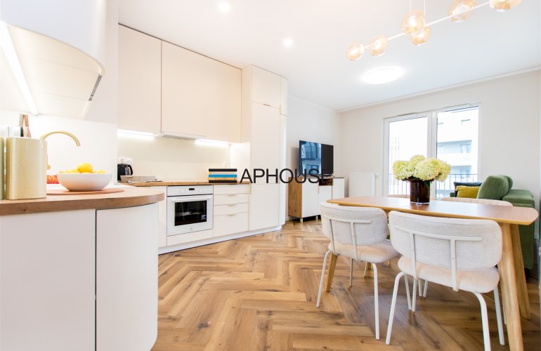 W pełni wyposażony aneks kuchenny obejmuje: dużą lodówkę z zamrażarką, płytę indukcyjną, piekarnik, zmywarkę oraz okap. W salonie rozkładana sofa z funkcją spania i TV oraz strefa jadalniana. Komfort użytkowania podnoszą dwie łazienki, pralko-suszarka oraz duża ilość miejsca na przechowywanie.