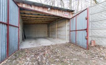 Wylewka na podłodze lub podłoże z kostki brukowej. Garaże zadaszone i orynnowane, posiadają dostęp do energii elektrycznej. Dach w konstrukcji drewnianej, kryty blachą.