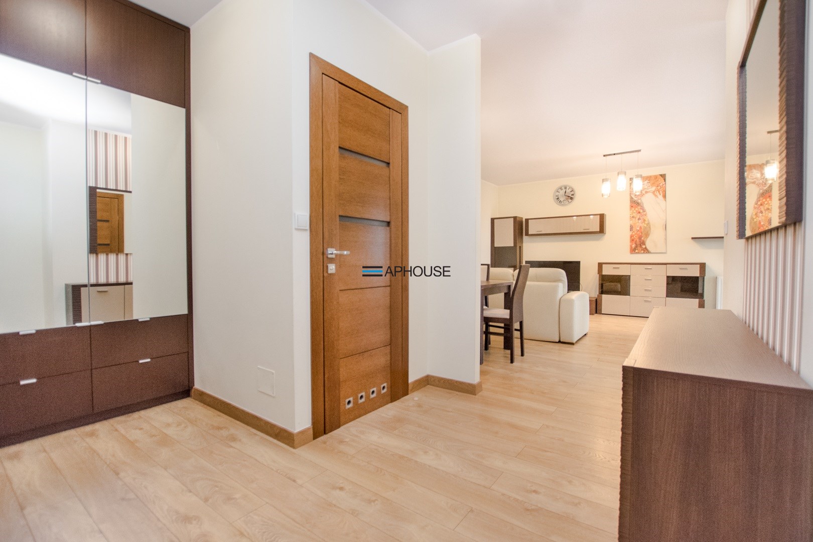 Salon wyposażony dużą sofę, Telewizor, zabudowę szaf, stół z krzesłami oraz wyjście na balkon. Kuchnia wyposażona w zabudowę kuchenną z dużą ilością miejsca do przechowywania, sprzęty takie jak lodówko-zamrażarka, piekarnik, zmywarka, płyta indukcyjna, okap. Całe pomieszczenie jasne i przestronne. Sypialnia wyposażona w duże 2-osobowe łóżko szafki nocne oraz szafę. Łazienka z kabiną prysznicową wyposażona w umywalkę z szafką, duże lustro oraz WC. Pokój jest nieumeblowany - do własnej aranżacji. W przedpokoju komoda. Dużym atutem mieszkania jest garderoba.