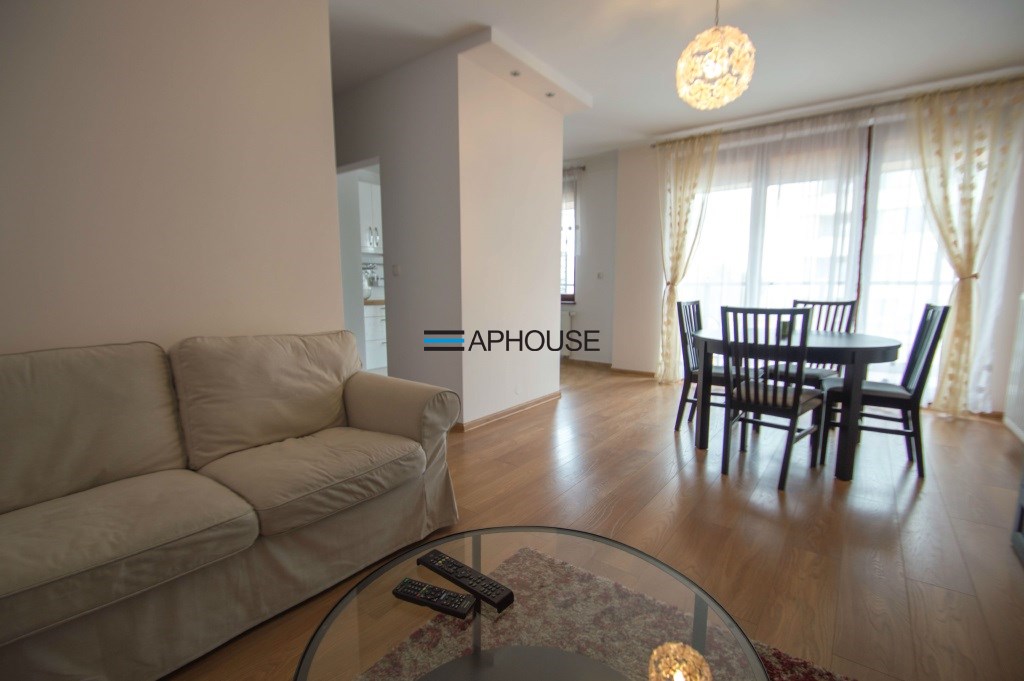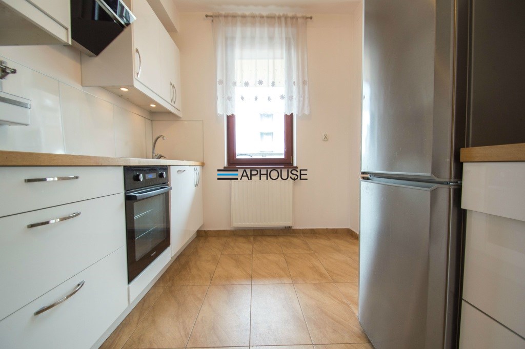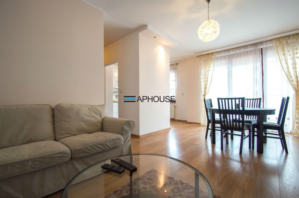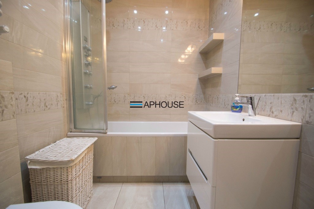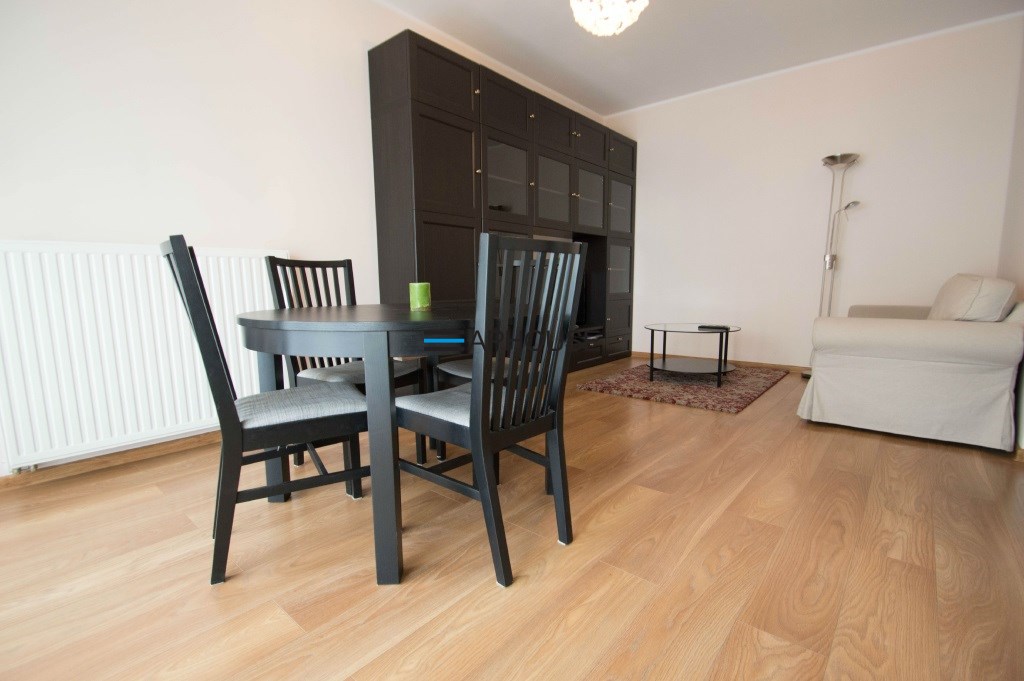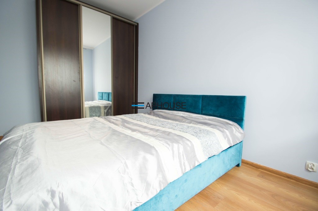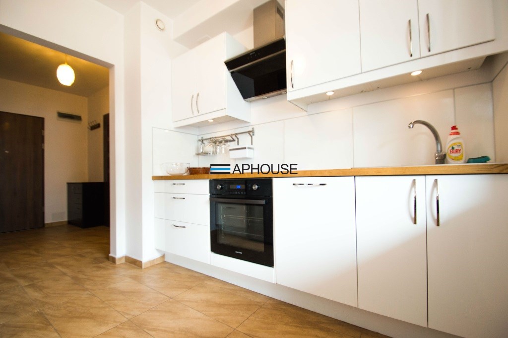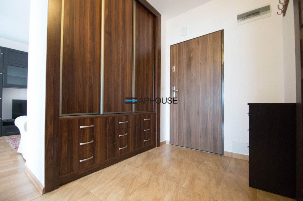 Salon wyposażony został w wygodna kanapę, stolik kawowy i duży telewizor. W wyposażeniu kuchennym znajdują się meble w zabudowie, lodówka z zamrażalnikiem, okap, płyta indykacyjna i piekarnik. W części jadalnianej znajduje się stół z krzesłami. Z salonu wychodzimy na balkon. W sypialni znajduje się łóżko oraz pojemna szafa. Łazienka została wyposażona w wannę z opcją prysznica, umywalkę, wc, szafki z lustrem oraz pralkę. W przedpokoju pojemna szafa w zabudowie, komoda i wieszaki. Mieszkanie jest bardzo jasne i przestronne, posiada wygodny i funkcjonalny rozkład.