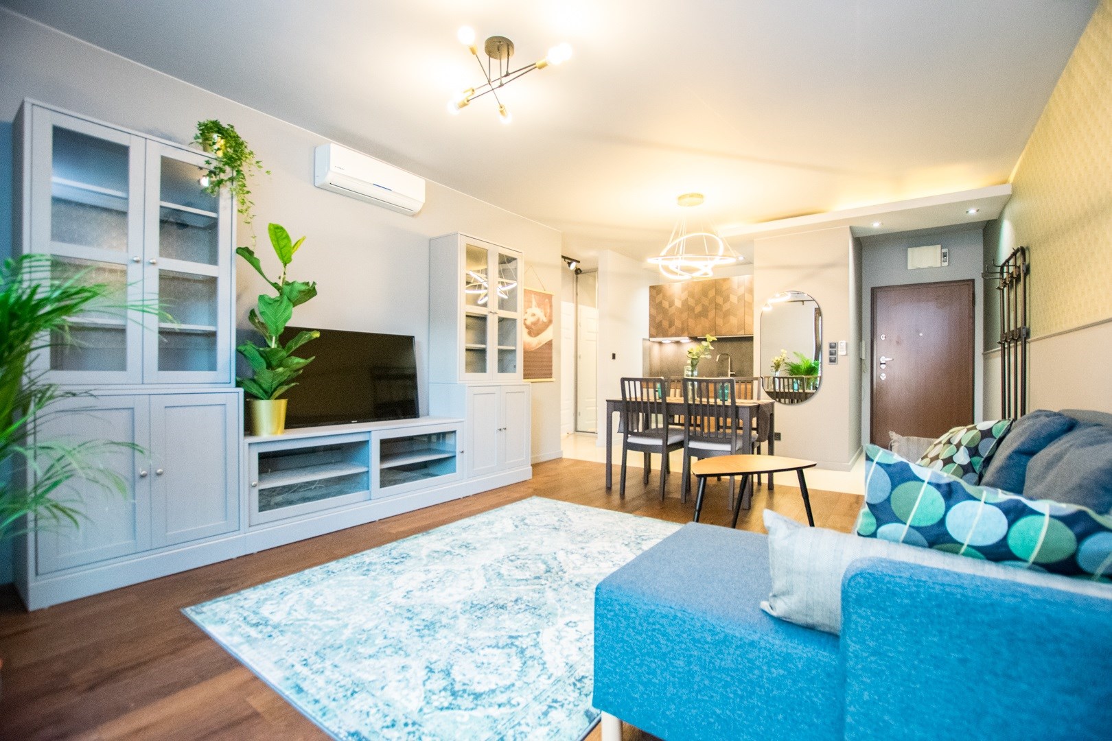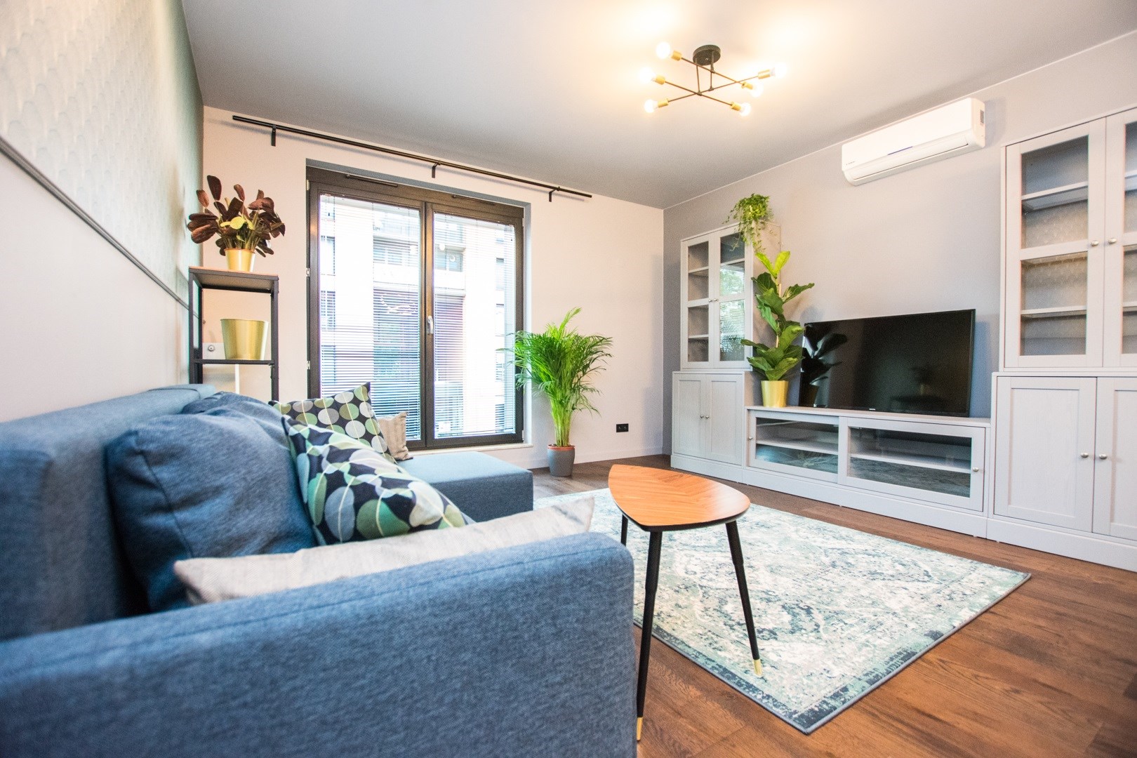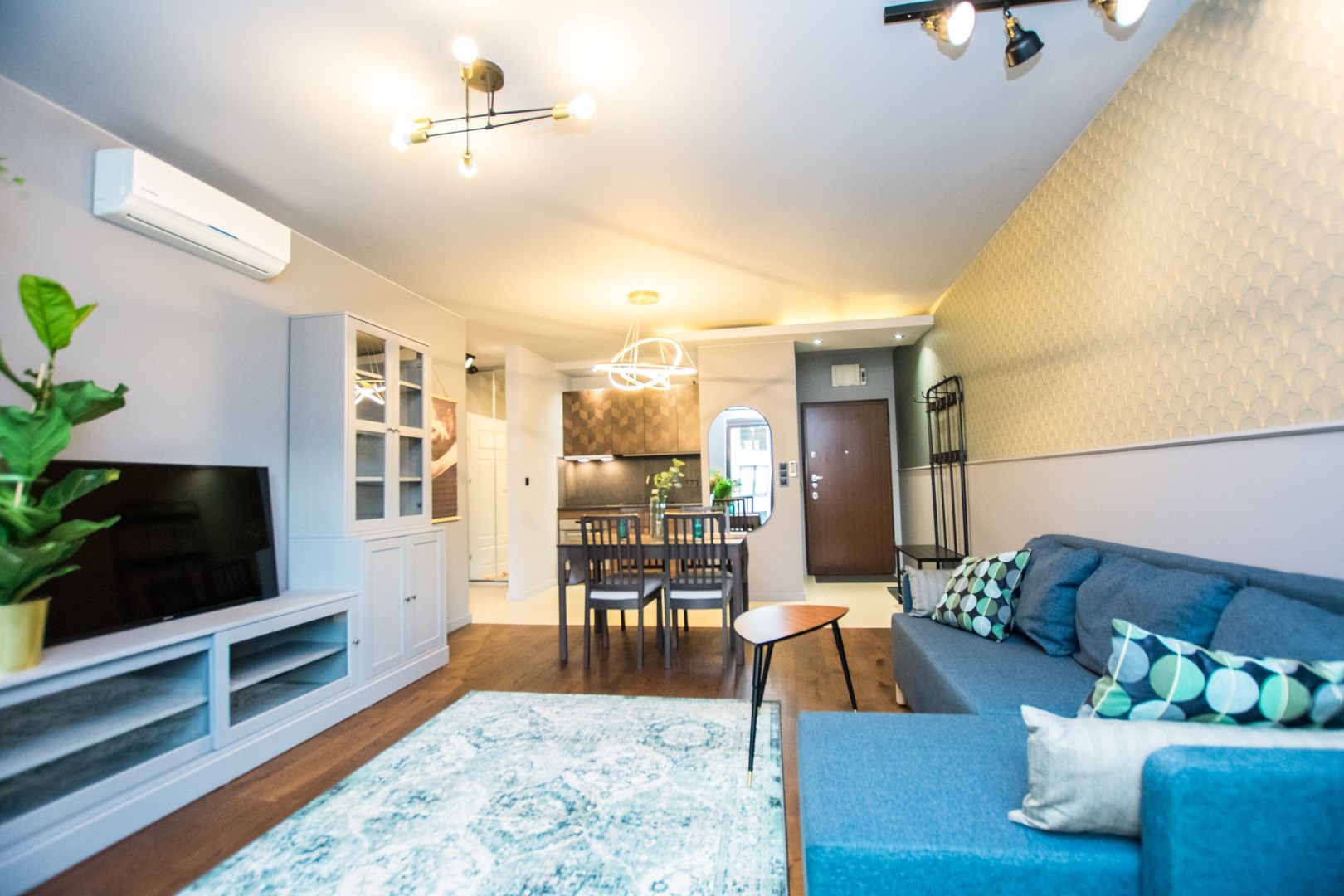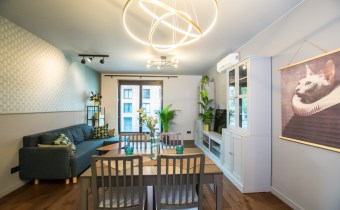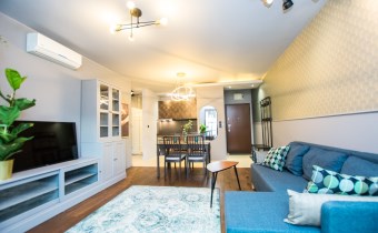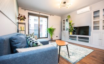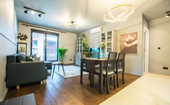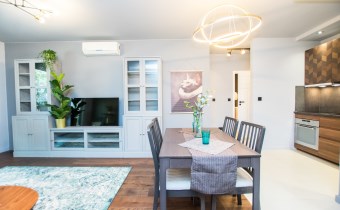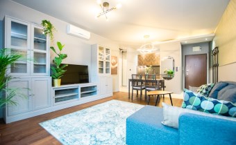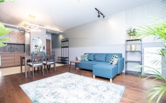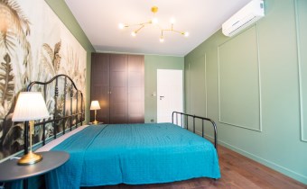 Klimatyzowany apartament w pełni wykończony i umeblowany w wysokim standardzie. W kuchni lodówko zamrażarka, zmywarka, piekarnik, płyta indukcyjna. W salonie sofa, stolik kawowy,, meblościanka, stół z 4 krzesłami, telewizor. W sypialni podwójne łóżko, szafki, pojemna szafa. W łazience wanna, umywalka z baterią, szafki, lustro, toaleta. Ogrzewanie i woda z miejskiej sieci MPEC.