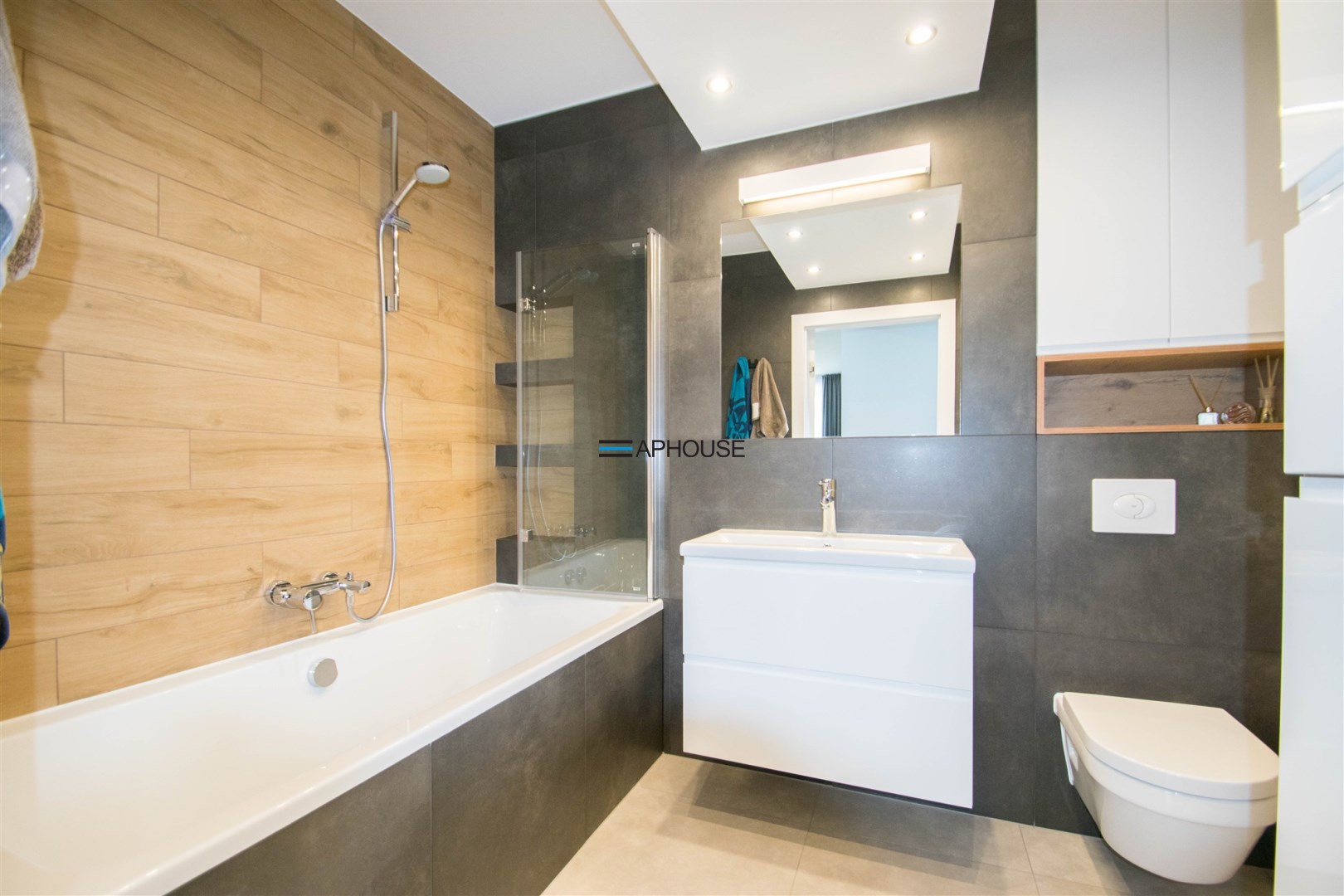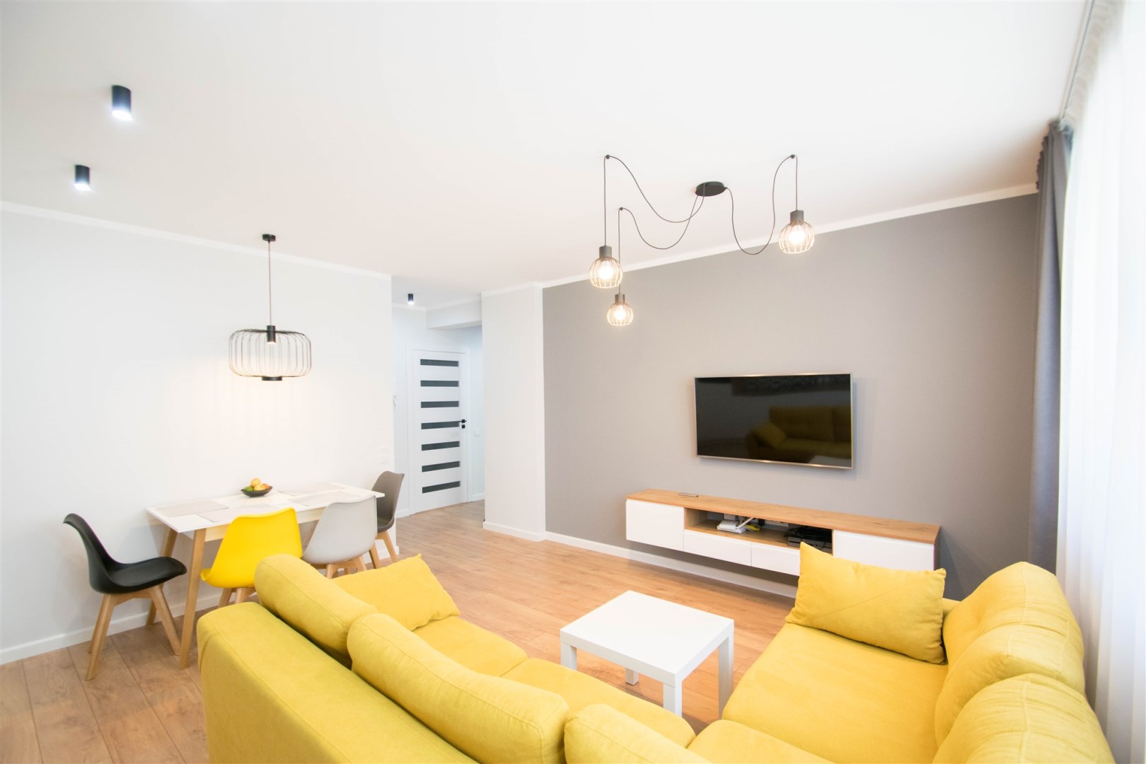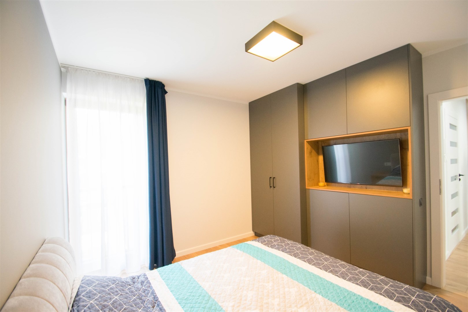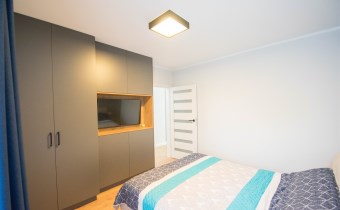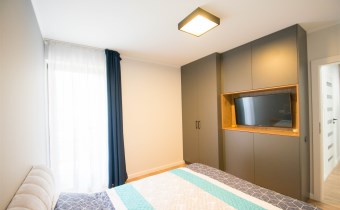 Mieszkanie zaprojektowana z dbałością o każdy szczegół wykończony w wysokim standardzie. Przestrony salon z dużą wygodną sofą, telewizorem, stolikiem kawowym. Aneks kuchenny z meblami na wymiar wyposażone w zmywaka piekarnik z funkcją mikrofalówki, płyta indukcyjna, lodówko-zamrażarka. W głównej sypialni znajduje się duże dwuosobowe łóżko, szafki noce, szafa na wymiar, telewizor. Druga sypialnia obecnie pełni funkcję gabinety w którym znajduje się duże biurko, szafa w zabudowie. Łazienka z wanną i opcją prysznicową, toaleta, umywalką z szafką oraz pralko-suszarka. W przedpokoju znajduje się pojemna szafa w zabudowie. Do mieszkania przynależy miejsce postojowe w garażu podziemnym płatne dodatkowo 80000zł.