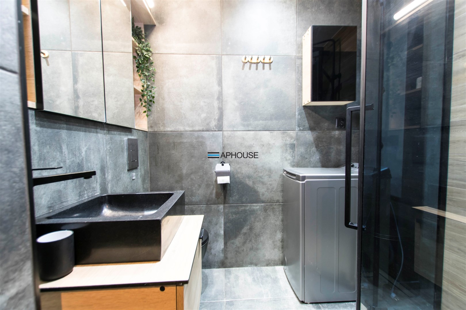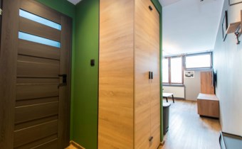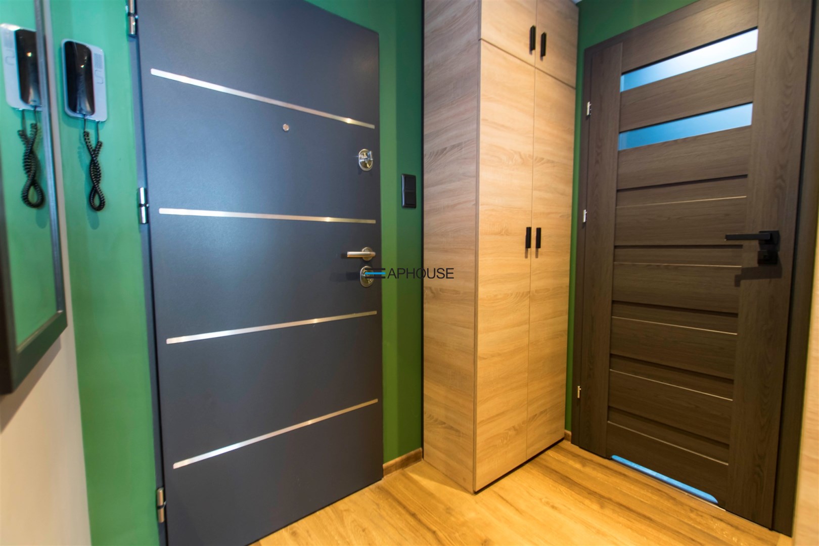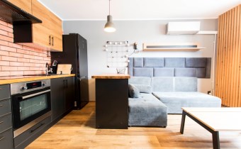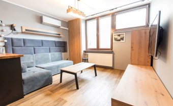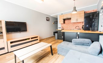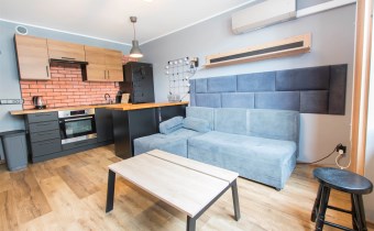 W salonie jest rozkładana sofa, stolik kawowy, szafki, telewizor. W kuchni płyta grzecza, lodówko-zamrażarka, piekarnik, okap, zlew i dużo szafek do przechowywania. W przedpokoju są dwie szafy. W łazience prysznic, pralka, toaleta, umywalka. W mieszkaniu jest klimatyzacja.