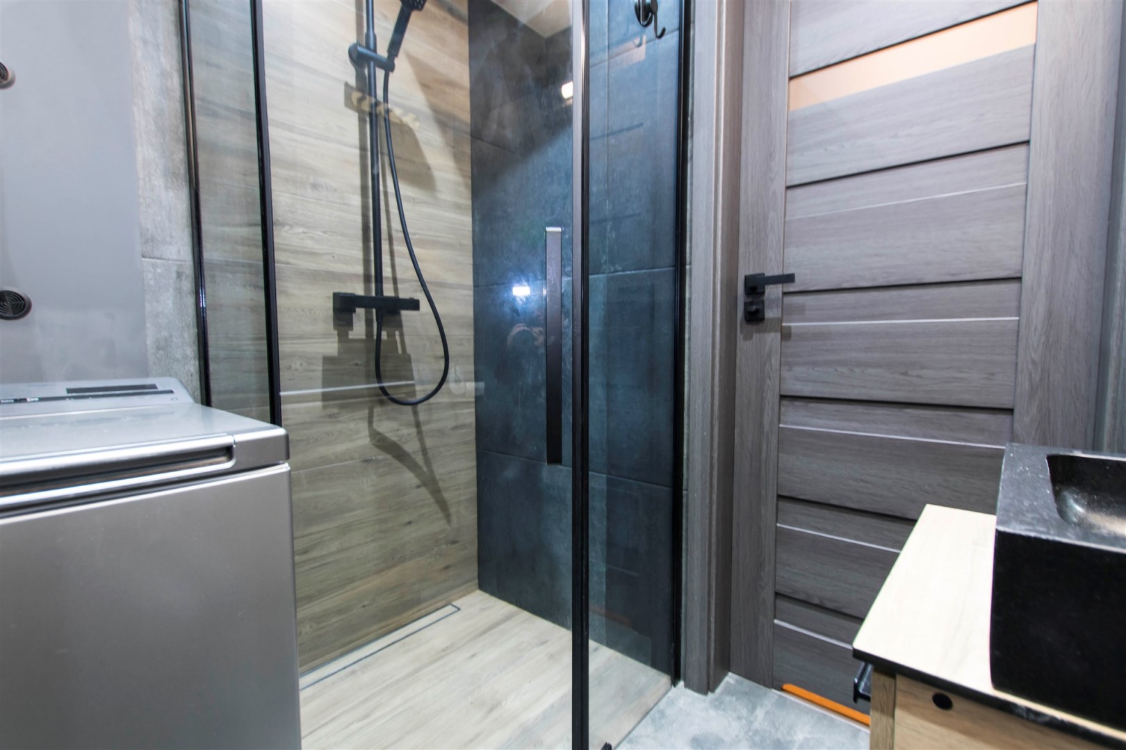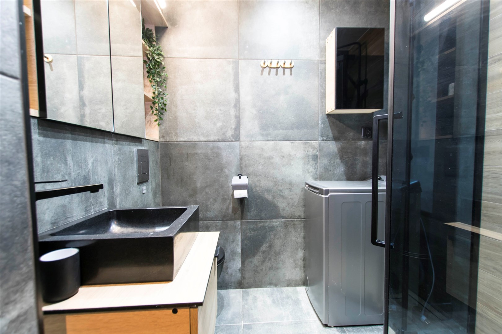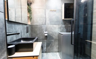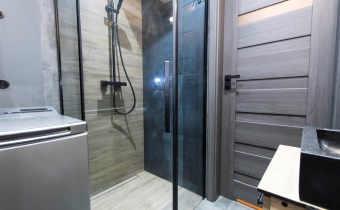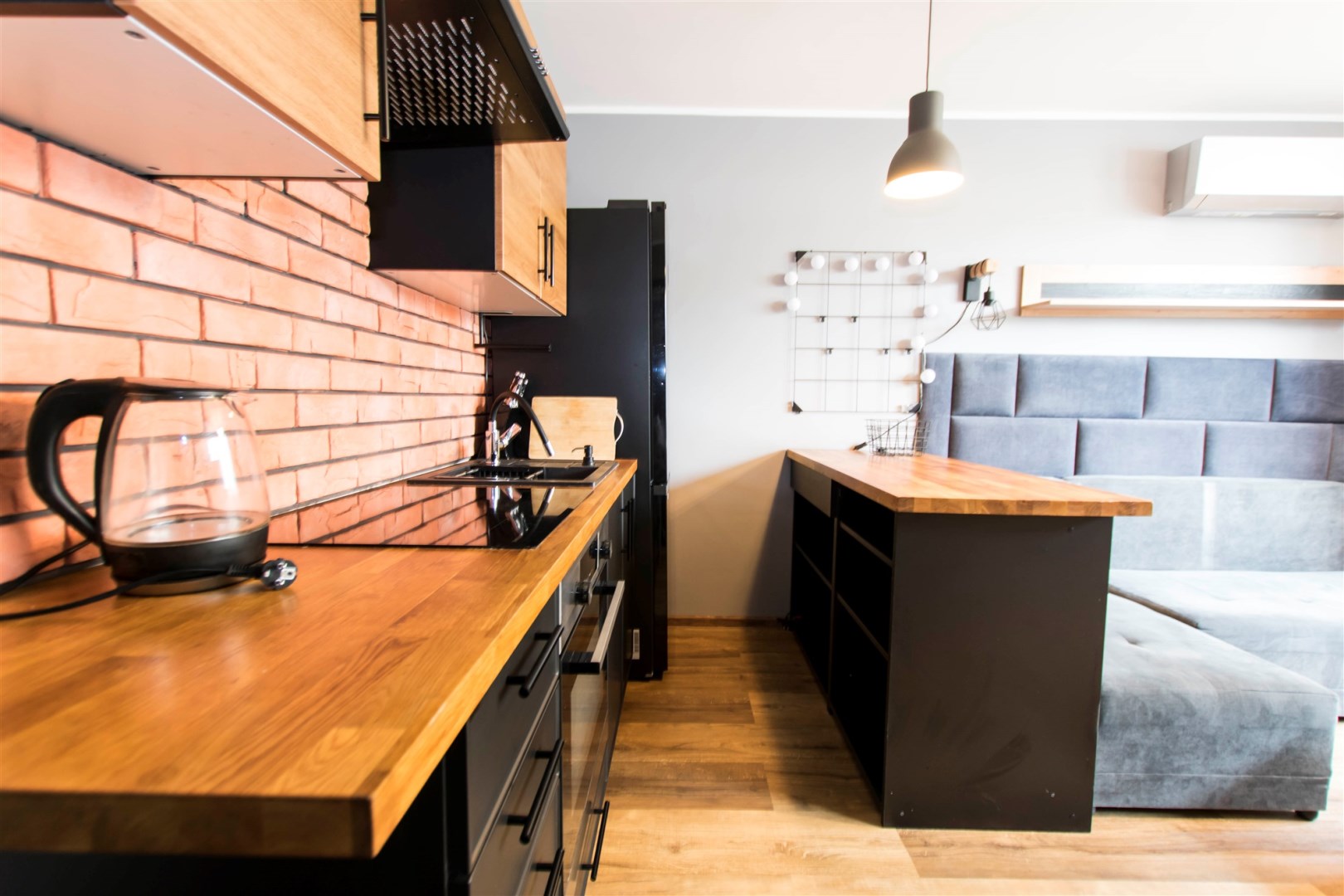 W salonie jest rozkładana sofa, stolik kawowy, szafki, telewizor. W kuchni płyta grzecza, lodówko-zamrażarka, piekarnik, okap, zlew i dużo szafek do przechowywania. W przedpokoju są dwie szafy. W łazience prysznic, pralka, toaleta, umywalka. W mieszkaniu jest klimatyzacja.