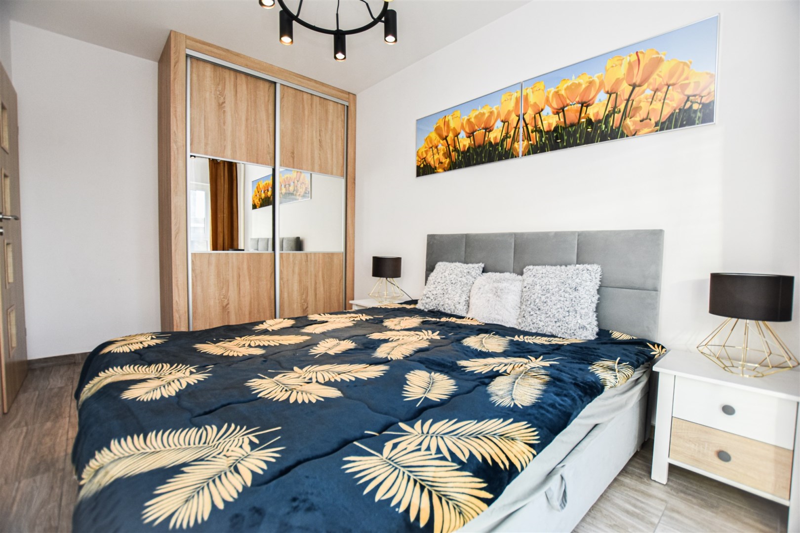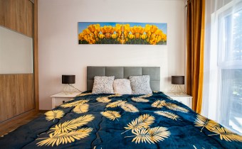 W salonie znajduje sofa, stół z krzesłami, komoda, telewizor. W sypialni podwójne łóżko, szafki nocne oraz bardzo duża szafa w zabudowie. W drugiej sypialni rozkładana sofa, duża szafa w zabudowie. Łazienka z wanną i z opcją prysznica, pralka umywalka. Przestronny korytarz.