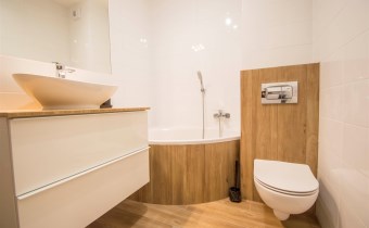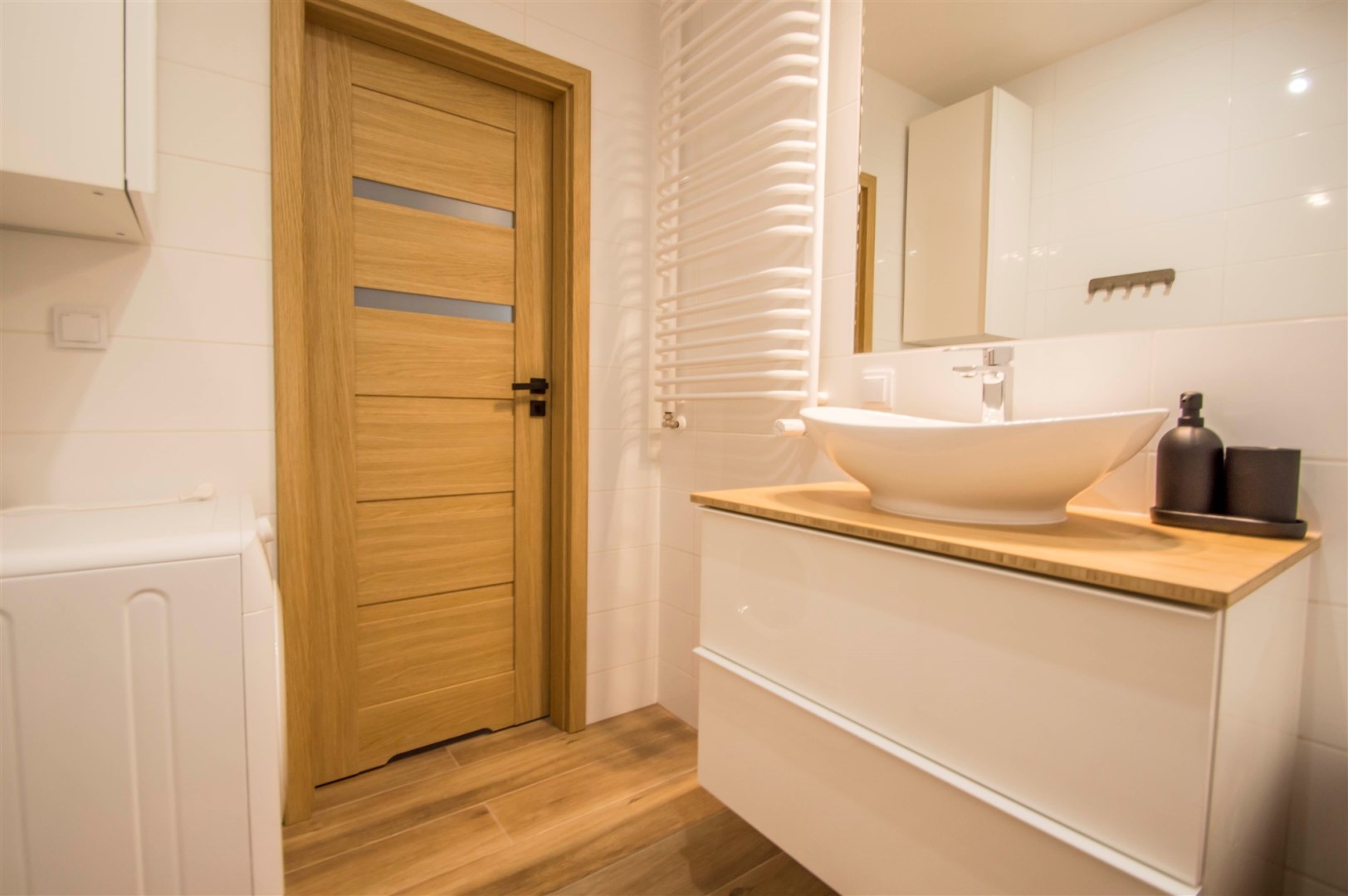 Mieszkanie jest zaprojektowane bardzo funkcjonalnie, bardzo przestronne. W salonie znajduje się sofa rozkładana, szafka rtv, stolik kawowy i telewizor. W 1 sypialni jest łóżko dwuosobowe i bardzo duża szafa. W 2 sypialni jest sofa rozkładana i szafa. Kuchnia jest w pełni wyposażona, znajduje się w niej lodówko-zamrażarka, zmywarka, piekarnik, płyta grzewcza, okap, zlew z baterią oraz stół z krzesłami. W skład łazienki wchodzi toaleta, wanna, umywalka, pralka. W przedpokoju znajduje się duża szafa.
