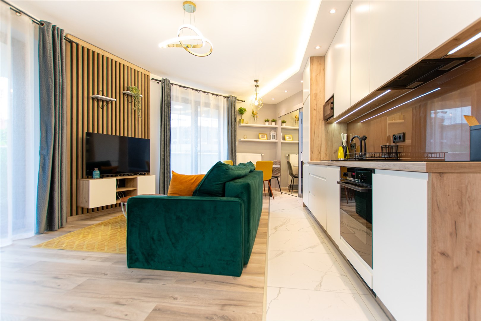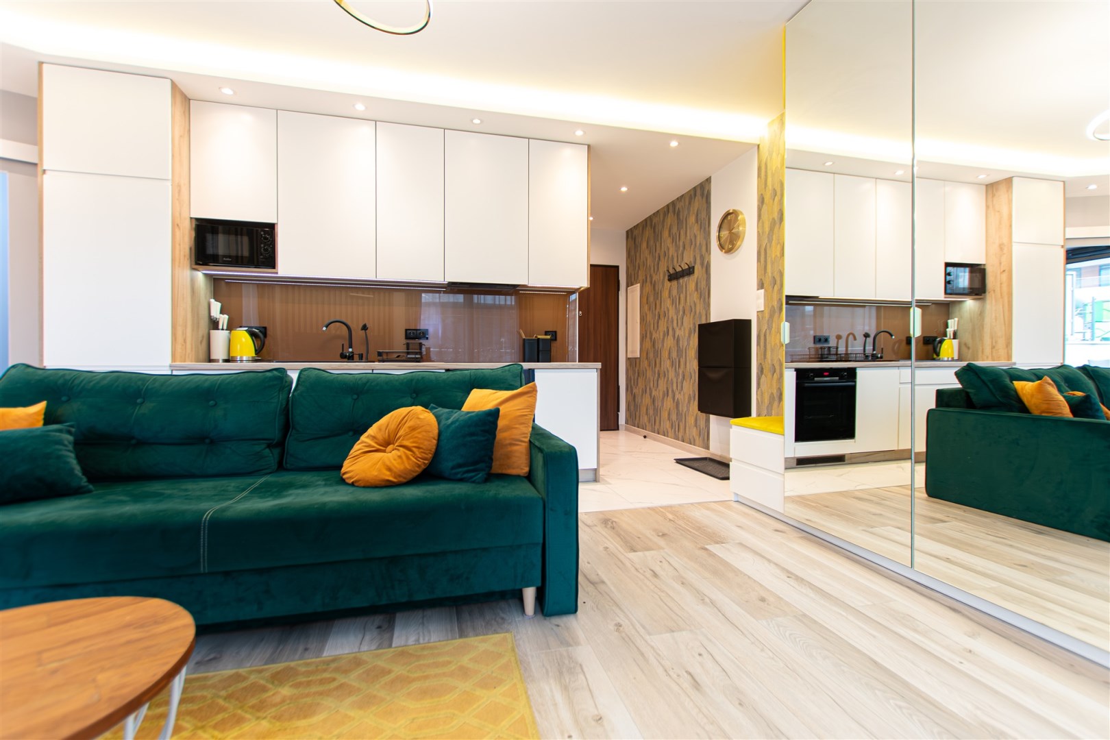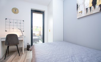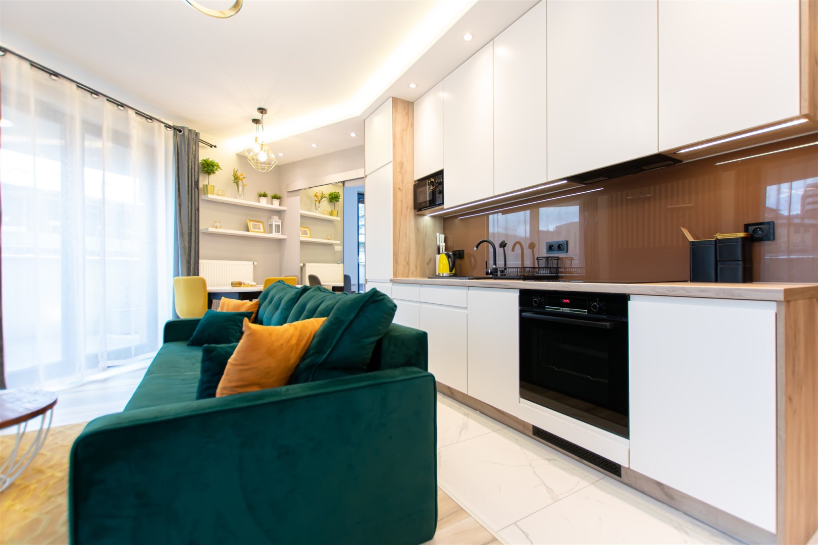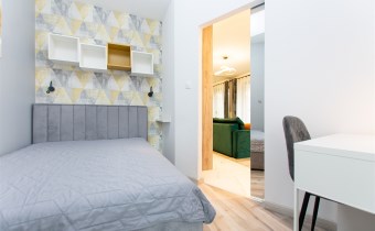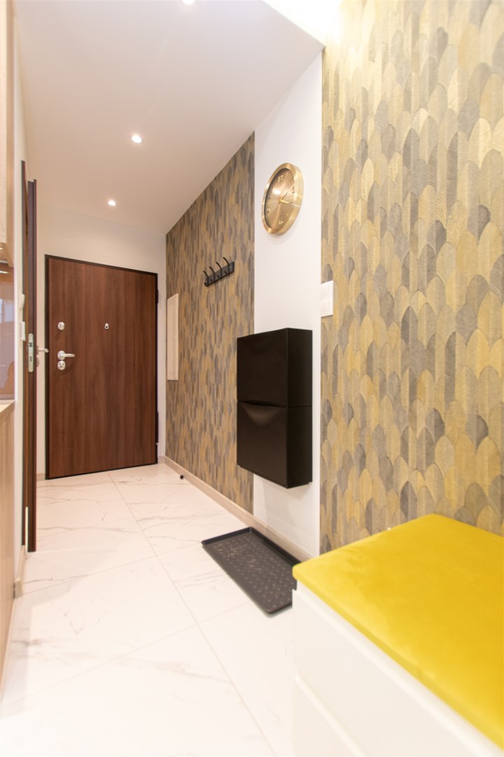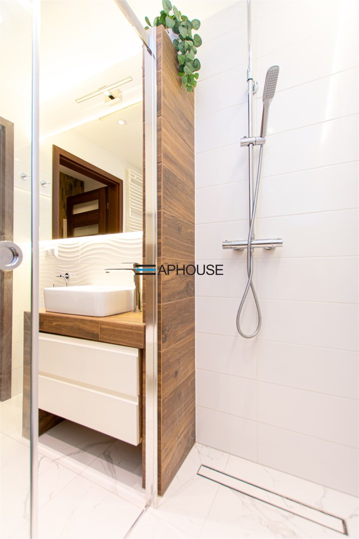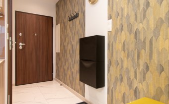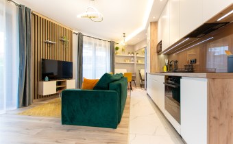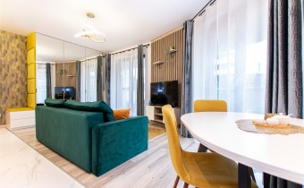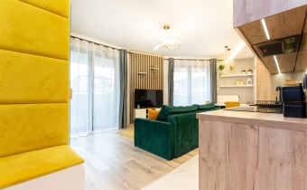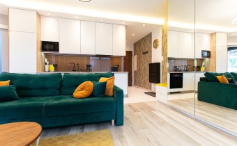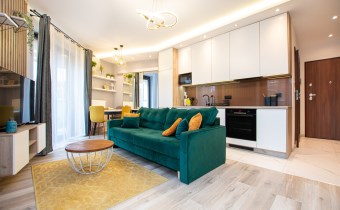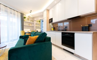 Wnętrze wykończone zostało nowocześnie, w oparciu o prezentowane wizualizacje, przy użyciu wysokiej jakości materiałów. Aneks kuchenny posiada: dużą lodówko-zamrażarkę z kostkarką, płytę grzewczą, piekarnik, mikrofalę, toster, czajnik, zmywarkę oraz okap. Salon ze stylową skórzaną sofą z funkcją spania oraz kącikiem jadalnianym. Łazienka jasna i przestronna z wanną i funkcją prysznica oraz bidetką. Znaczącym atutem mieszkania jest duża powierzchnia do przechowywania.