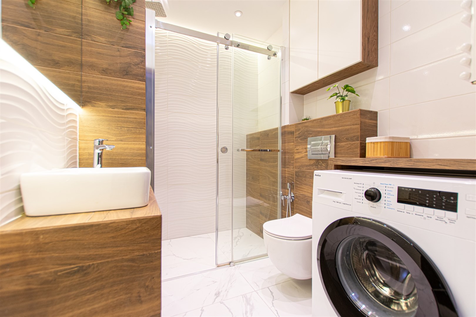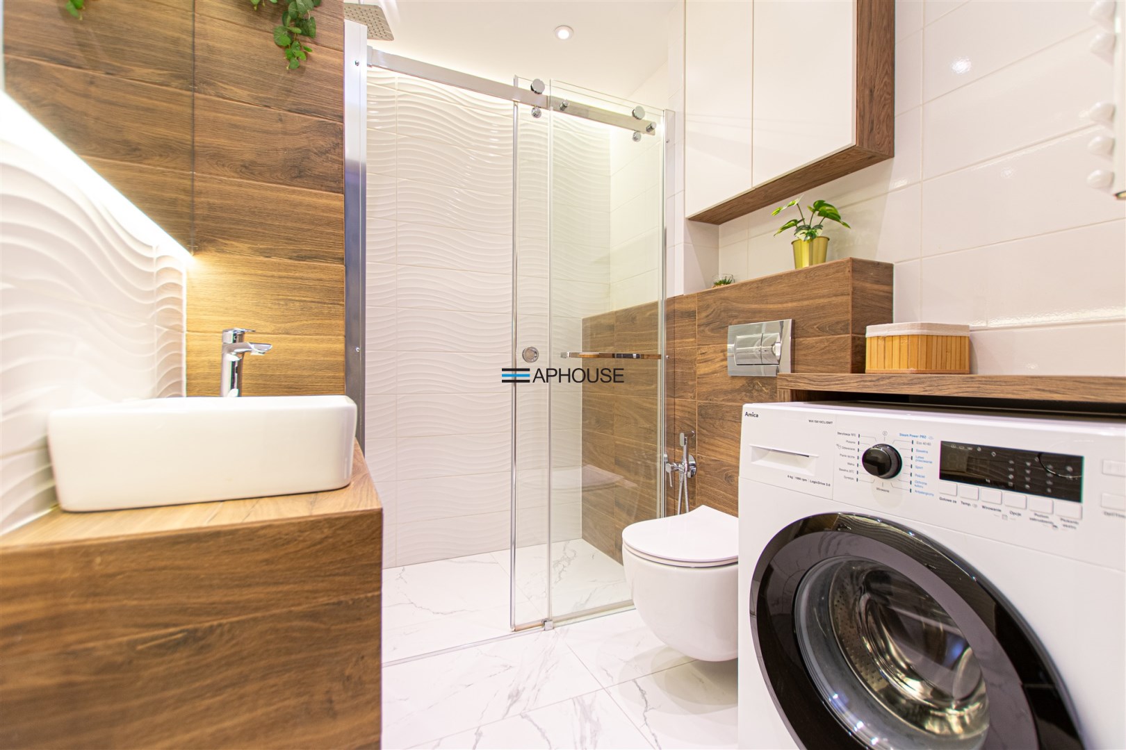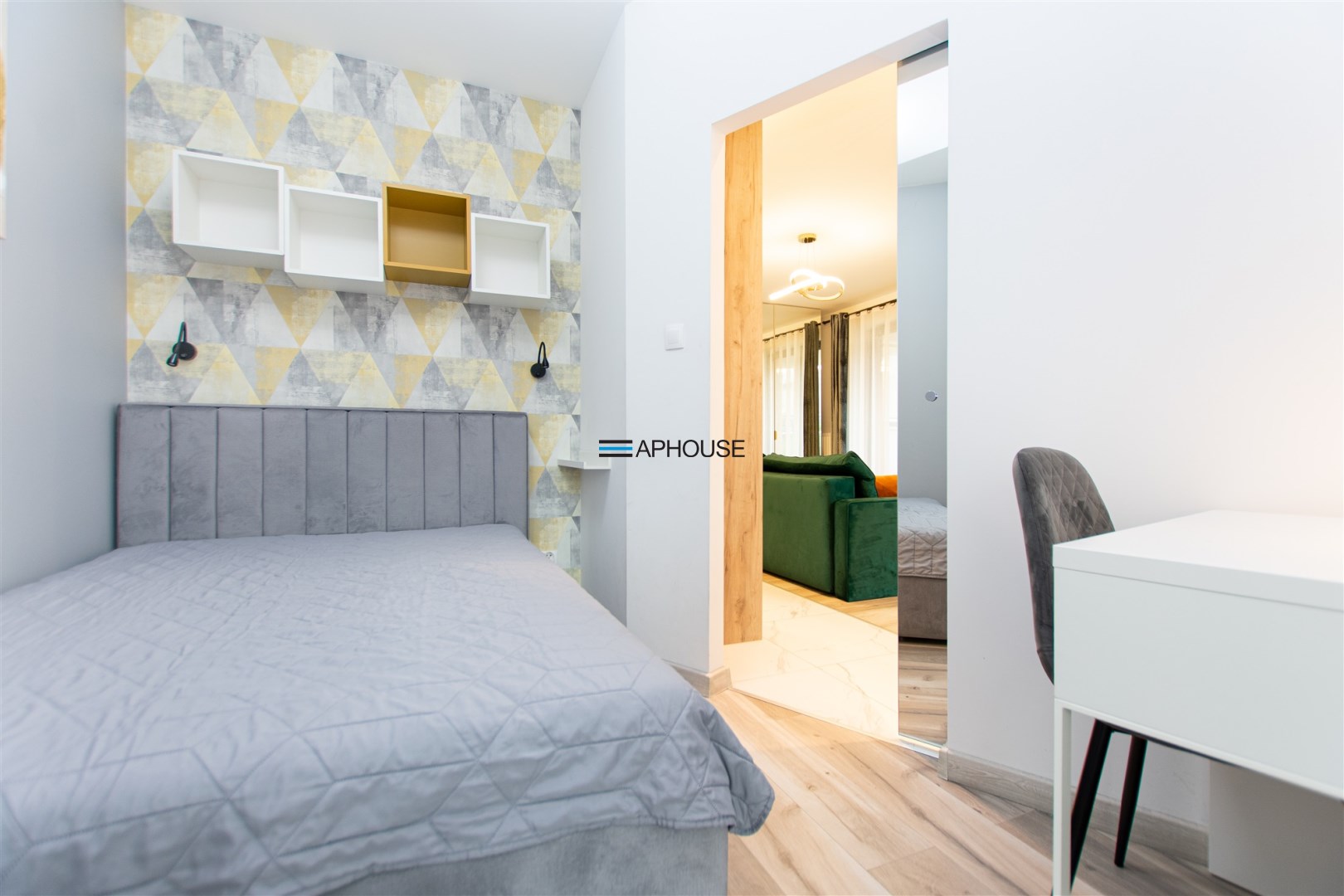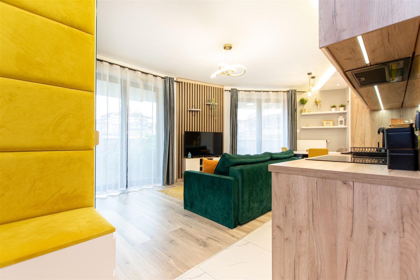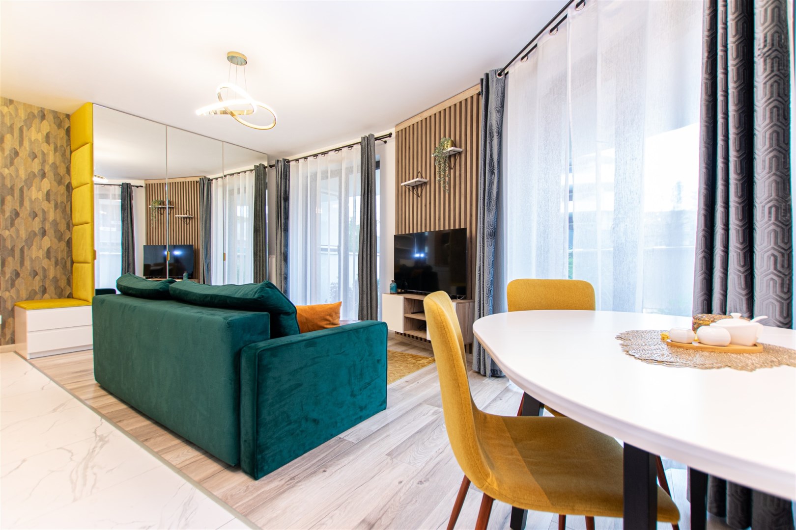 Wnętrze wykończone zostało nowocześnie, w oparciu o prezentowane wizualizacje, przy użyciu wysokiej jakości materiałów. Aneks kuchenny posiada: dużą lodówko-zamrażarkę z kostkarką, płytę grzewczą, piekarnik, mikrofalę, toster, czajnik, zmywarkę oraz okap. Salon ze stylową skórzaną sofą z funkcją spania oraz kącikiem jadalnianym. Łazienka jasna i przestronna z wanną i funkcją prysznica oraz bidetką. Znaczącym atutem mieszkania jest duża powierzchnia do przechowywania.