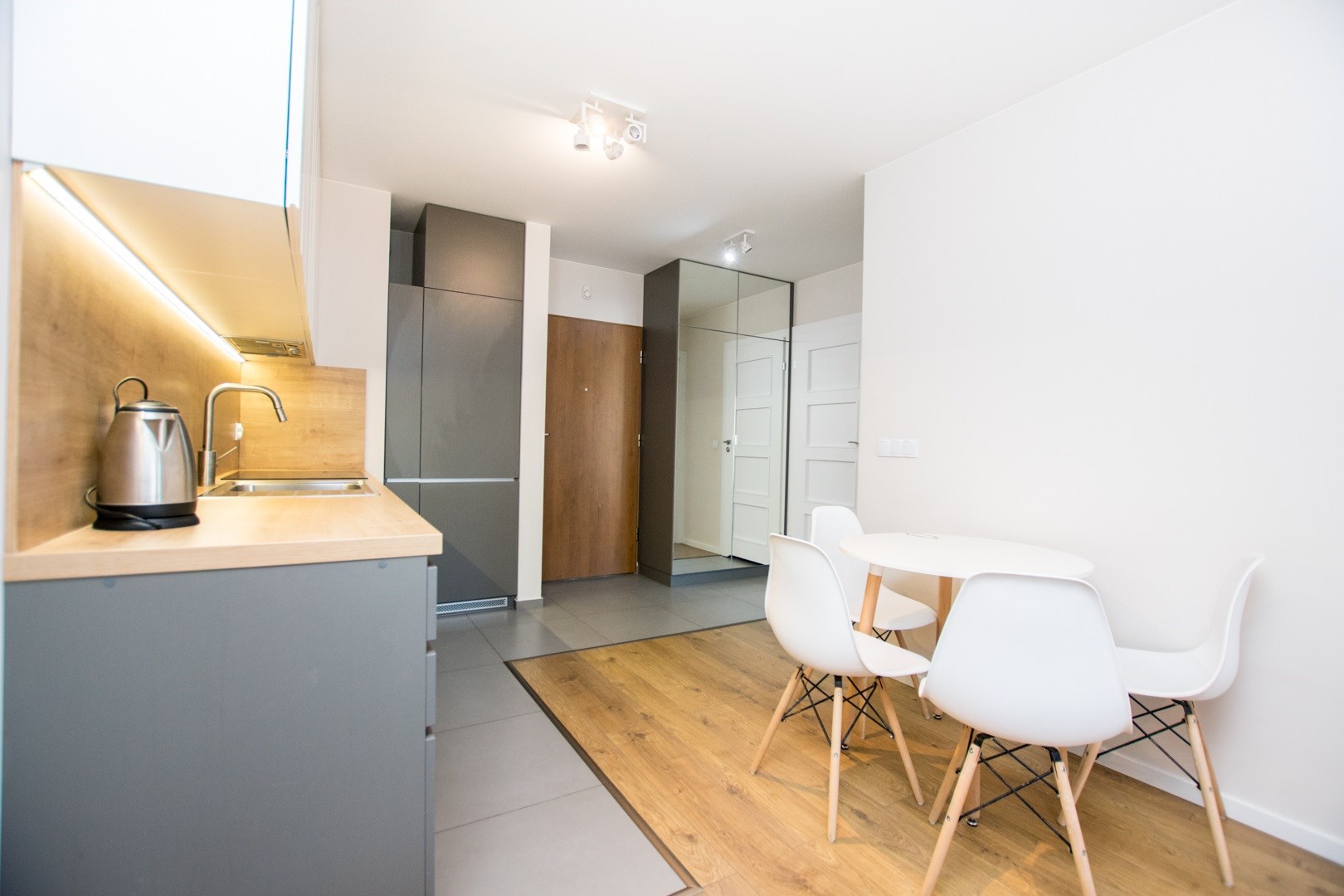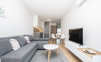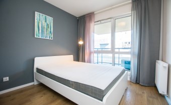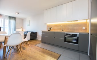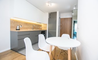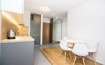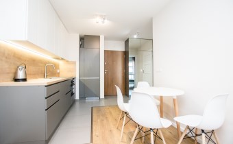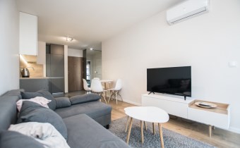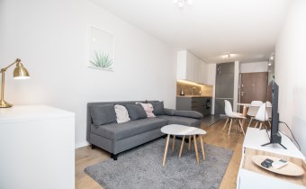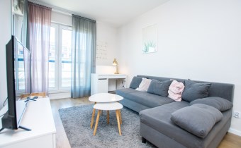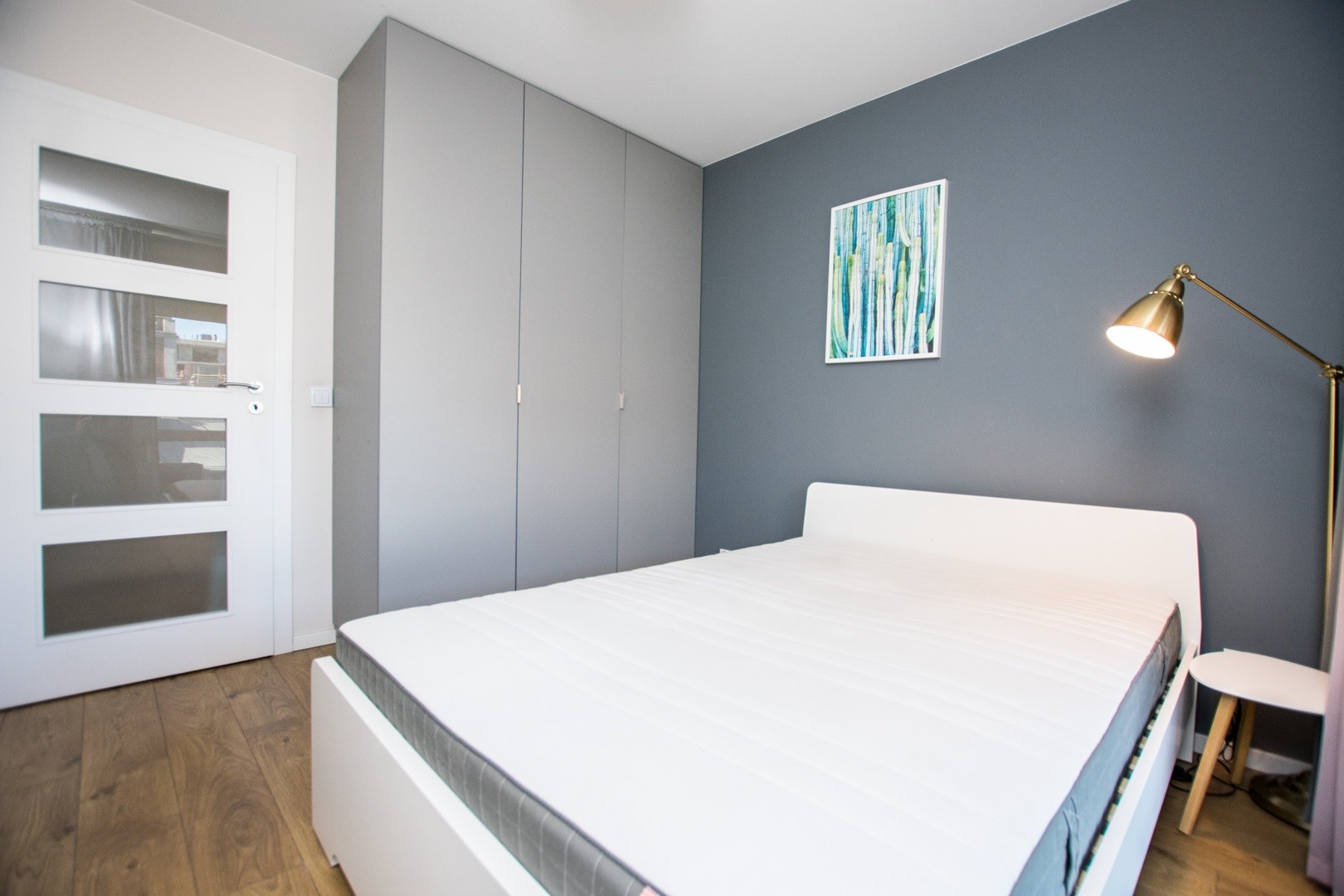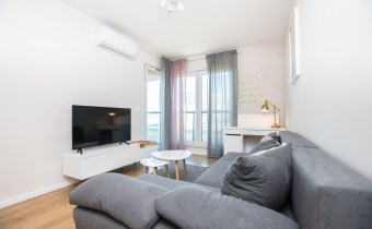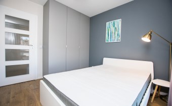W salonie znajdują się sofa, telewizor i szafka RTV, stoliki kawowe, biurko / toaletka, stół oraz 4 krzesła. Aneks kuchenny jest w pełni wyposażony w sprzęty takie jak: zmywarka, płyta indukcyjna, lodówka z zamrażarką i czajnik. Nowoczesna łazienka wyposażona jest w nową pralkę oraz wannę z parawanem. Sypialnia posiada duże łóżko dwuosobowe, szafę w zabudowie i szafkę nocną. W przedpokoju pojemna szafa z lustrami. Znacznym atutem nieruchomości jest klimatyzacja.