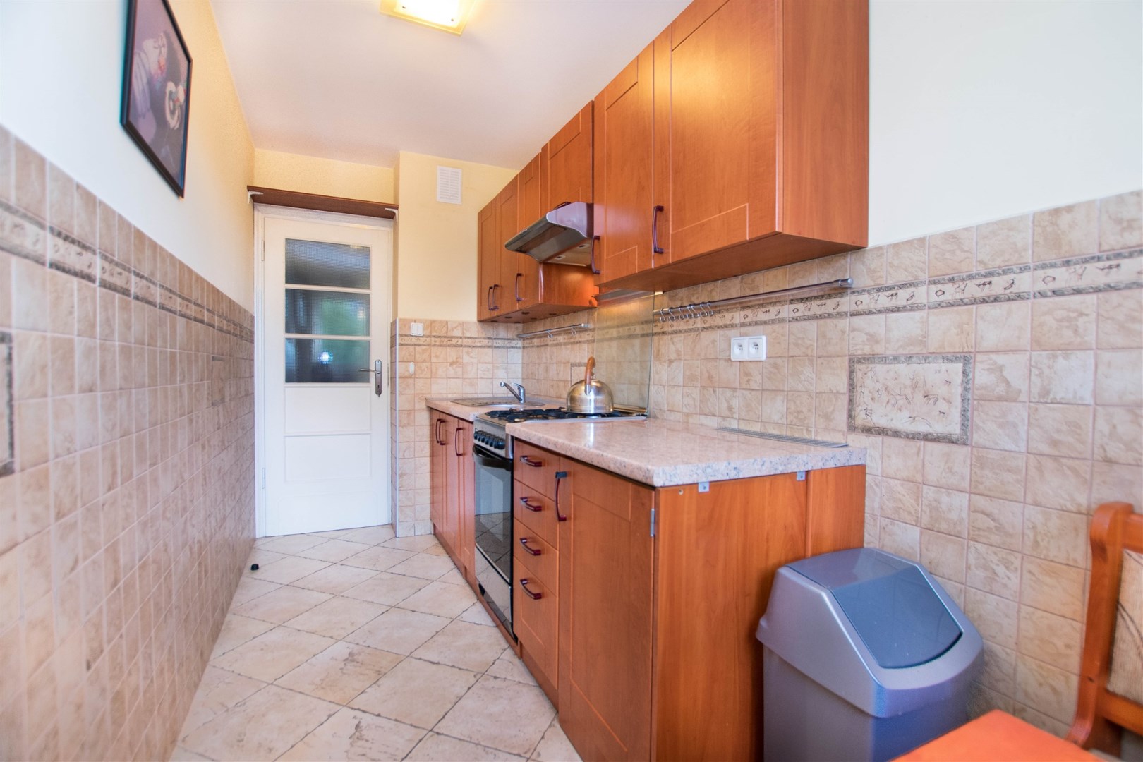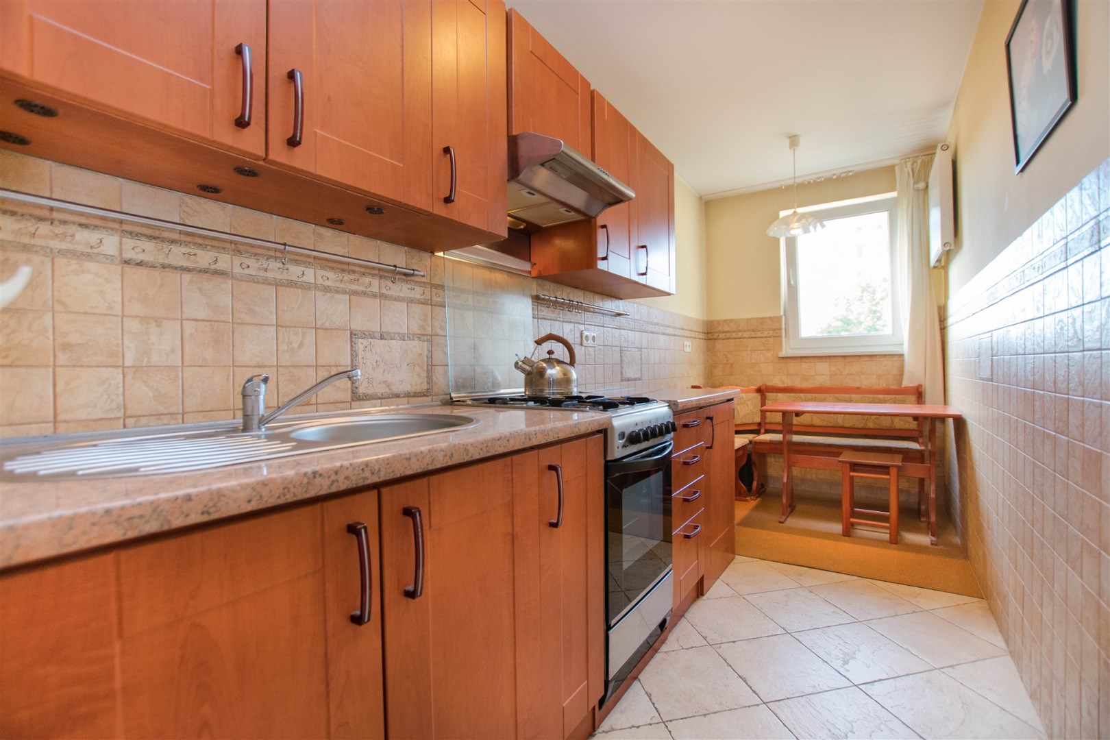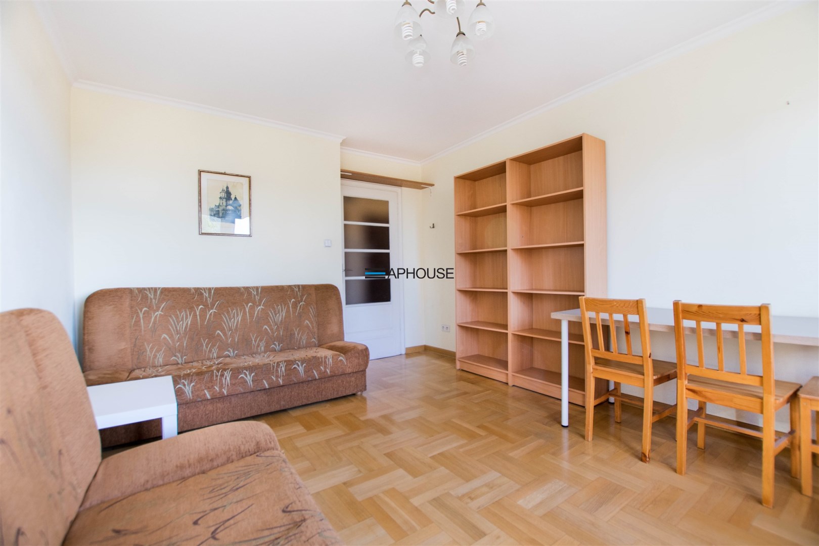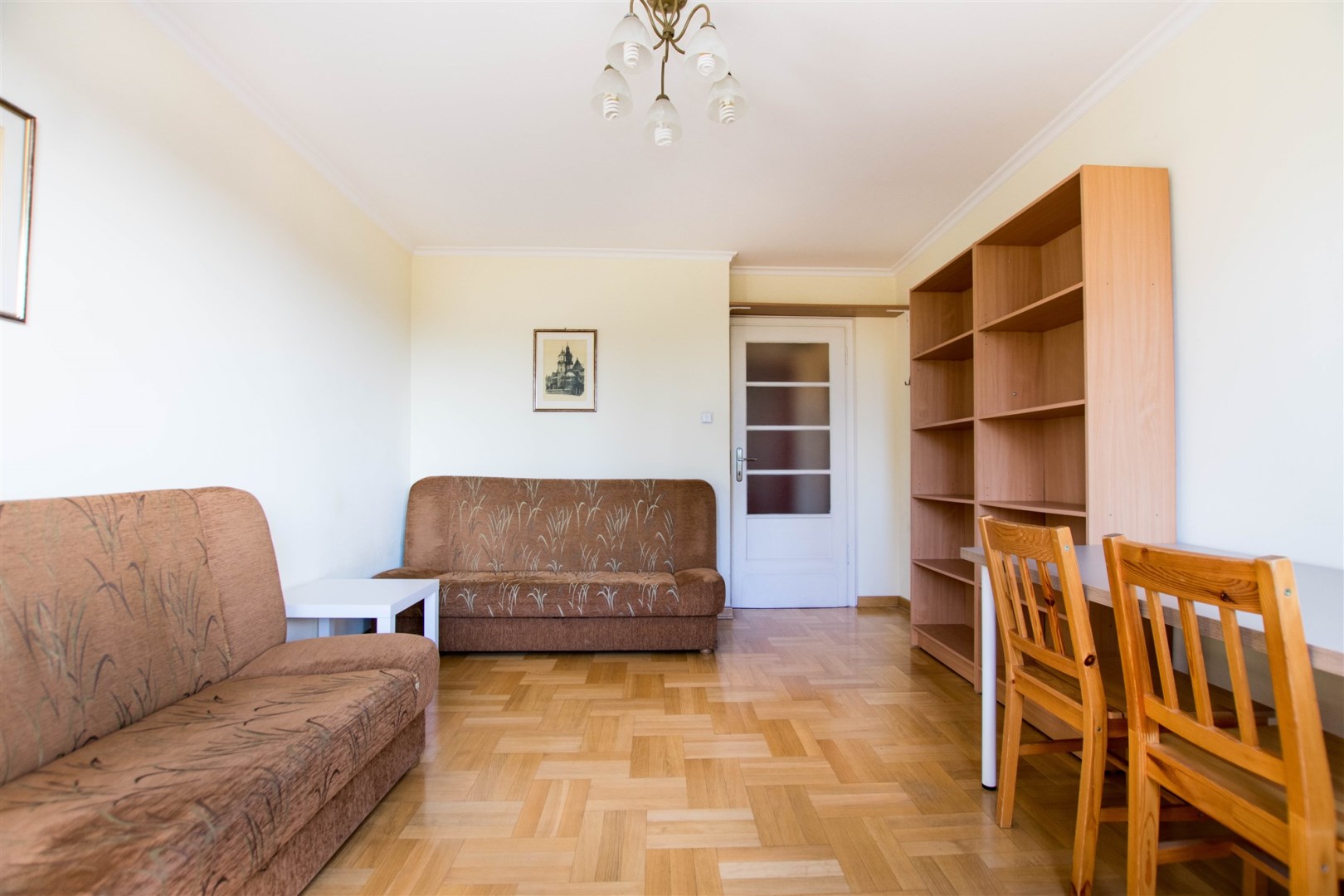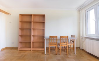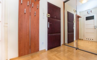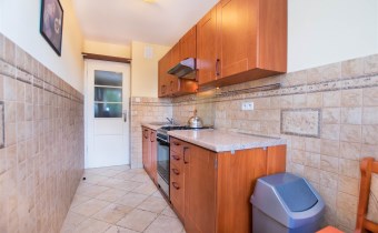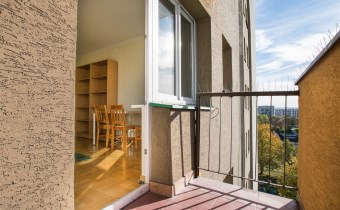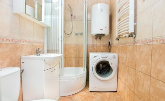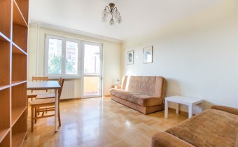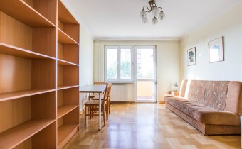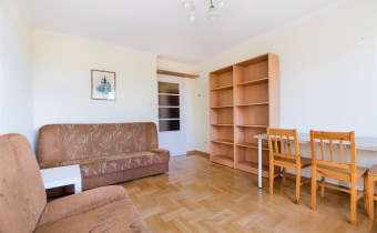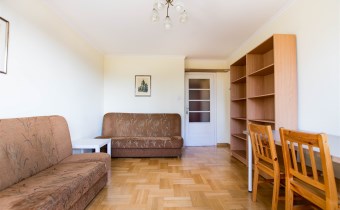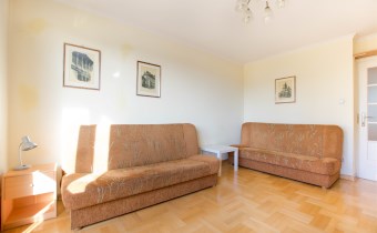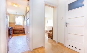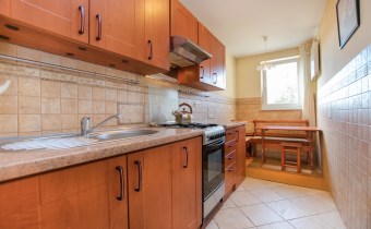 W pokoju znajdują się dwie rozkładane sofy, regał, stół z krzesłami oraz stolik kawowy. Z pokoju wyjście na balkon. Kuchnia wyposażona jest w lodówkę z zamrażarką, kuchenkę gazową, piekarnik, okap kuchenny, dużo miejsca do przechowywania oraz stół. W przedpokoju znajduje się pojemna szafa z lustrem. Łazienka wyposażona jest w kabinę prysznicową, umywalkę z szafką oraz toaletę.