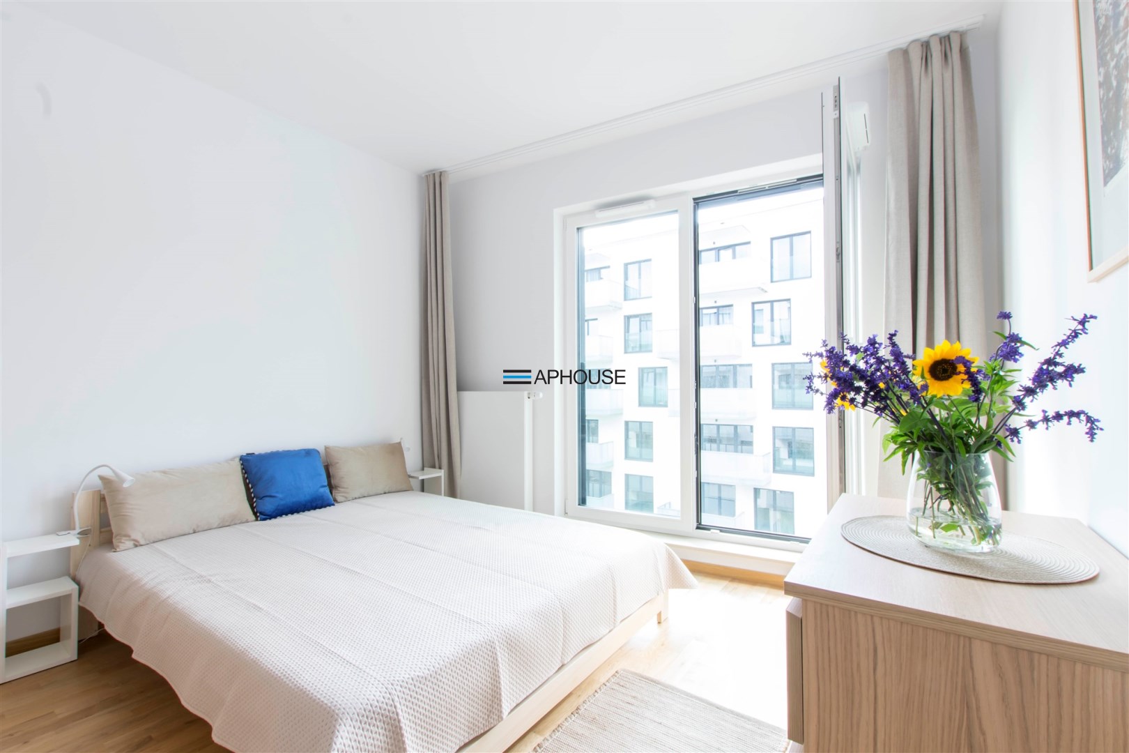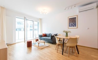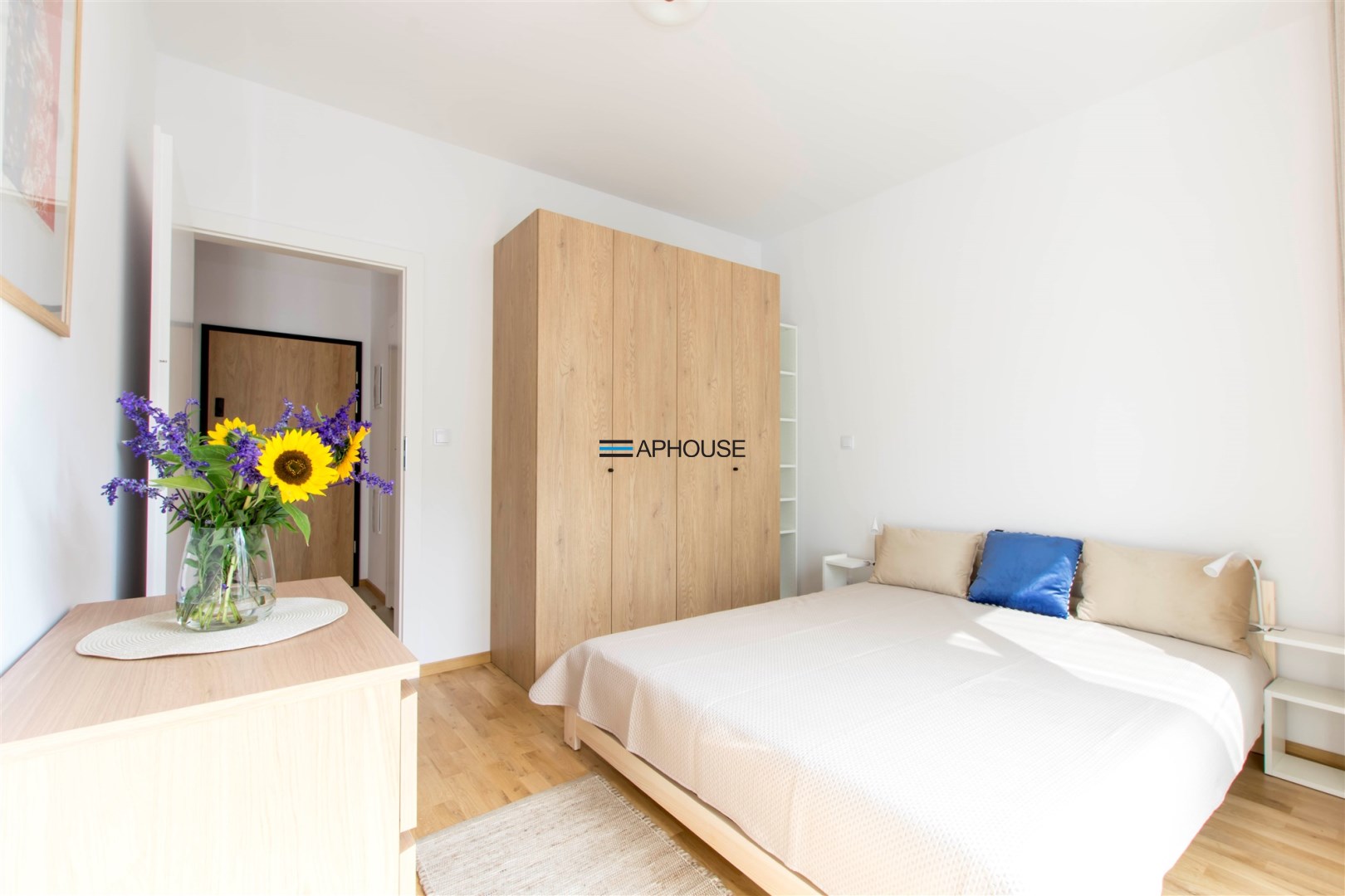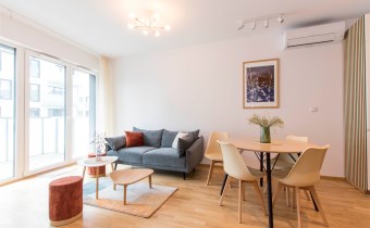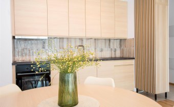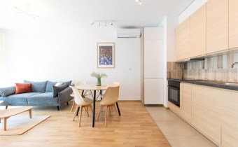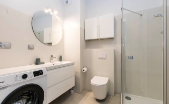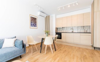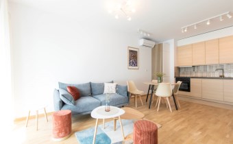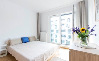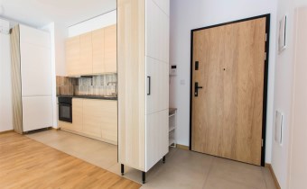 Mieszkanie jest bardzo jasne, z ekspozycją południowo-zachodnią. W salonie jest sofa, stół z krzesłami, szafka rtv, stoliki kawowe. W kuchni jest lodówko-zamrażarka, zmywarka, płyta grzewcza, piekarnik, okap, zlew. W sypialni jest łóżko dwuosobowe, komoda, szafki nocne i duża szafa. W przedpokoju również szafa oraz szafka na buty. W łazience jest prysznic, pralka, zlew, toaleta, szafki do przechowywania. Mieszkanie jest bardzo ciche.