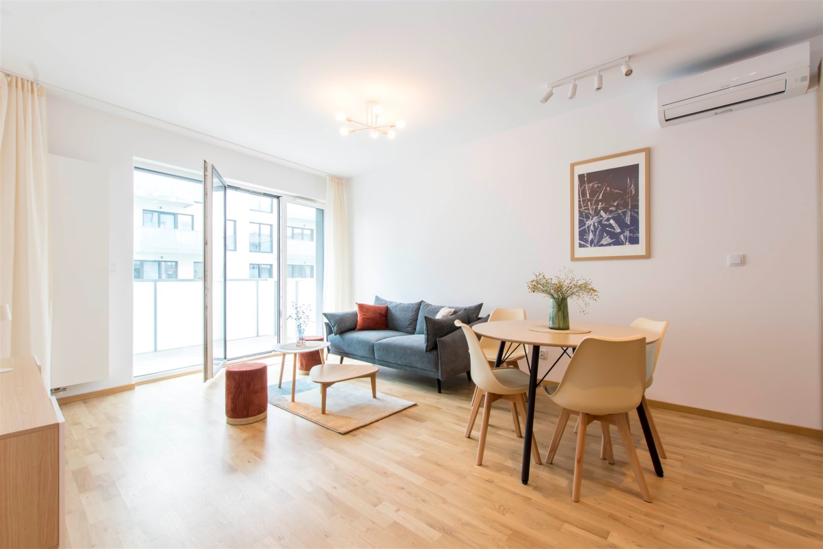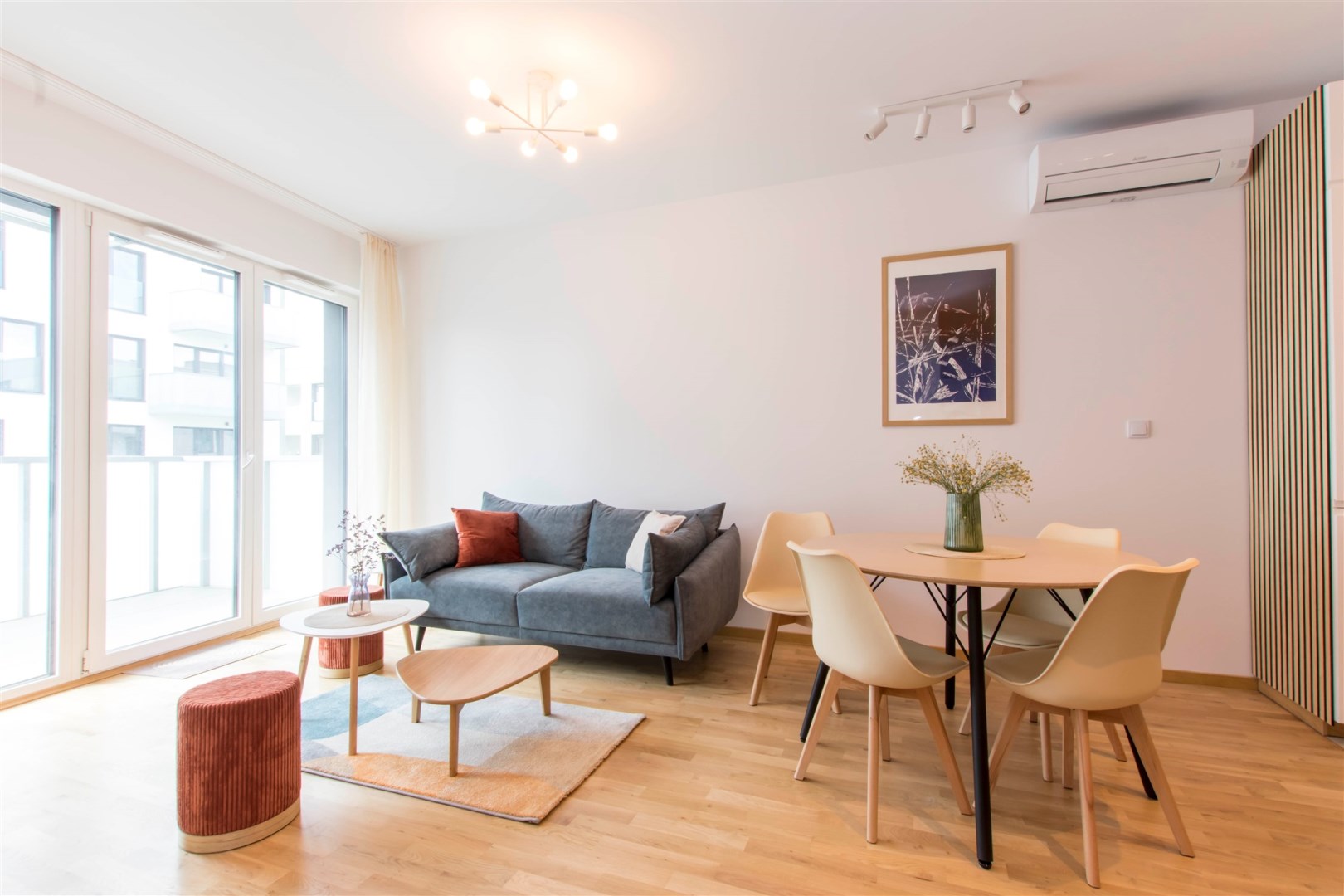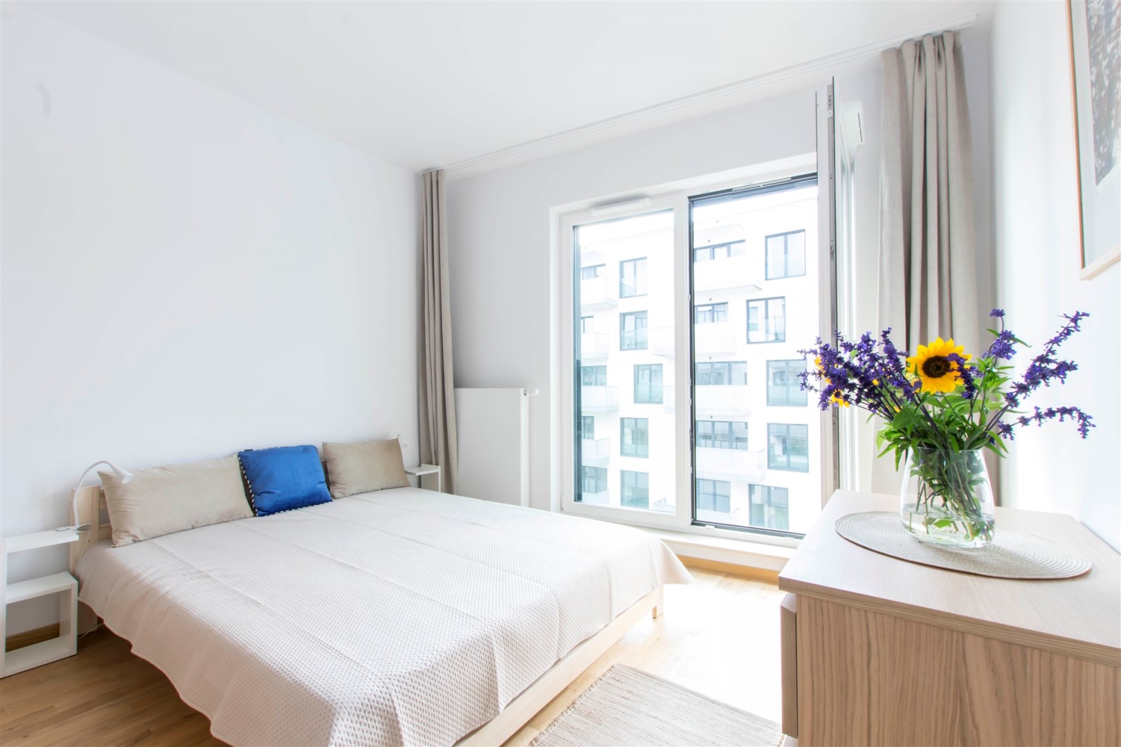 Mieszkanie jest bardzo jasne, z ekspozycją południowo-zachodnią. W salonie jest sofa, stół z krzesłami, szafka rtv, stoliki kawowe. W kuchni jest lodówko-zamrażarka, zmywarka, płyta grzewcza, piekarnik, okap, zlew. W sypialni jest łóżko dwuosobowe, komoda, szafki nocne i duża szafa. W przedpokoju również szafa oraz szafka na buty. W łazience jest prysznic, pralka, zlew, toaleta, szafki do przechowywania. Mieszkanie jest bardzo ciche.