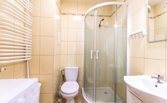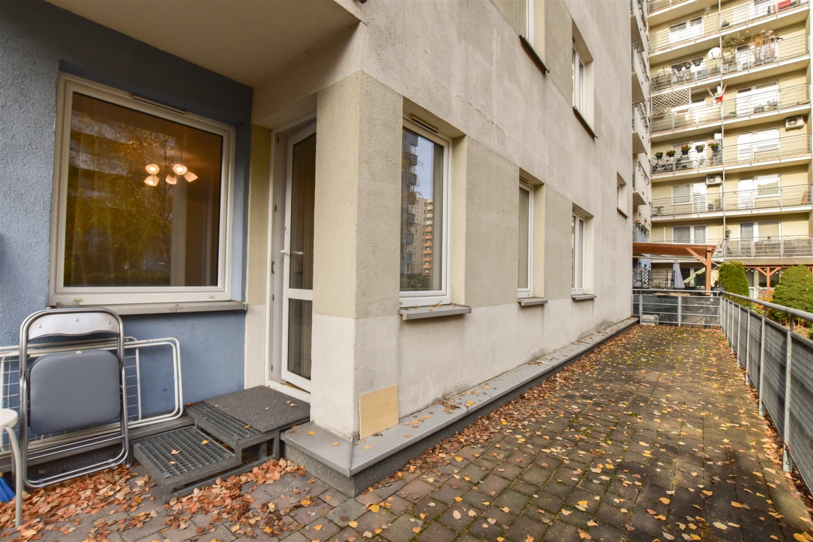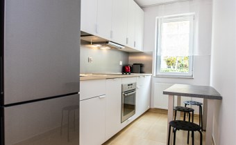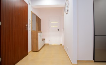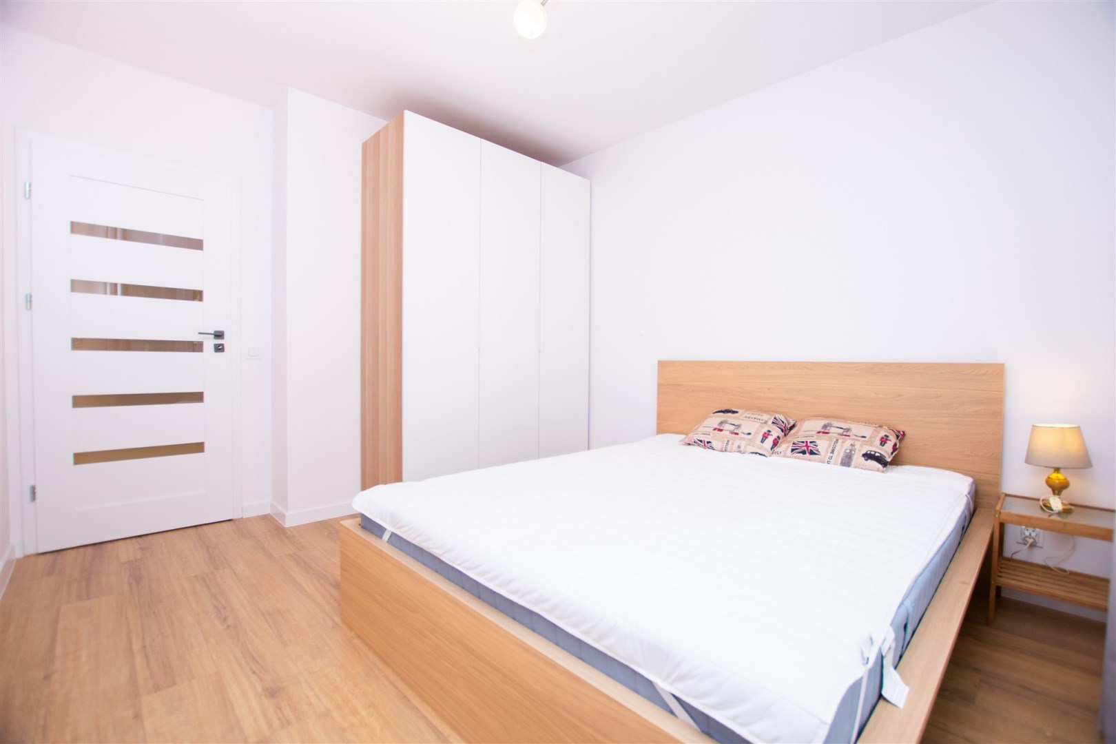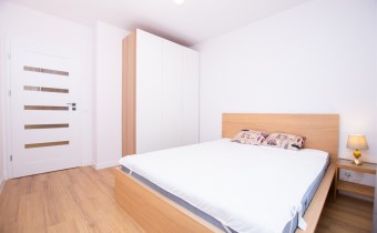 Salon w wyposażony w sofę szafę, komodę stolik kawowy telewizor. W sypialni jest duże łóżko małżeńskie, stolik i szafa. W kuchni znajdują się meble w zabudowie, lodówka z zamrażalnikiem, okap, płyta indykacyjna i piekarnik. Łazienka została wyposażona w prysznic, umywalkę, wc oraz szafki. Z salonu wychodzimy na duży taras. W przedpokoju znajduje się pojemna szafa. Mieszkanie posiada bardzo wygodny i funkcjonalny rozkład pozwalający swobodnie zamieszkać dwóm osobom.