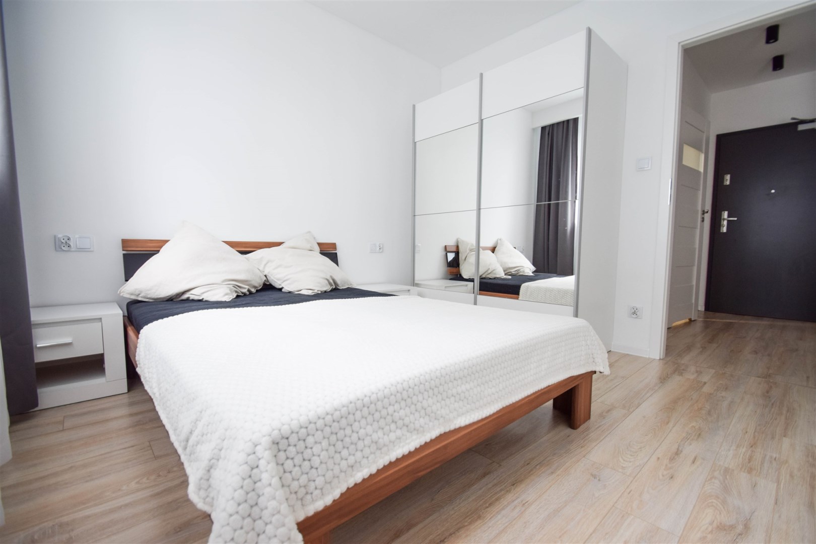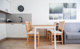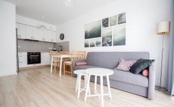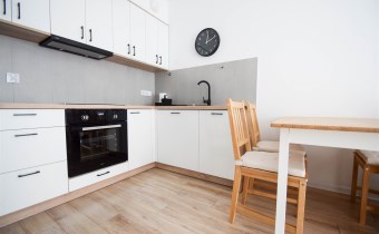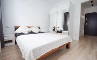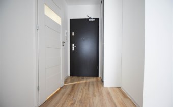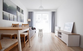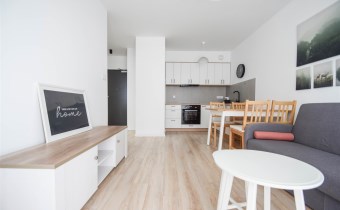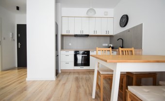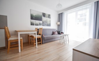 Salon wyposażony został w wygodna kanapę, stolik kawowy oraz meble RTV.W wyposażeniu kuchennym znajdują się meble w zabudowie, lodówka z zamrażalnikiem, okap, płyta indykacyjna, zmywarka i piekarnik. Z salonu wychodzimy na balkon. W sypialni znajduje się łóżko oraz pojemna szafa. Łazienka została wyposażona w kabinę prysznicową, umywalkę, WC, lustro, szafkę oraz pralkę. Mieszkanie jest bardzo jasne i przestronne, posiada wygodny i funkcjonalny rozkład.