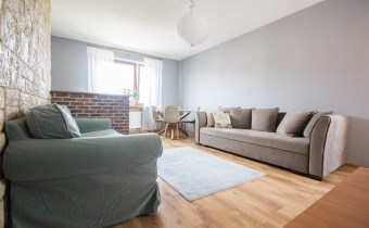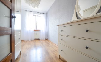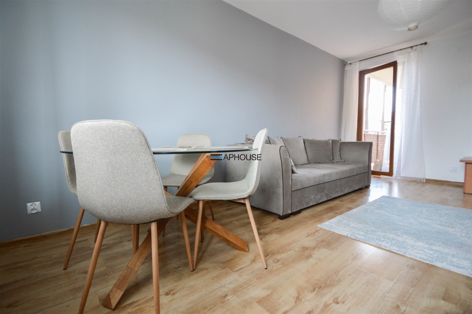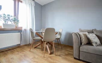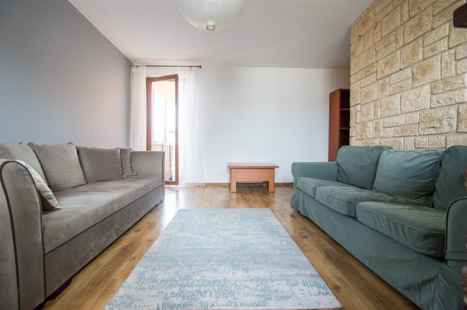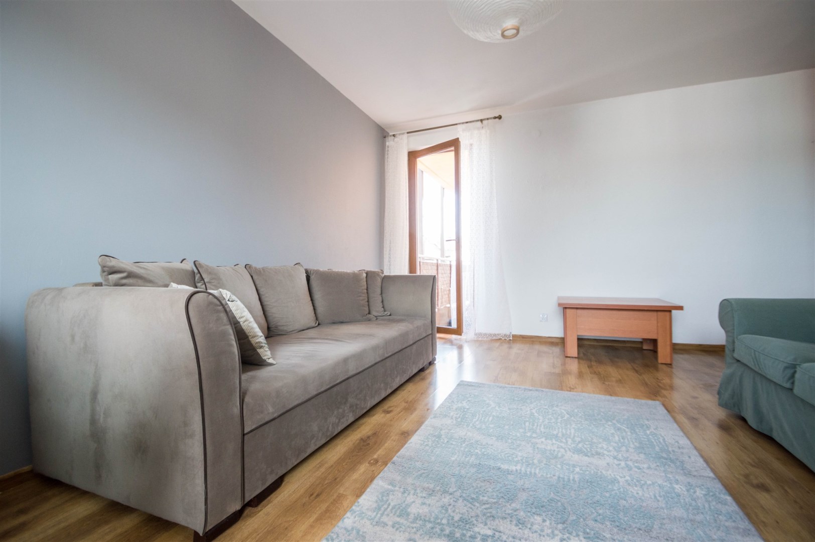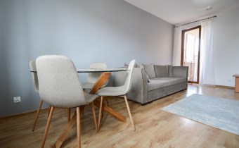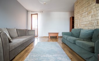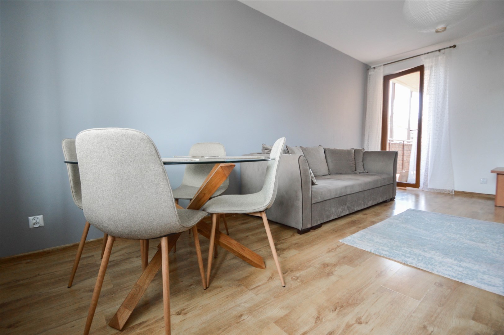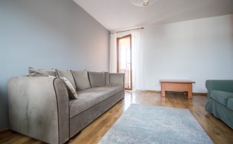 Salon wyposażony został w wygodne dwie kanapy, stolik kawowy oraz stół z krzesłami .W wyposażeniu kuchennym znajdują się meble w zabudowie, lodówka z zamrażalnikiem, okap, płyta gazowa i piekarnik. Z salonu wychodzimy na duży balkon. W sypialni znajduje się pojemna szafa oraz komoda. Łazienka została wyposażona w wannę, umywalkę, WC, lustro, szafki oraz pralkę. W przedpokoju pojemna szafa. Mieszkanie jest bardzo jasne i przestronne, posiada wygodny i funkcjonalny rozkład. Mieszkanie świeżo malowane.