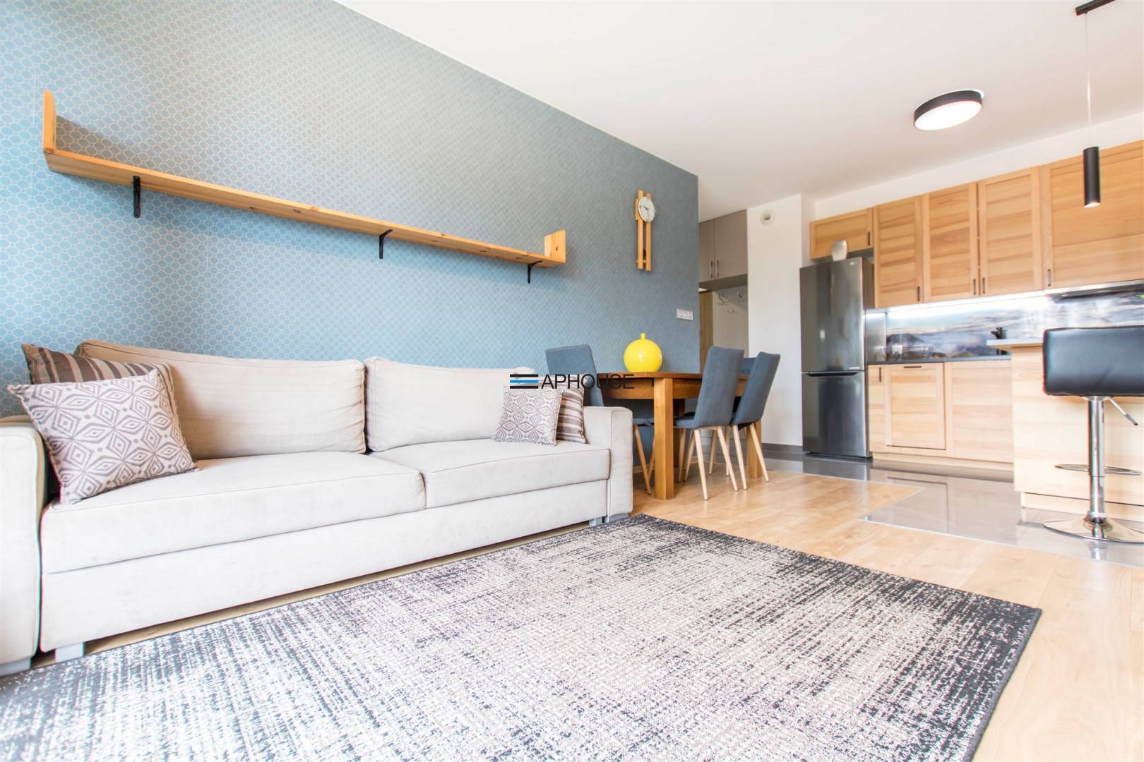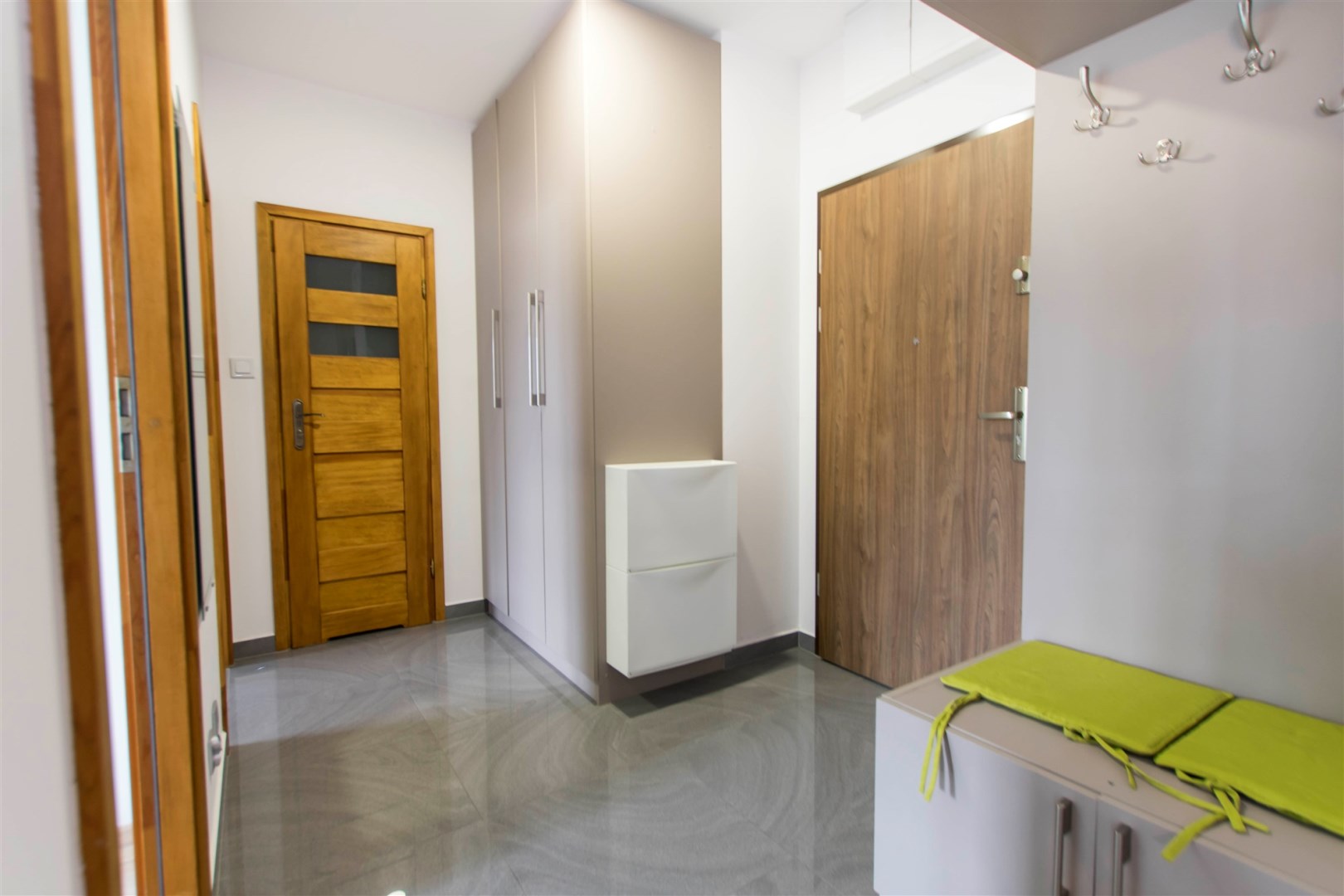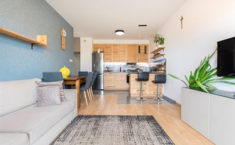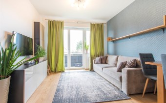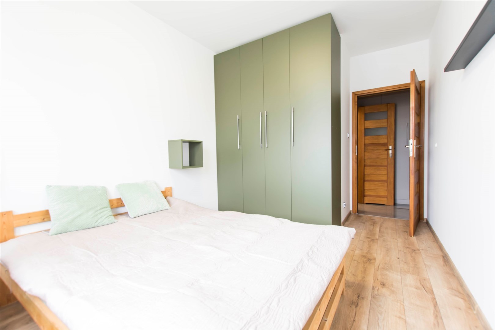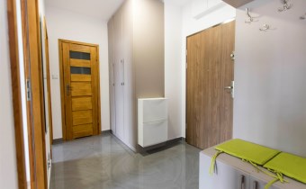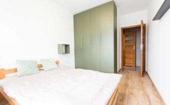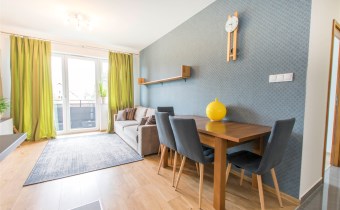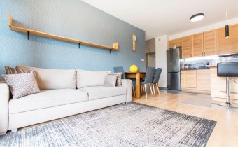 Salon wyposażony dużą sofę, zabudowę szaf oraz wyjście na balkon. Kuchnia wyposażona w zabudowę kuchenną z dużą ilością miejsca do przechowywania, sprzęty takie jak lodówko-zamrażarka, piekarnik, zmywarka, płyta indukcyjna, okap oraz stół z krzesłami. Całe pomieszczenie jasne i przestronne. Sypialnia wyposażona w duże 2-osobowe łóżko szafki nocne oraz szafę. Łazienka z wanną oraz szklana kabina prysznicowa wyposażona w umywalkę, duże lustro, szafki oraz WC. Pokój jest częściowo umeblowany - do własnej aranżacji lub możliwość doposażenia przez właścicieli w jedno lub dwa pojedyncze łóżka. W przedpokoju szafa oraz miejsce na kurtki oraz buty.