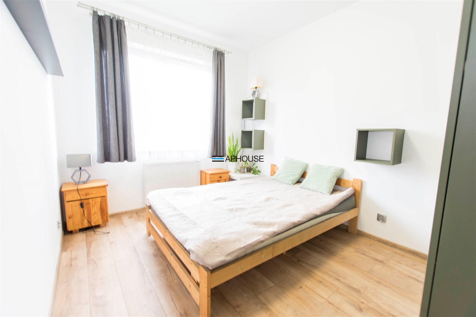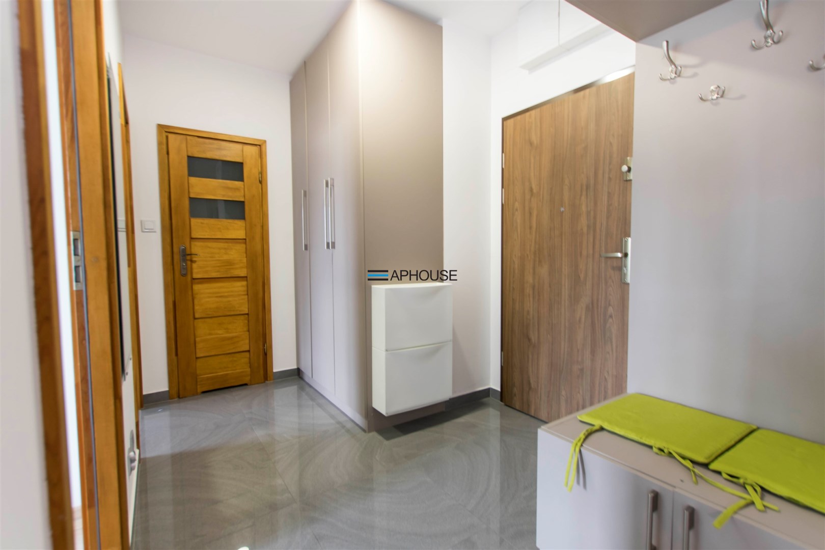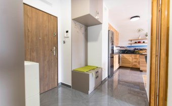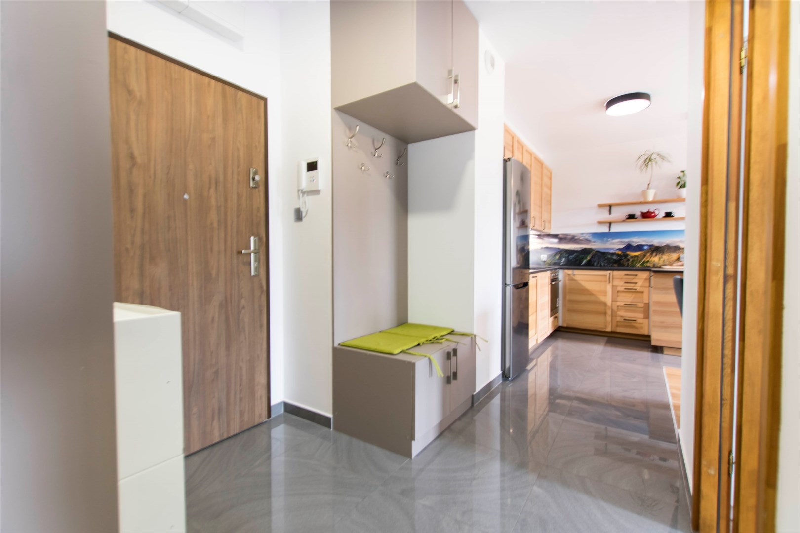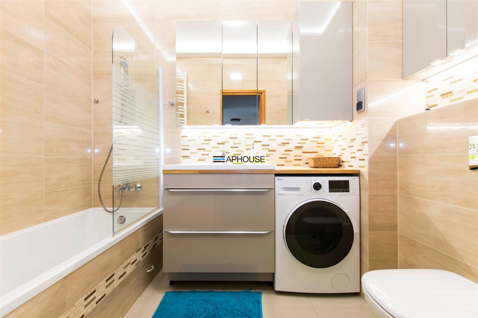 Salon wyposażony dużą sofę, zabudowę szaf oraz wyjście na balkon. Kuchnia wyposażona w zabudowę kuchenną z dużą ilością miejsca do przechowywania, sprzęty takie jak lodówko-zamrażarka, piekarnik, zmywarka, płyta indukcyjna, okap oraz stół z krzesłami. Całe pomieszczenie jasne i przestronne. Sypialnia wyposażona w duże 2-osobowe łóżko szafki nocne oraz szafę. Łazienka z wanną oraz szklana kabina prysznicowa wyposażona w umywalkę, duże lustro, szafki oraz WC. Pokój jest częściowo umeblowany - do własnej aranżacji lub możliwość doposażenia przez właścicieli w jedno lub dwa pojedyncze łóżka. W przedpokoju szafa oraz miejsce na kurtki oraz buty.