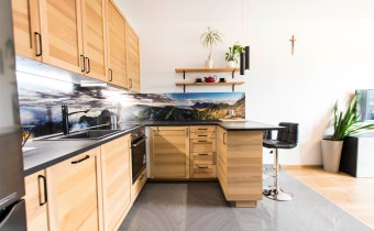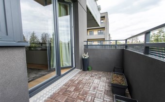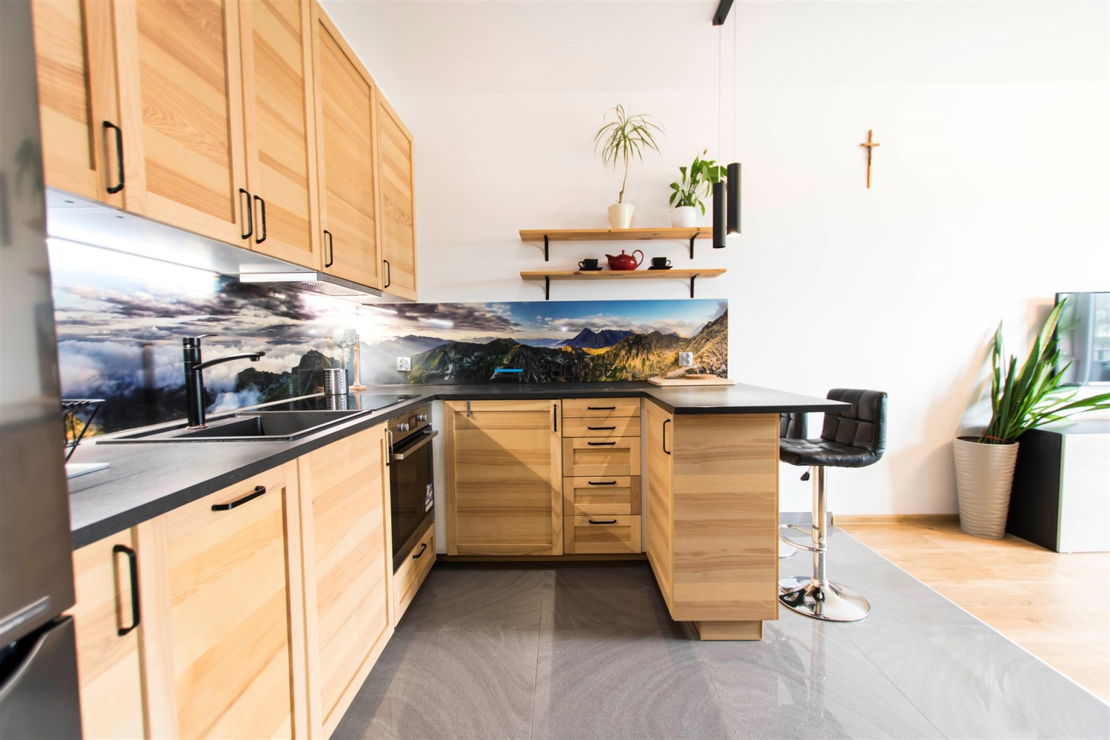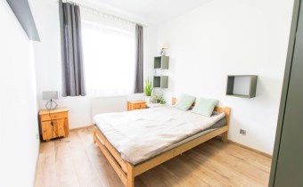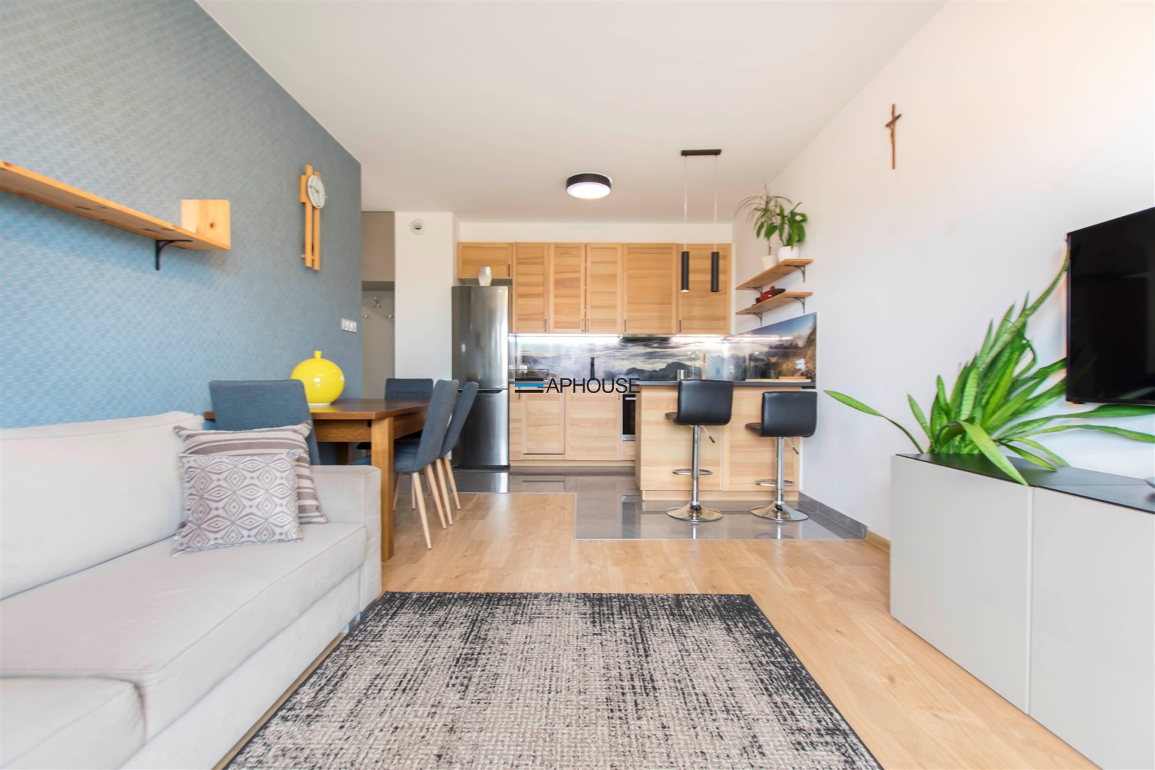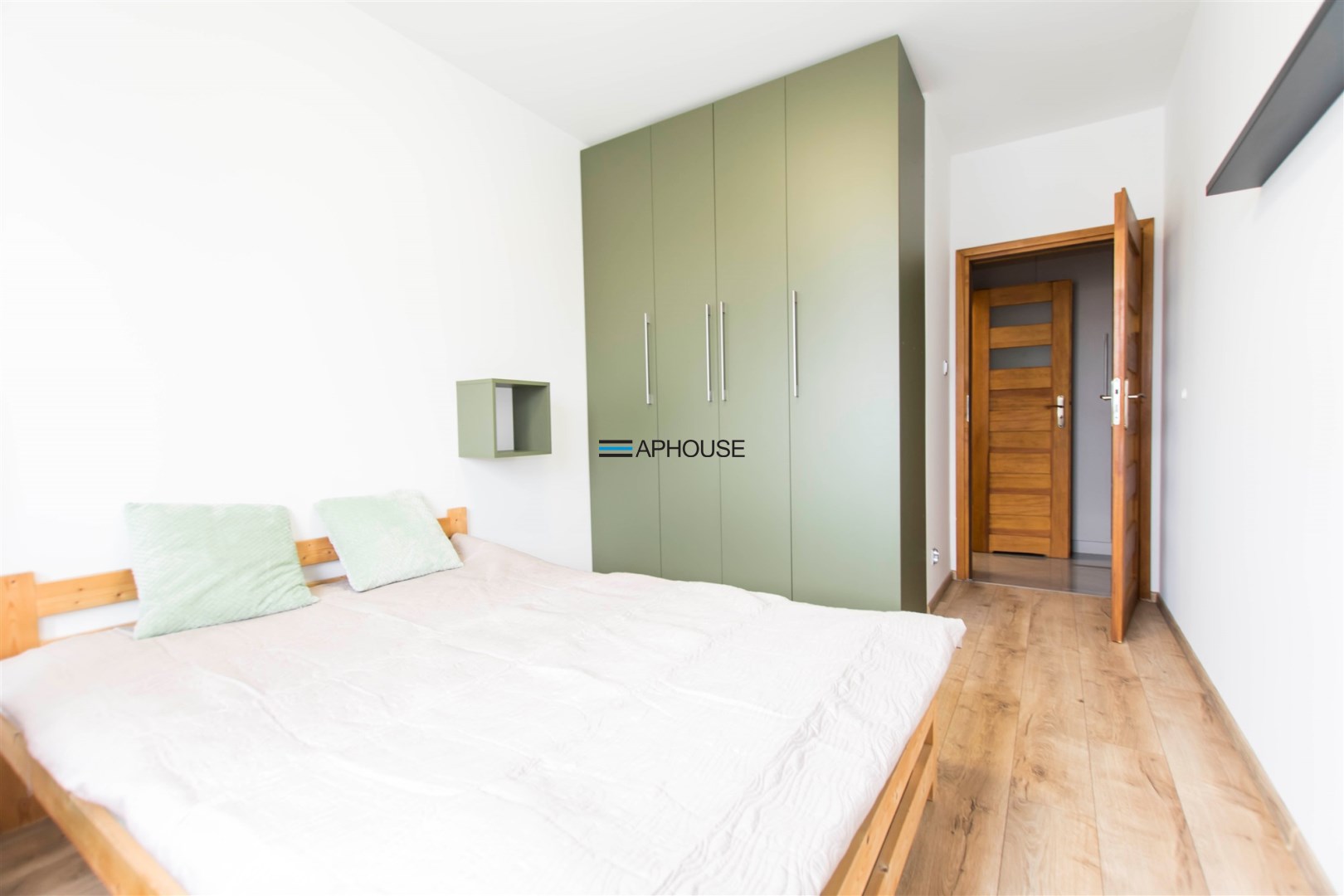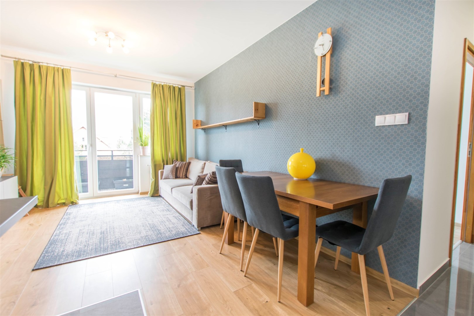 Salon wyposażony dużą sofę, zabudowę szaf oraz wyjście na balkon. Kuchnia wyposażona w zabudowę kuchenną z dużą ilością miejsca do przechowywania, sprzęty takie jak lodówko-zamrażarka, piekarnik, zmywarka, płyta indukcyjna, okap oraz stół z krzesłami. Całe pomieszczenie jasne i przestronne. Sypialnia wyposażona w duże 2-osobowe łóżko szafki nocne oraz szafę. Łazienka z wanną oraz szklana kabina prysznicowa wyposażona w umywalkę, duże lustro, szafki oraz WC. Pokój jest częściowo umeblowany - do własnej aranżacji lub możliwość doposażenia przez właścicieli w jedno lub dwa pojedyncze łóżka. W przedpokoju szafa oraz miejsce na kurtki oraz buty.