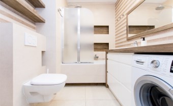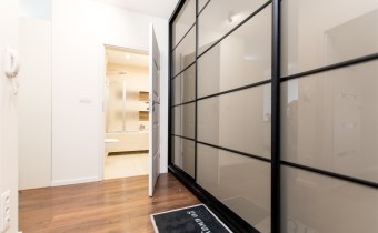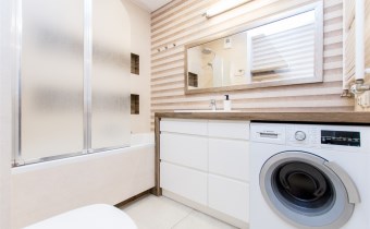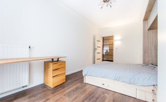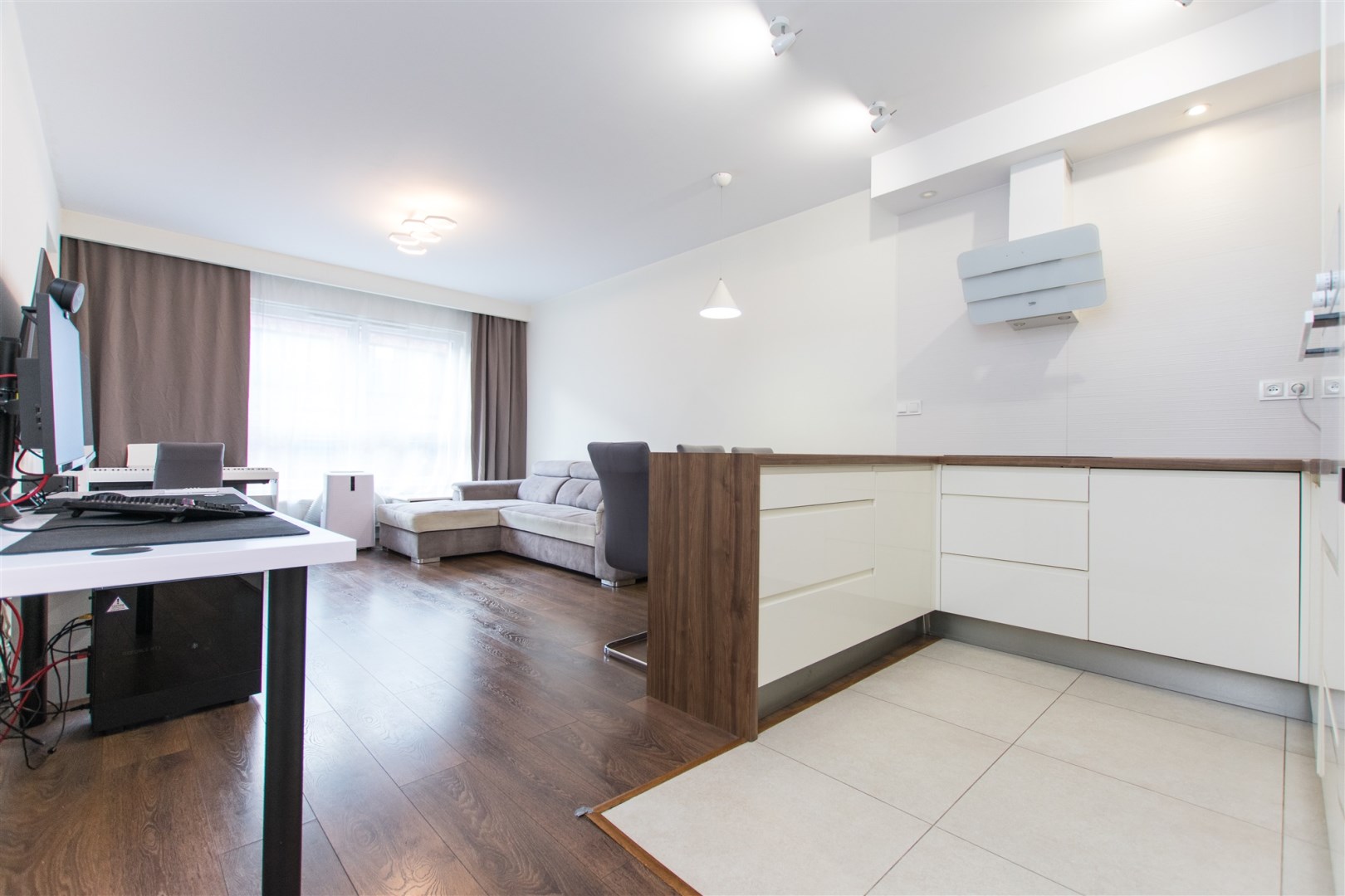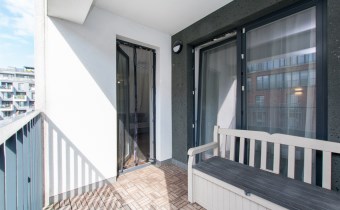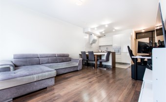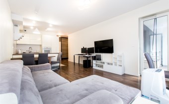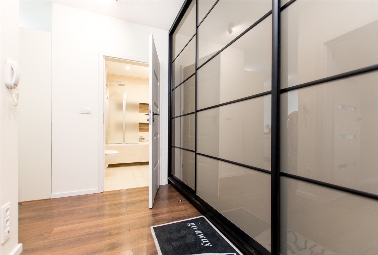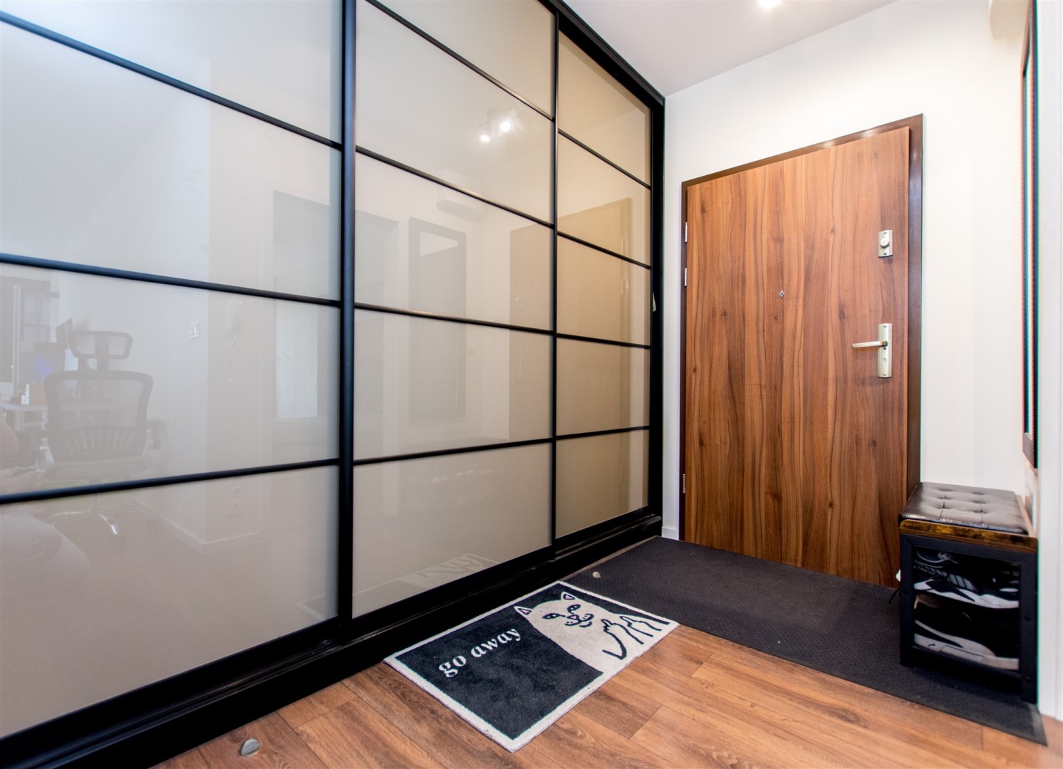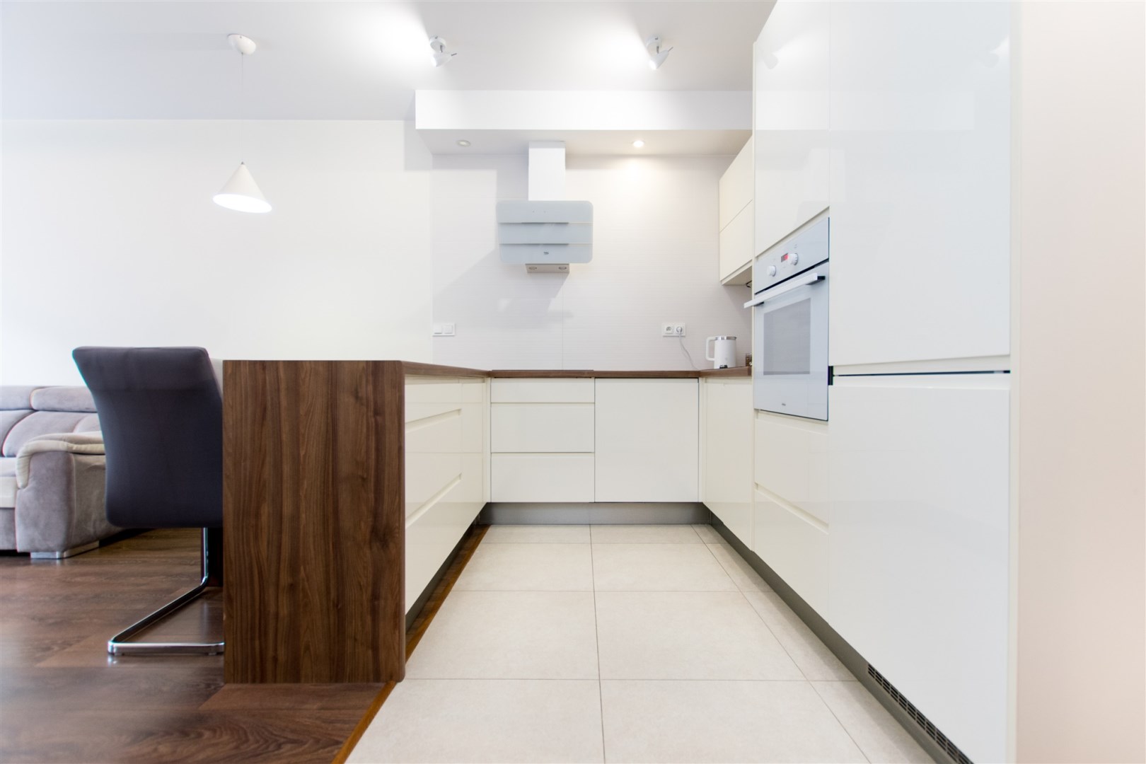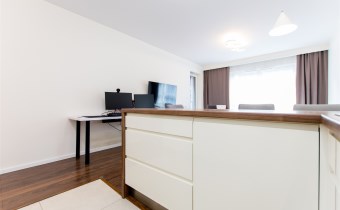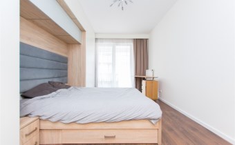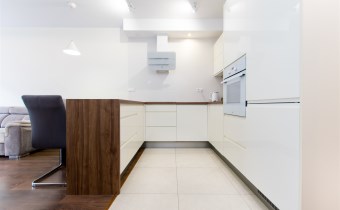 Wnętrze prezentowanej nieruchomości zostało zaprojektowane w sposób przemyślany, z dbałością o szczegóły. Aneks kuchenny został wyposażony w sprzęty wysokiej klasy: duża lodówka z zamrażarką, płyta grzewcza, piekarnik, mikrofala, zmywarka oraz okap. W sypialni łóżko dwuosobowe z materacem 160x200cm. Komfort użytkowania podnosi bardzo duża przestrzeń na przechowywanie.