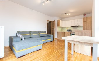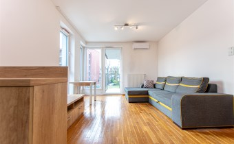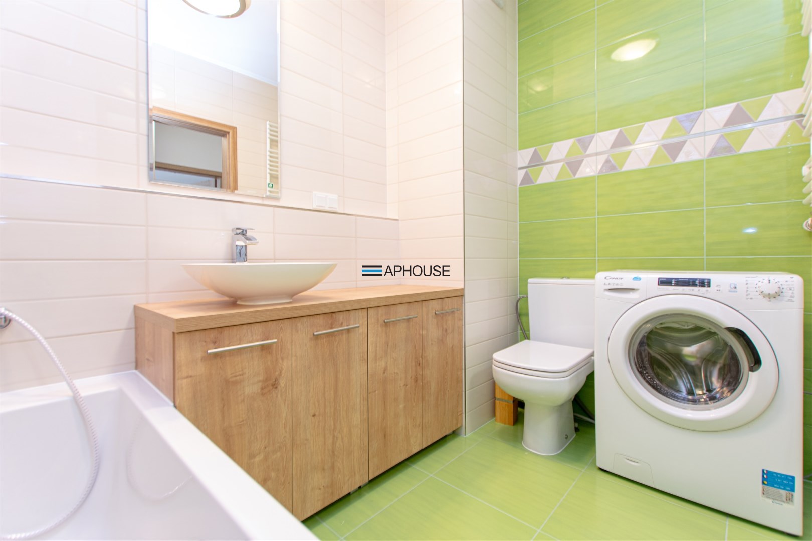 W wyposażeniu kuchennym jest lodówka, zamrażarka, zmywarka, piekarnik, okap, płyta oraz stół z krzesłami. Przedpokój jest wyposażony w pojemną szafę, łazienka z prysznicem. Duży balkon z dostępem z salonu i sypialni. Mieszkanie jest w pełni umeblowane i gotowe do zamieszkania. Nieruchomość jest wyposażona w żelazko, deskę do prasowania, suszarkę oraz meble balkonowe.