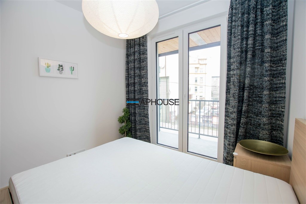 W sypialni znajduje się duża szafa w zabudowie oraz łóżko dwuosobowe. Z salonu oraz sypialni jest wyjście na duży balkon. W łazience znajduje się wanna z szybą prysznicową, umywalką, wc, pralką. W przepdokoju jest lustro i wieszak. Mieszkanie jest zaprojektowane bardzo funckjonalnie, idealne dla pary lub singla.