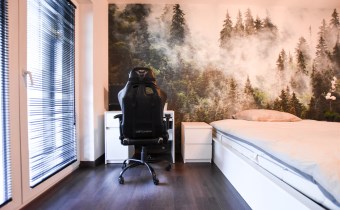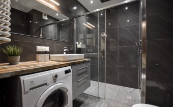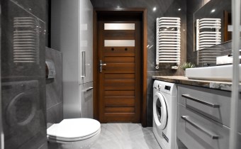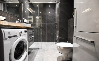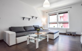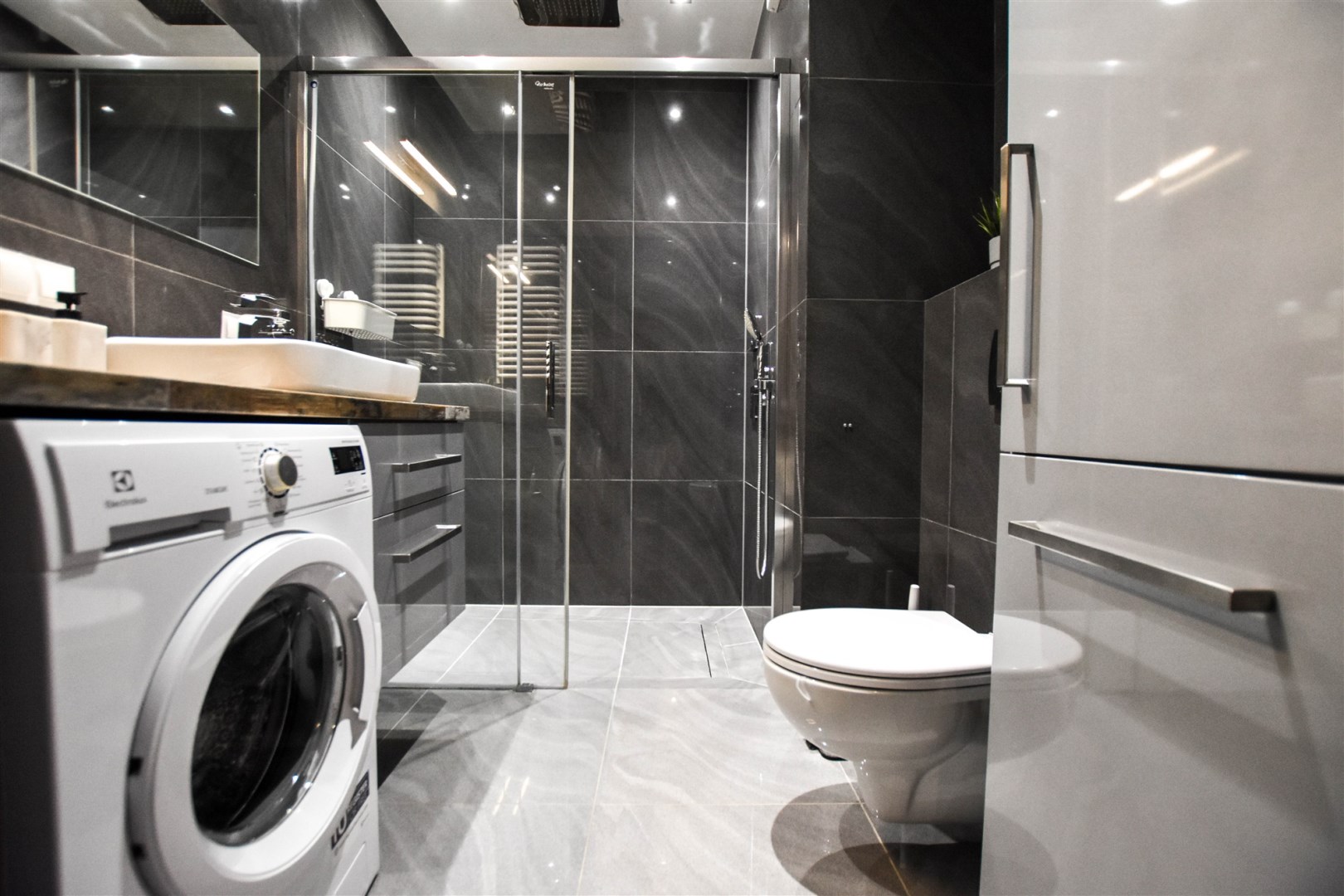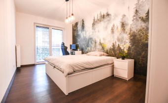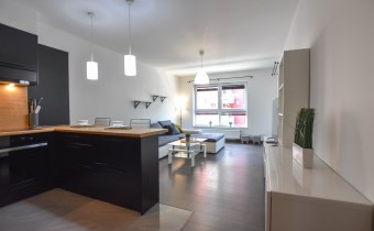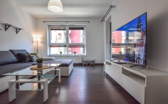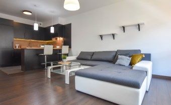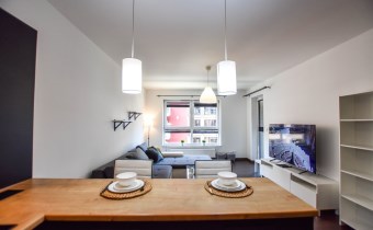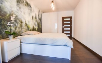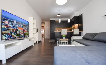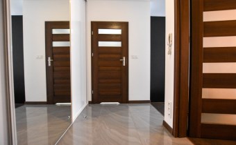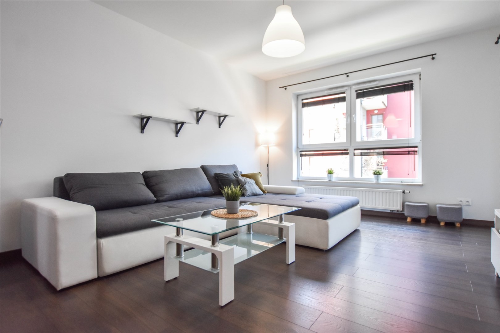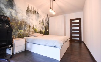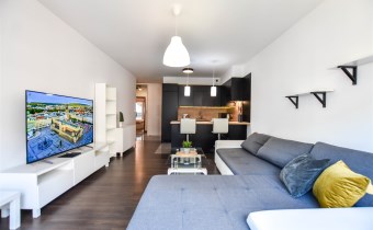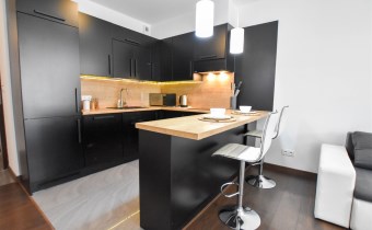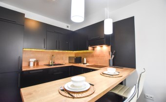 Salon jest wyposażony w duży narożnik z opcja rozłożenia oraz stolik, lampę, komodę oraz szafkę RTV z dużym Tv. W wyposażeniu kuchennym jest : lodówka, zamrażarka, piekarnik, okap, płyta oraz wyspa z hokerami jak i zabudową z dużą ilością szafek. Przestronny przedpokój jest wyposażony w bardzo dużą trzydrzwiową szafę z lustrzanymi drzwiami. Gustownie urządzona łazienka posiada umywalkę, prysznic z deszczownicą, pralkę, tv oraz zabudowę meblową z koszem na pranie. W sypialni znajduje się dwuosobowe łóżko z materacem, biurko z krzesłem do pracy, stoliki nocne oraz szafa. Zarówno z salonu jak i z sypialni jest wyjście na zabudowany balkon. Mieszkanie jest w pełni wyposażone i umeblowane, gotowe do zamieszkania.