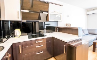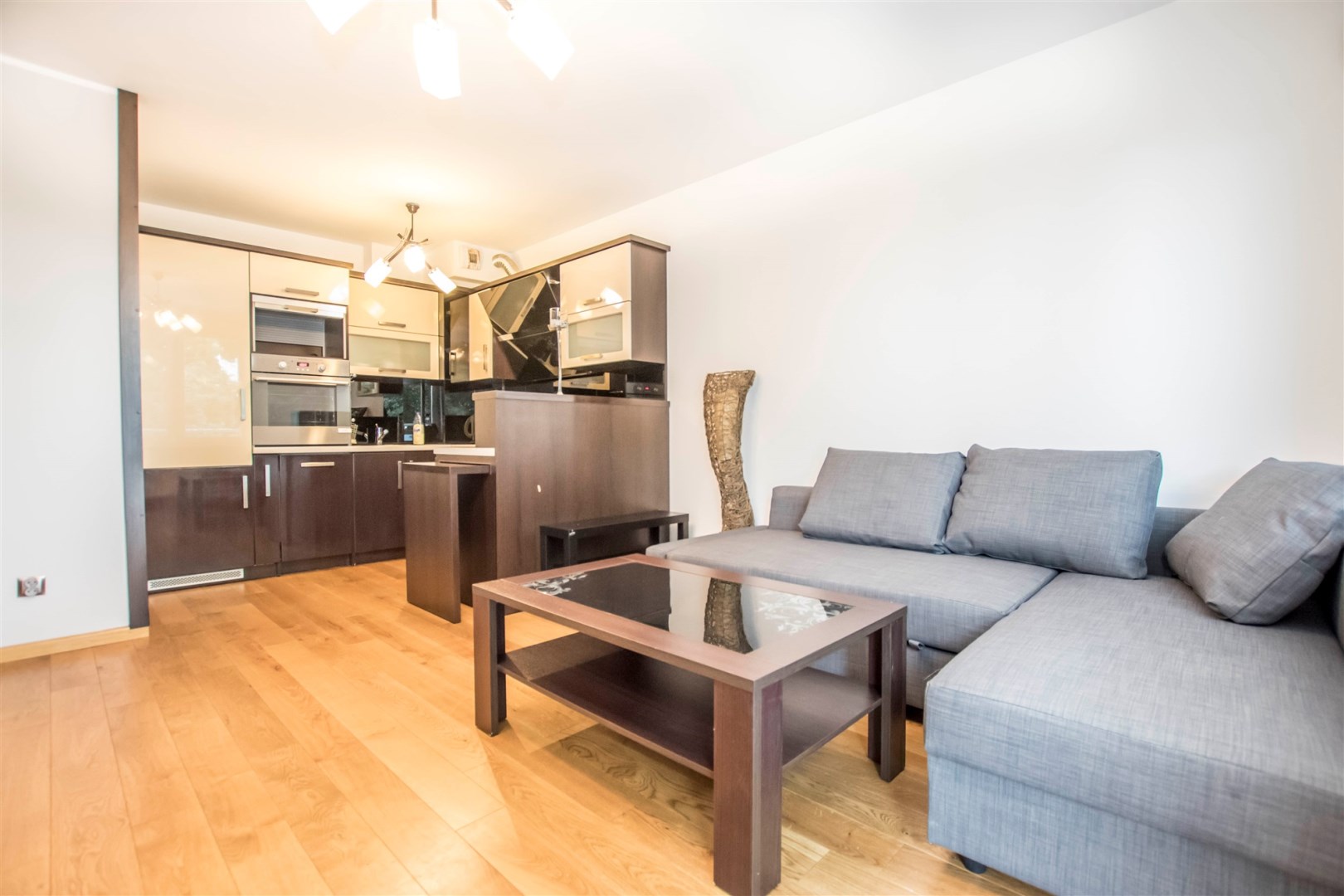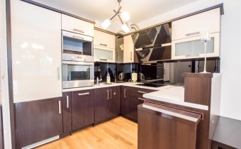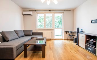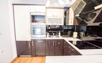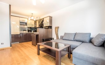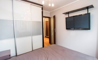 Mieszkanie jest zaprojektowane bardzo funkcjonalnie, bardzo przestronne. W salonie znajduje się sofa rozkładana, szafka rtv, stolik kawowy i telewizor. W sypialni jest łóżko dwuosobowe i jest bardzo duża szafa. Kuchnia jest w pełni wyposażona, znajduje się w niej lodówko-zamrażarka, zmywarka, piekarnik, płyta grzewcza, okap, zlew z baterią. Łazienka jest w pełni wyposażona. W jej skład wchodzi toaleta, prysznic, umywalka, pralka. W przedpokoju znajduje się szafa. Do mieszkania przynależy bardzo duży balkon z ekspozycją wschodnią.