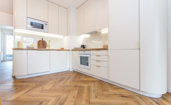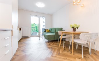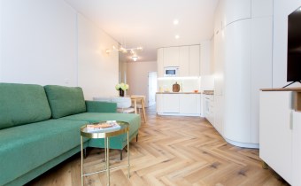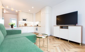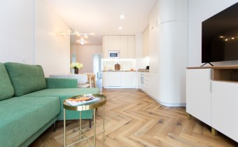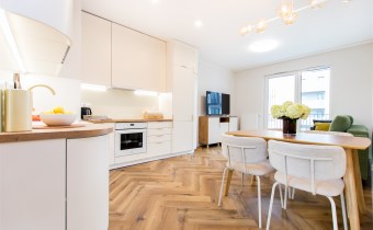 W pełni wyposażony aneks kuchenny obejmuje: dużą lodówkę z zamrażarką, płytę indukcyjną, piekarnik, zmywarkę oraz okap. W salonie rozkładana sofa z funkcją spania i TV oraz strefa jadalniana. Komfort użytkowania podnoszą dwie łazienki, pralko-suszarka oraz duża ilość miejsca na przechowywanie.
