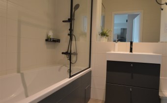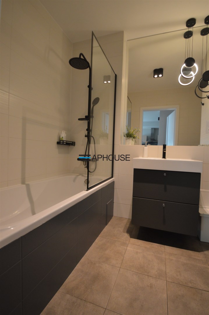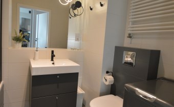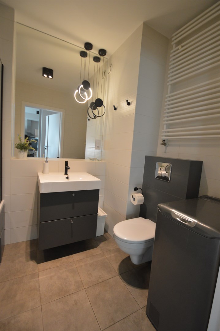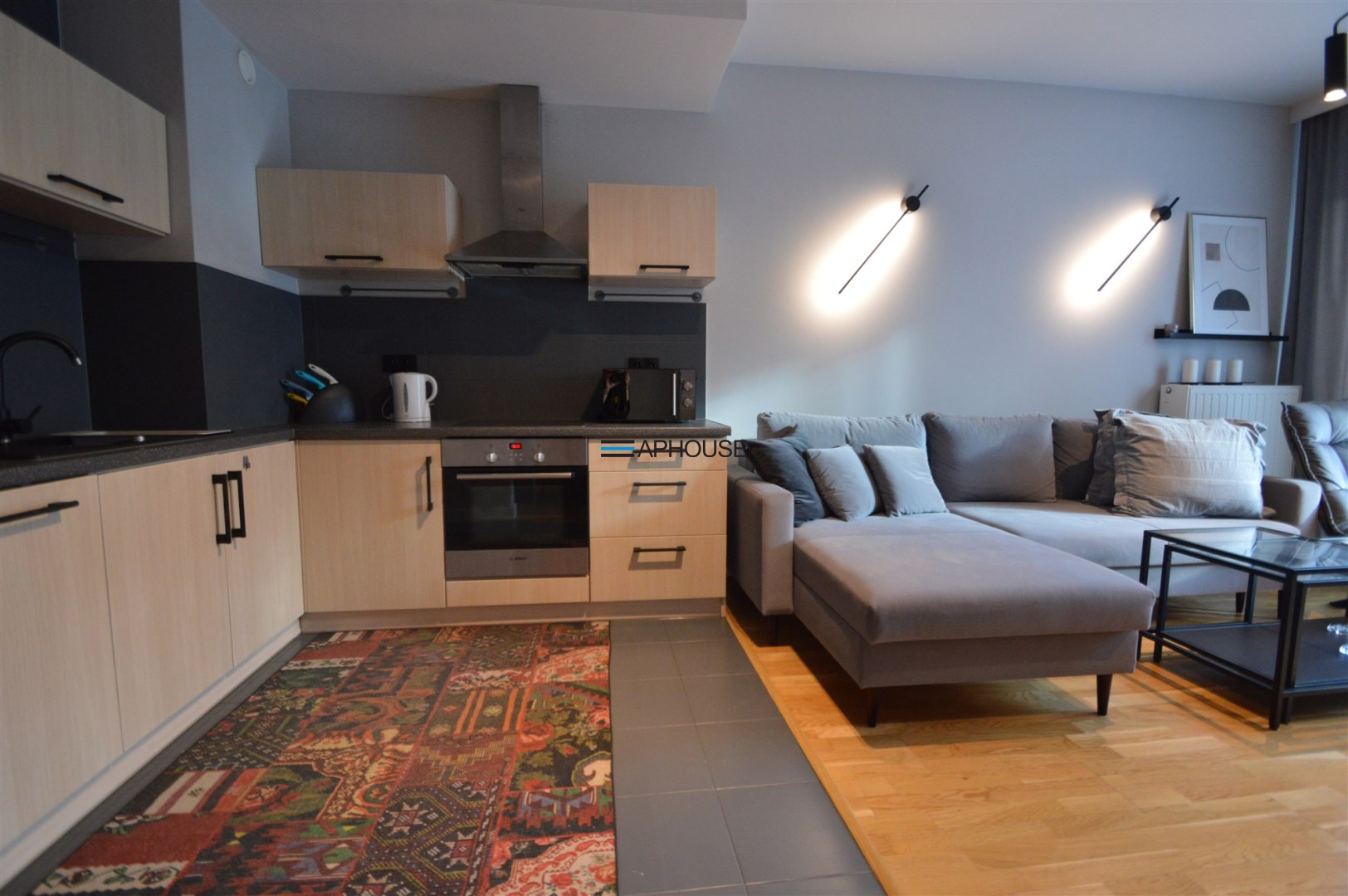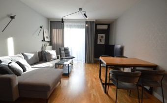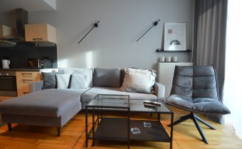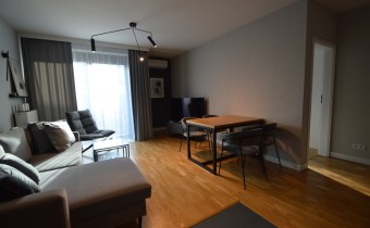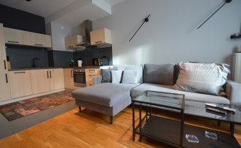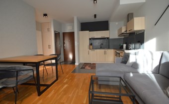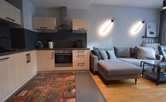 Mieszkanie w pełni umeblowane i wyposażone. Salon połączony z aneksem kuchennym. W salonie rozkładana sofa, stolik kawowy, TV. Aneks kuchenny w pełni wyposażony( lodówka z zamrażalnikiem, zmywarka, płyta grzewcza, piekarnik. Stół jadalniany z krzesłami. Łazienka z wanną. W sypialni podwójne łóżko i szafa. Dodatkowo do mieszkania przynależy balkon do którego jest wyjście zarówno z salonu jak i z sypialni.