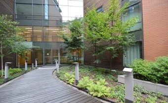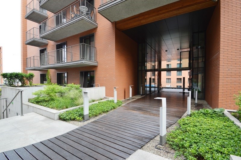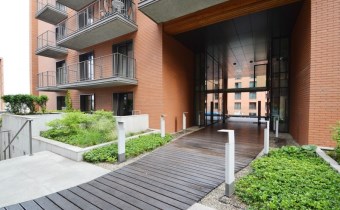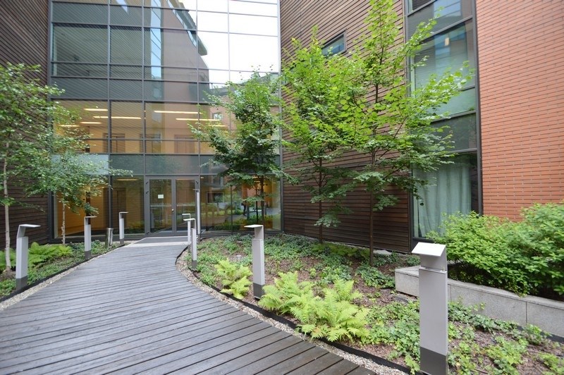 Wewnętrzne tereny w Angel City zaaranżowane małą architekturą i dużą ilością zieleni. Na terenie inwestycji znajduje się fitness PURE, banki oraz sklepy spożywcze.