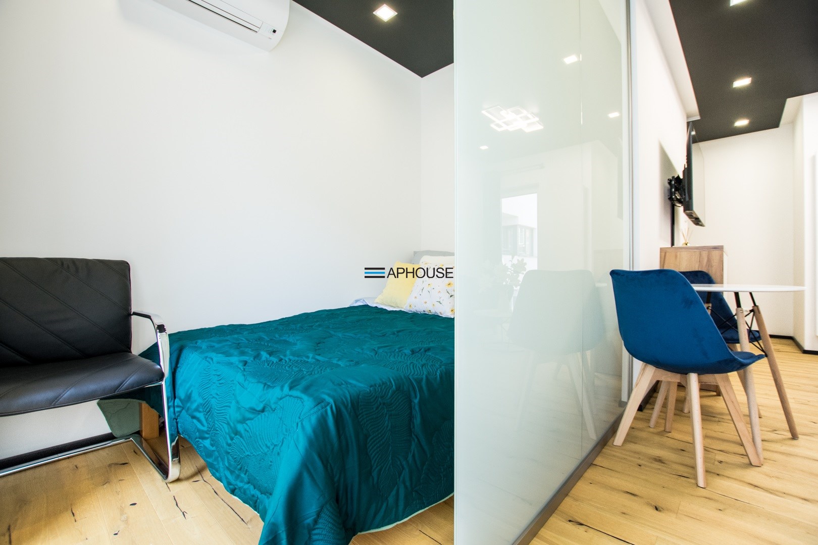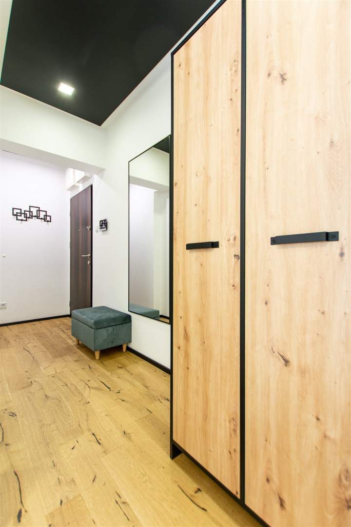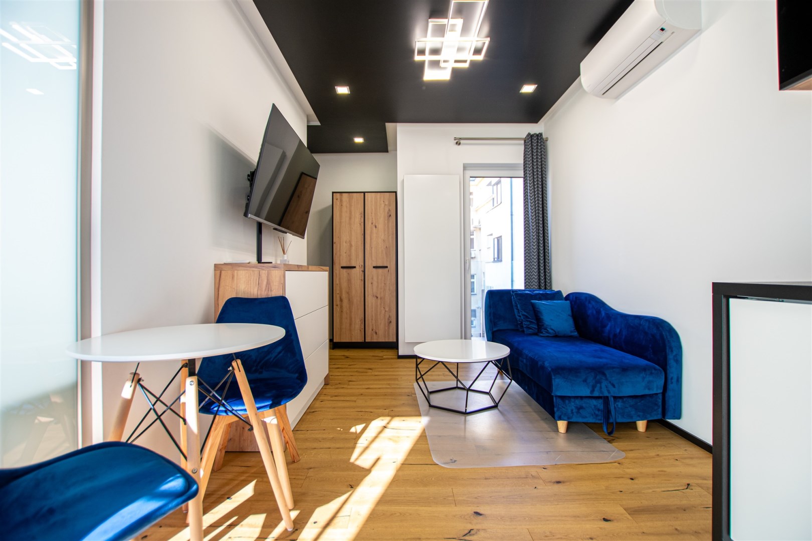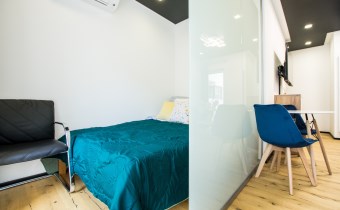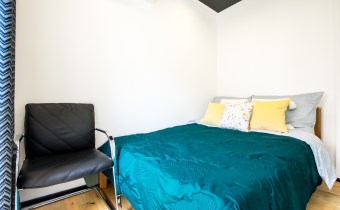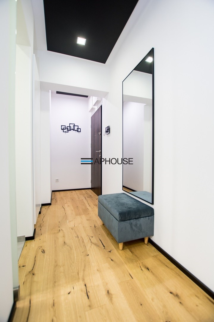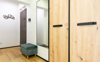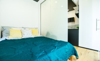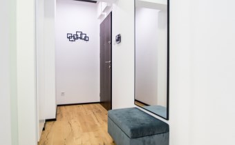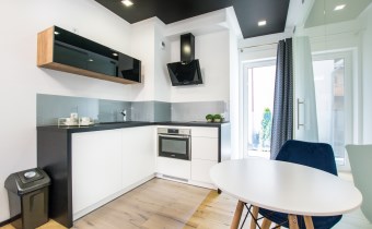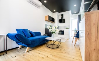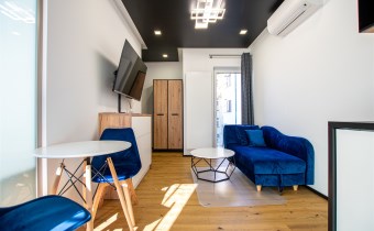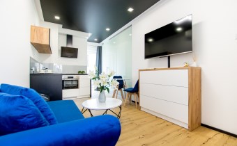 Jasny salon połączony z aneksem kuchennym, sofa, stolik kawowy, smart TV, stół z krzesłami. Kuchnia w pełni wyposażona (zmywarka, podblatowa lodówka z zamrażalnikiem, płyta indukcyjna, piekarnik z funkcją mikrofali, zastawa stołowa i przybory kuchenne). W sypialni dwuosobowe łóżko i fotel. Nowoczesna łazienka z prysznicem i pralką. Plusem są dwie jednostki klimatyzacji (w salonie i w sypialni) jak i wyposażenie dodatkowe (odkurzacz, żelazko, deska do prasowania, suszarka stojąca, pościel).