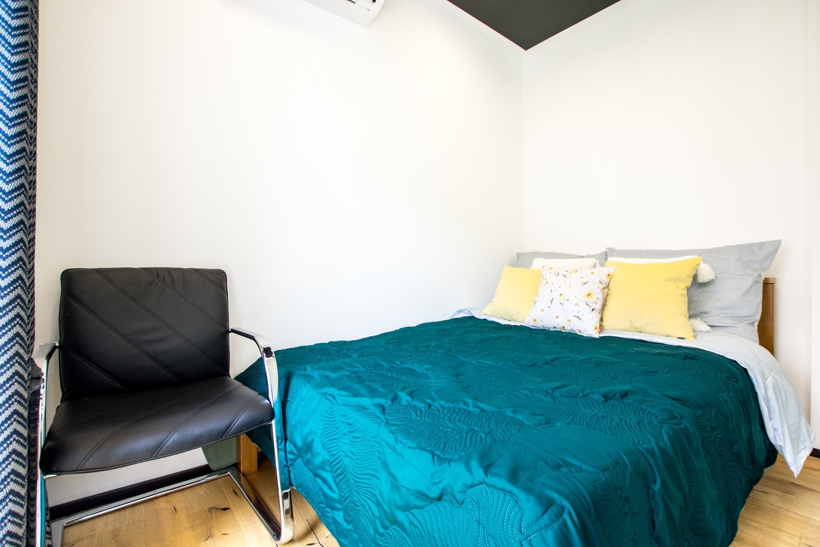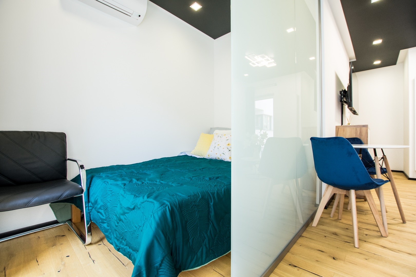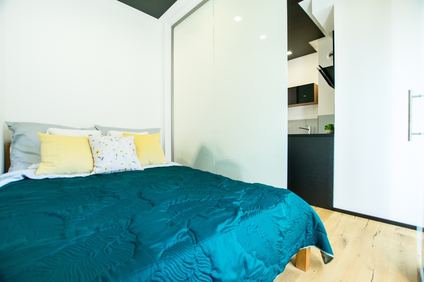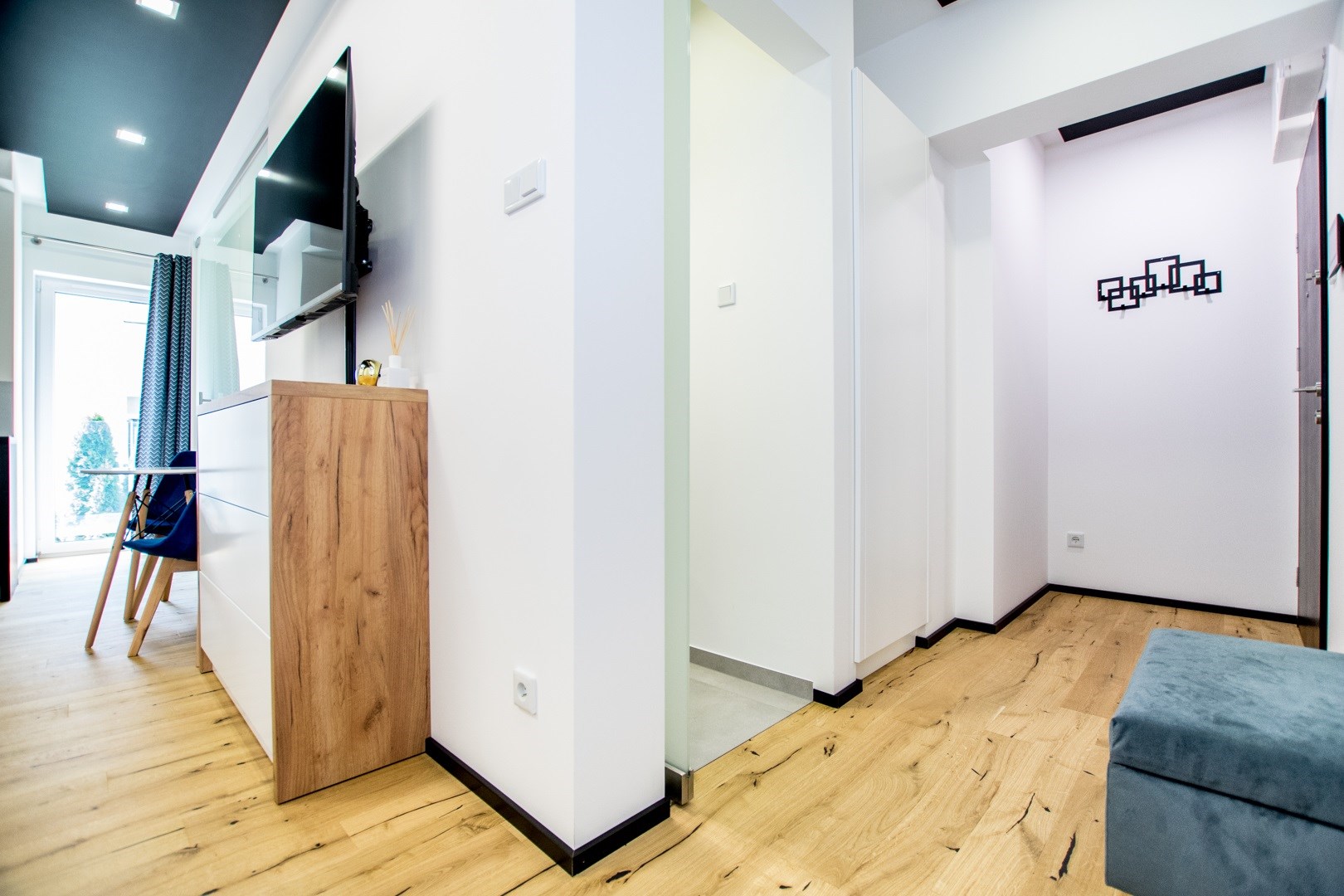 Jasny salon połączony z aneksem kuchennym, sofa, stolik kawowy, smart TV, stół z krzesłami. Kuchnia w pełni wyposażona (zmywarka, podblatowa lodówka z zamrażalnikiem, płyta indukcyjna, piekarnik z funkcją mikrofali, zastawa stołowa i przybory kuchenne). W sypialni dwuosobowe łóżko i fotel. Nowoczesna łazienka z prysznicem i pralką. Plusem są dwie jednostki klimatyzacji (w salonie i w sypialni) jak i wyposażenie dodatkowe (odkurzacz, żelazko, deska do prasowania, suszarka stojąca, pościel).