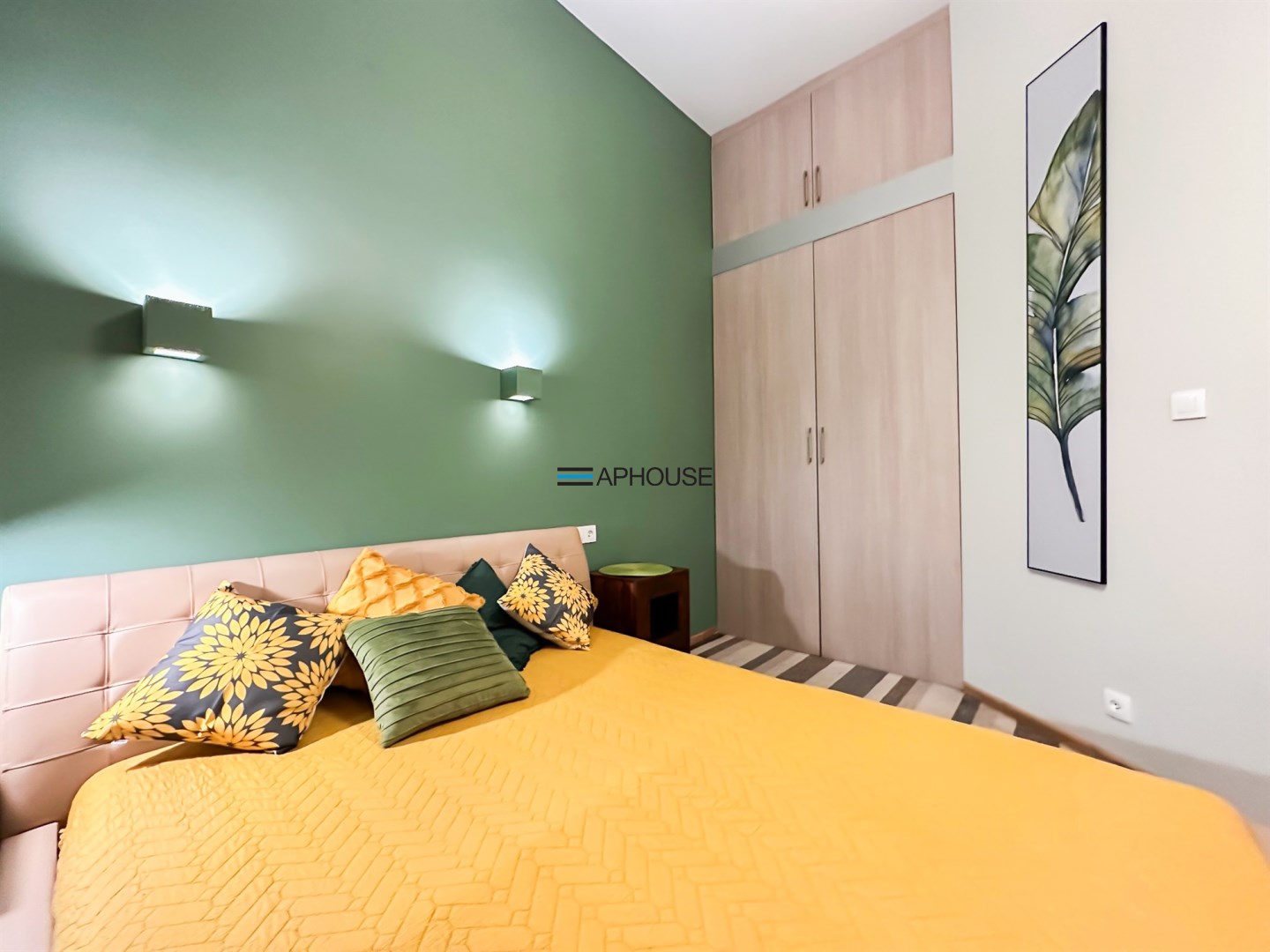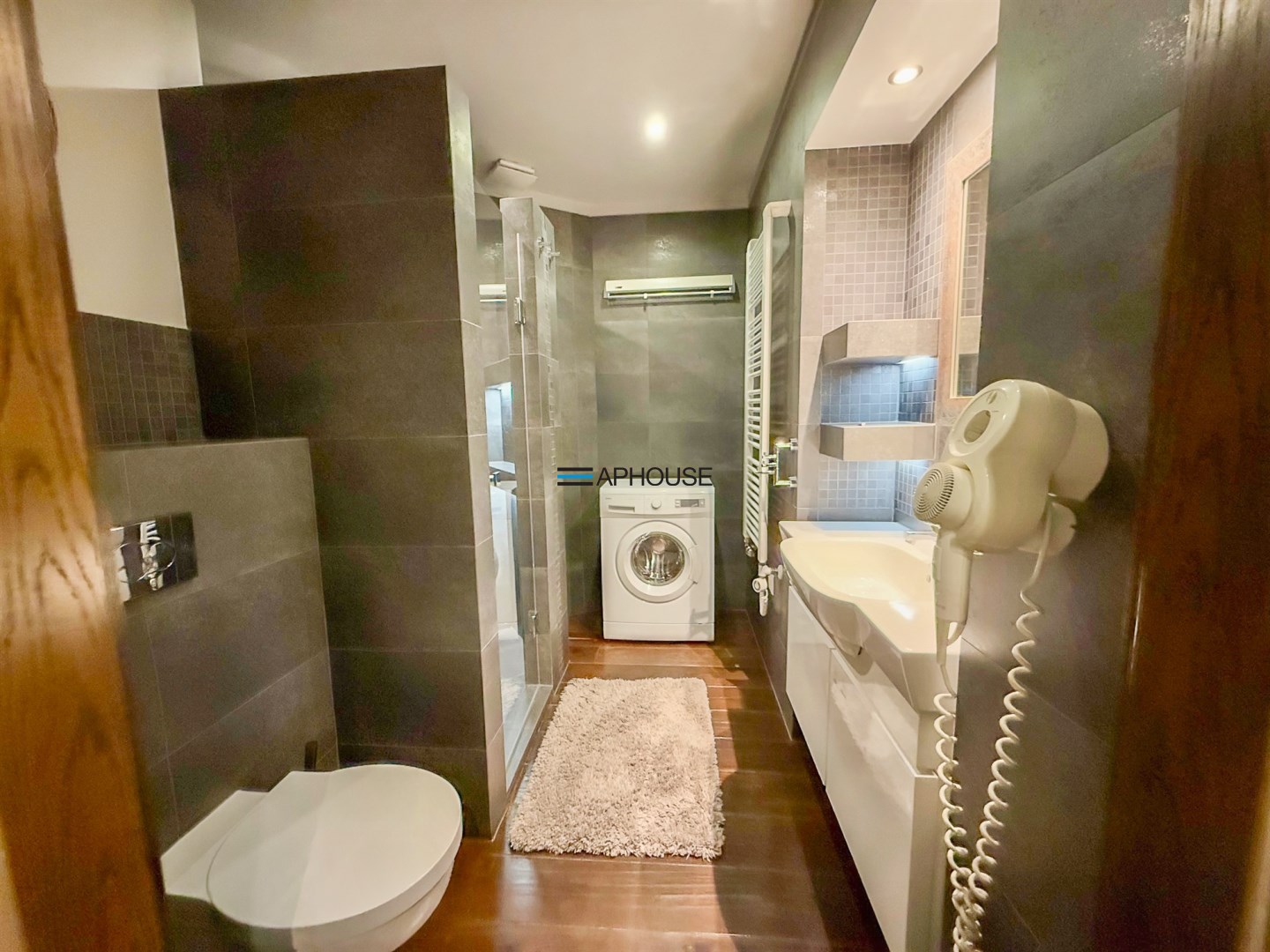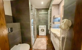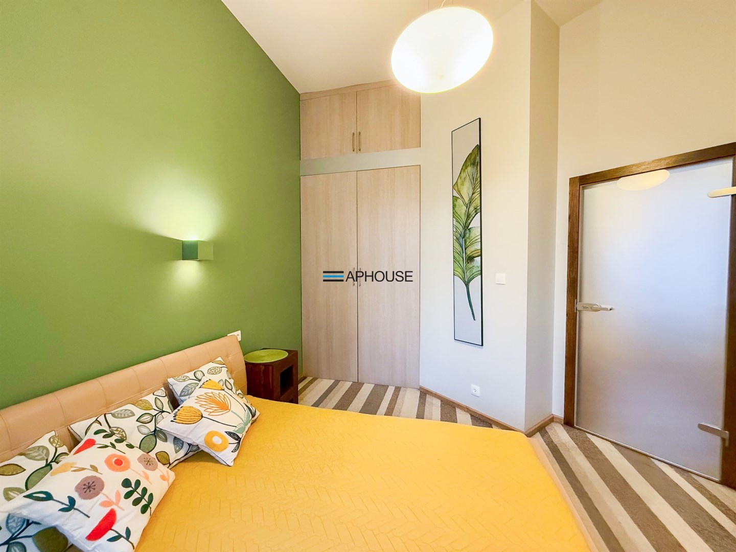 Nowoczesna zabudowa kuchenna oraz pełne wyposażenie AGD: duża lodówka z zamrażarką, zmywarka, piekarnik, kuchenka mikrofalowa, płyta indukcyjna, a także komplet drobnego wyposażenia (garnki, sztućce, naczynia, szkło). W salonie rozkładana sofa, stolik kawowy, okrągły stół z 4 krzesłami, telewizor, szafka RTV, dywan oraz stylowe oświetlenie (lampa sufitowa, kinkiety, lampa podłogowa). Okna wyposażone w firany i zasłony. W sypialni podwójne łóżko, pojemna szafa w zabudowie, stoliki nocne, klimatyczne oświetlenie, wykładzina podłogowa oraz firany i zasłony. Łazienka z prysznic, WC, umywalka z szafką, pralka, suszarka na pranie oraz suszarka do włosów.