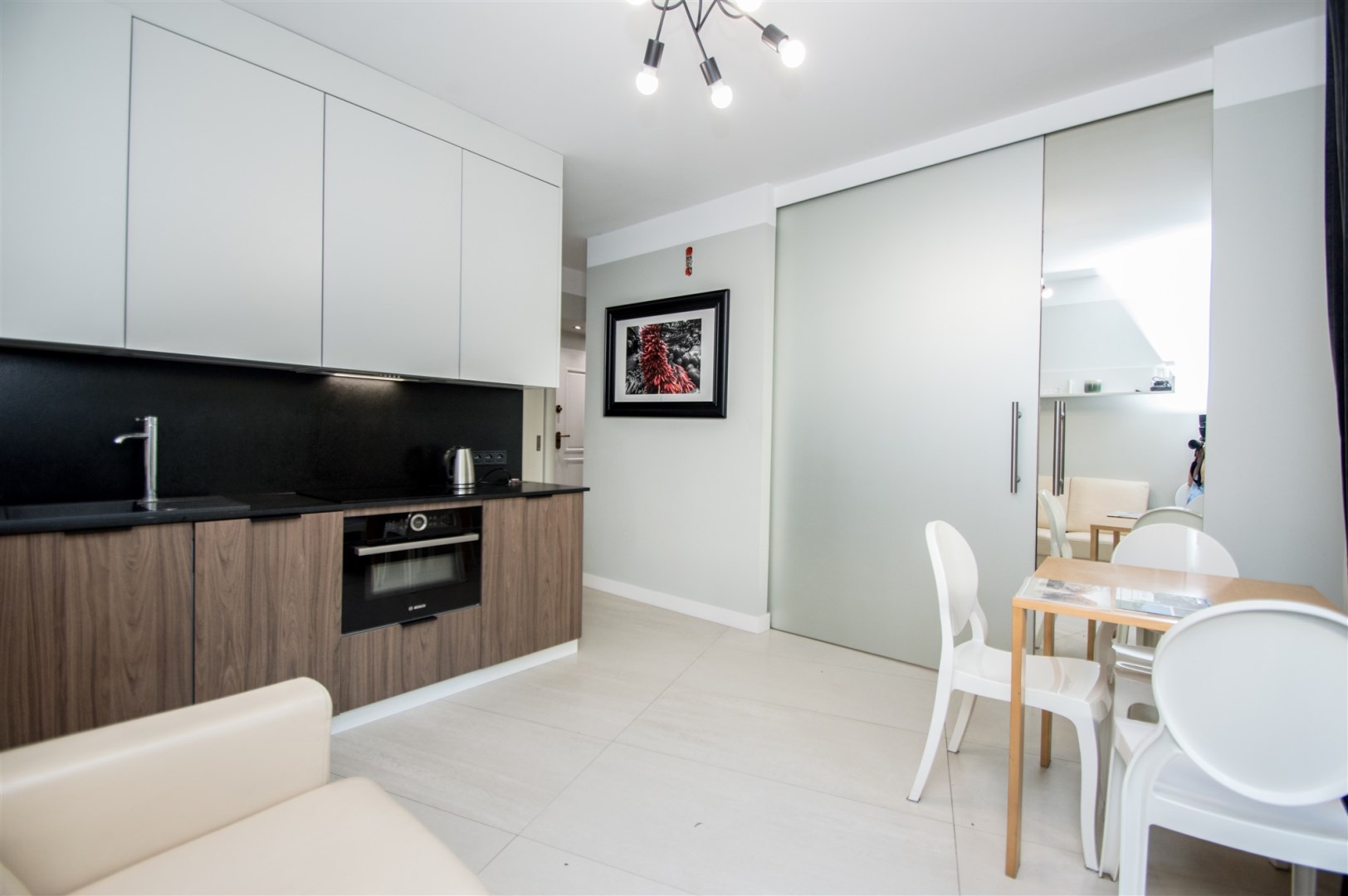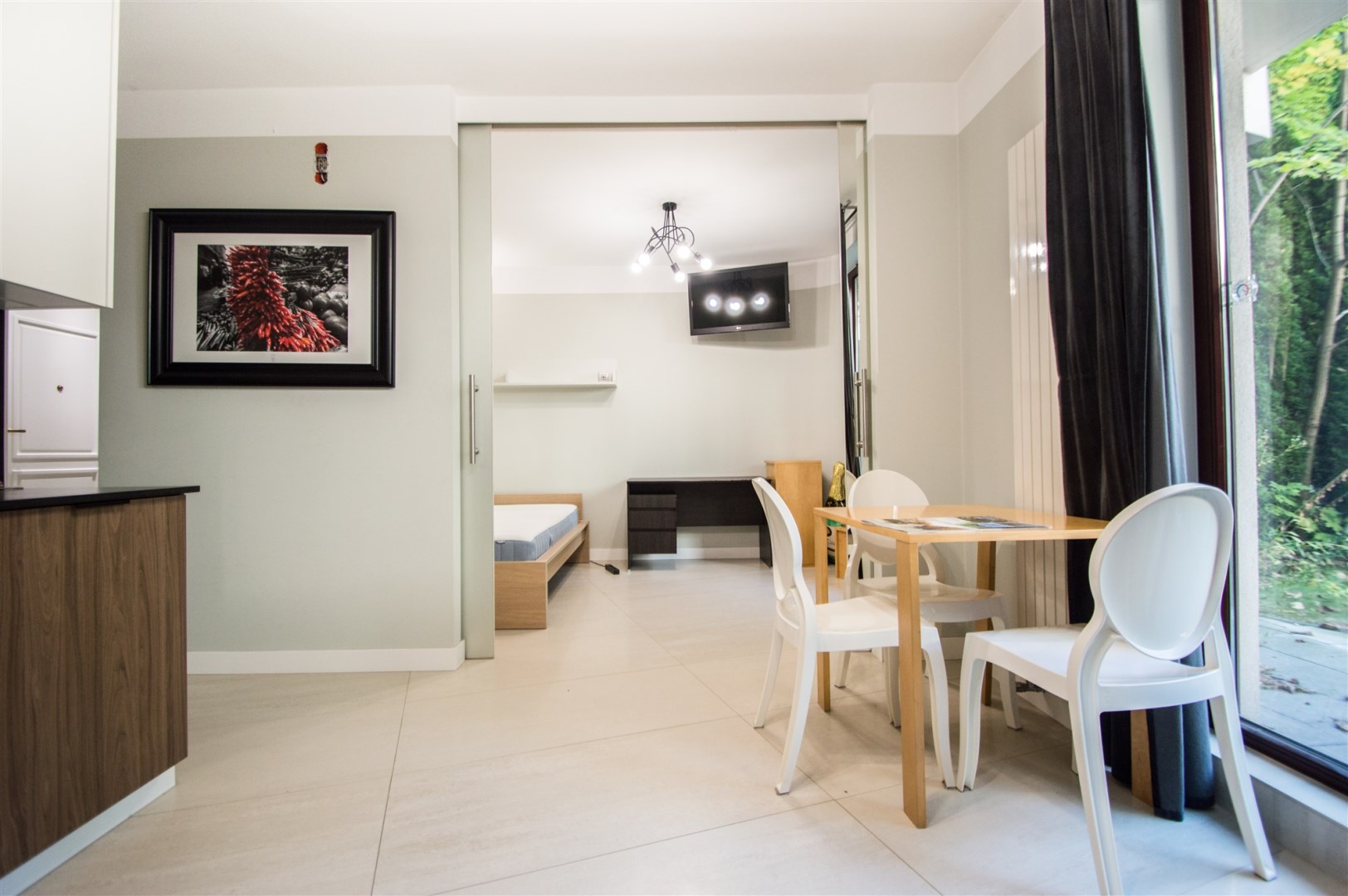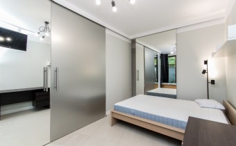 Istnieje możliwość powiększenia salonu o część sypialnianą poprzez otwarcie dużych przesuwnych drzwi.