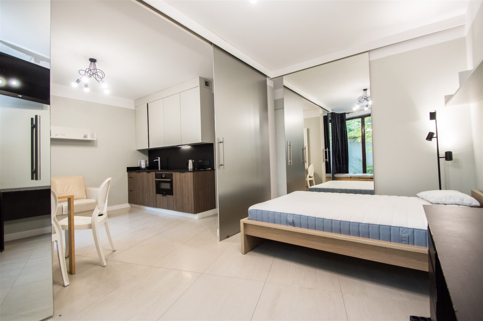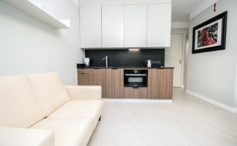 W pełni umeblowany i wyposażony w wysokiej klasy sprzęt i meble apartament. Nowoczesny salon z sofą, stołem z krzesłami, połączony z aneksem kuchennym i częścią jadalnianą. Kuchnia wyposażona w sprzęt AGD tj. płyta indukcyjna, piekarnik, lodówka z zamrażalnikiem, oraz wyposażenie drobne jak sztućce, garnki itp. W sypialni podwójne łóżko, sofę, TV,. W łazience kabina prysznicowa, pralka, umywalka i toaleta. Mieszkanie w pełni umeblowane wyposażone i gotowe do zamieszkania.