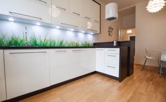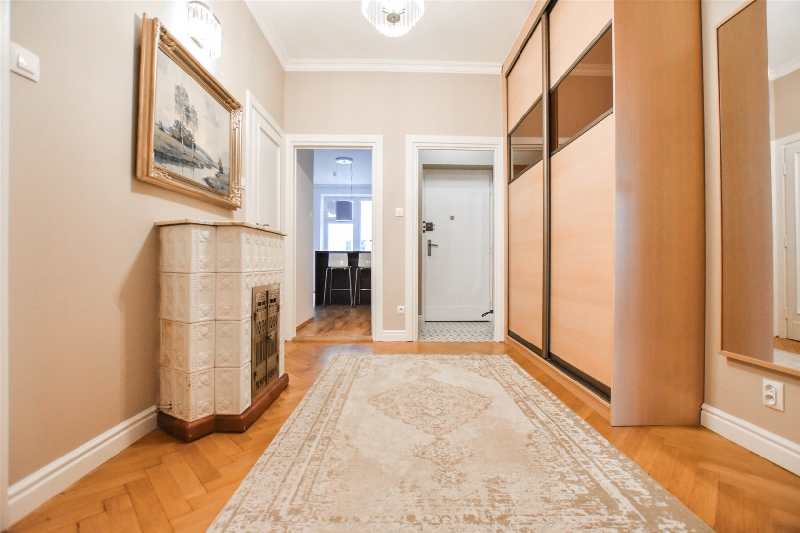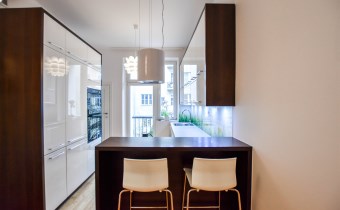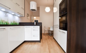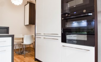 Nieruchomość wykończona przy użyciu wysokiej jakości materiałów takich jak gres czy naturalne drewno (jodełka francuska na podłogach), białe meble lakierowane na wymiar. Na wyposażenie kuchni składają się: płyta, piekarnik, mikrofala, lodówko-zamrażarka, zmywarka, kawiarka. Funkcjonalna łazienka z wanną i pralką. Oddzielna toaleta. Możliwe zaaranżowanie dwóch miejsc do pracy w domu. Sporo miejsca na przechowywanie dzięki licznym szafom w zabudowie. Dodatkowym atutem jest duża piwnica o powierzchni 8m2.
