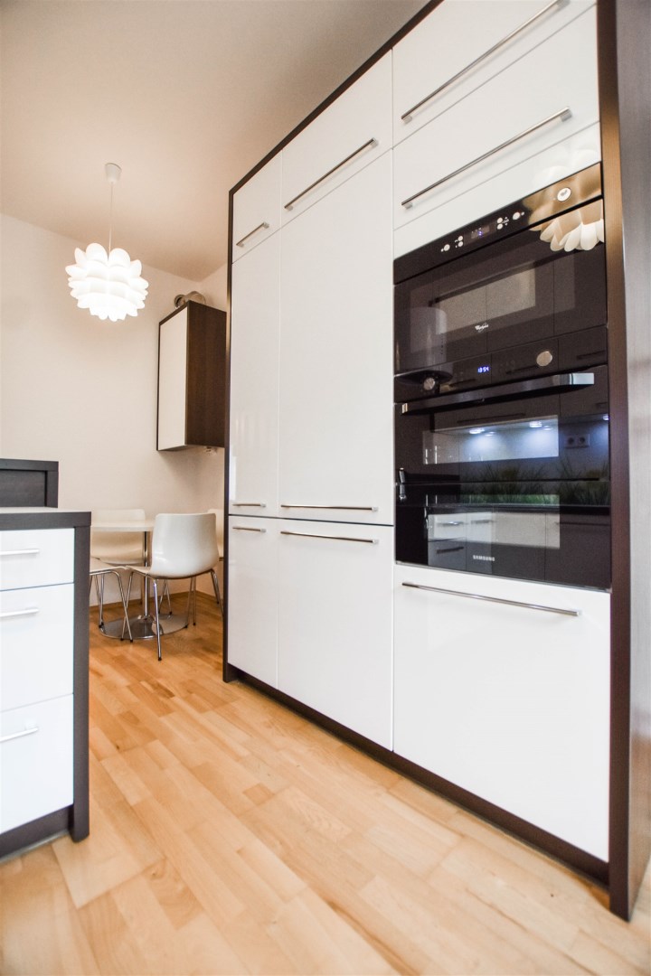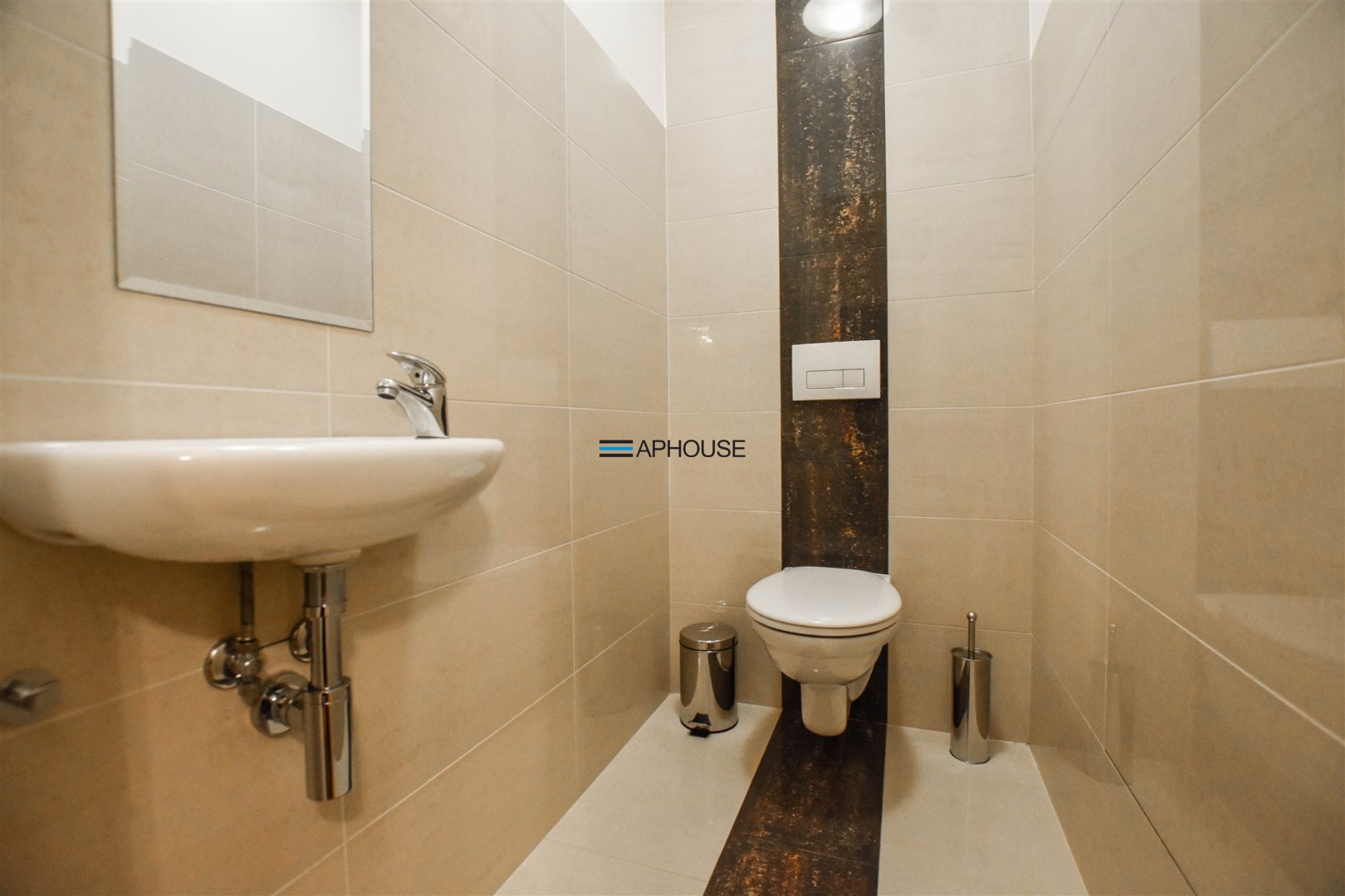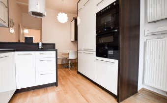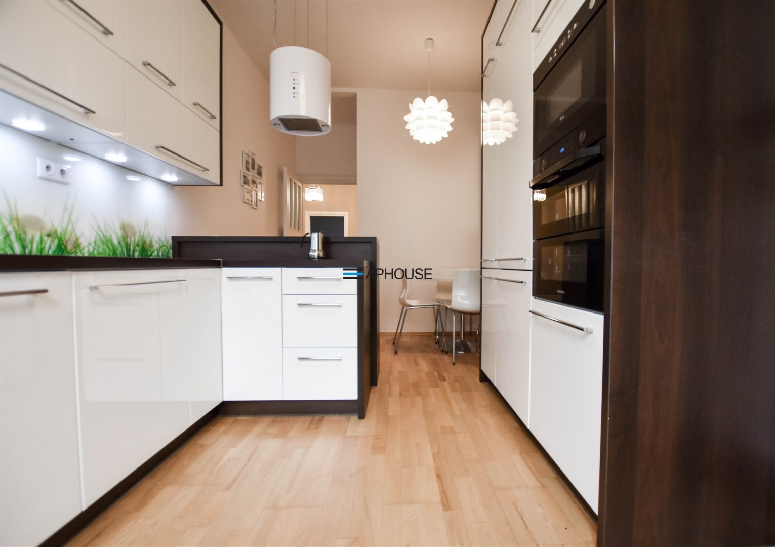 Nieruchomość wykończona przy użyciu wysokiej jakości materiałów takich jak gres czy naturalne drewno (jodełka francuska na podłogach), białe meble lakierowane na wymiar. Na wyposażenie kuchni składają się: płyta, piekarnik, mikrofala, lodówko-zamrażarka, zmywarka, kawiarka. Funkcjonalna łazienka z wanną i pralką. Oddzielna toaleta. Możliwe zaaranżowanie dwóch miejsc do pracy w domu. Sporo miejsca na przechowywanie dzięki licznym szafom w zabudowie. Dodatkowym atutem jest duża piwnica o powierzchni 8m2.