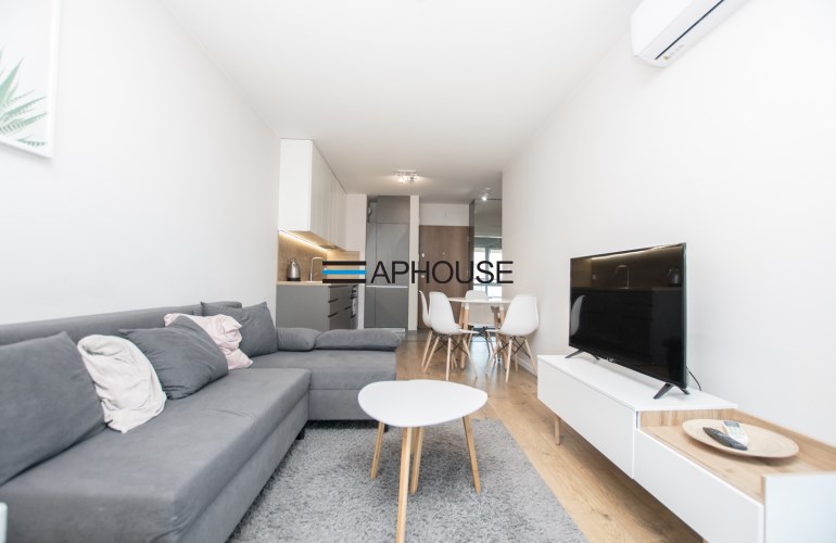 The living room has a sofa, TV and TV cabinet, coffee tables, desk / dressing table, table and 4 chairs. The kitchenette is fully equipped with appliances such as: dishwasher, induction hob, fridge with freezer and kettle. The modern bathroom is equipped with a new washing machine and a bathtub with a screen. The bedroom has a large double bed, a built-in wardrobe and a bedside table. In the hall there is a spacious wardrobe with mirrors. A significant advantage of the property is air conditioning.
